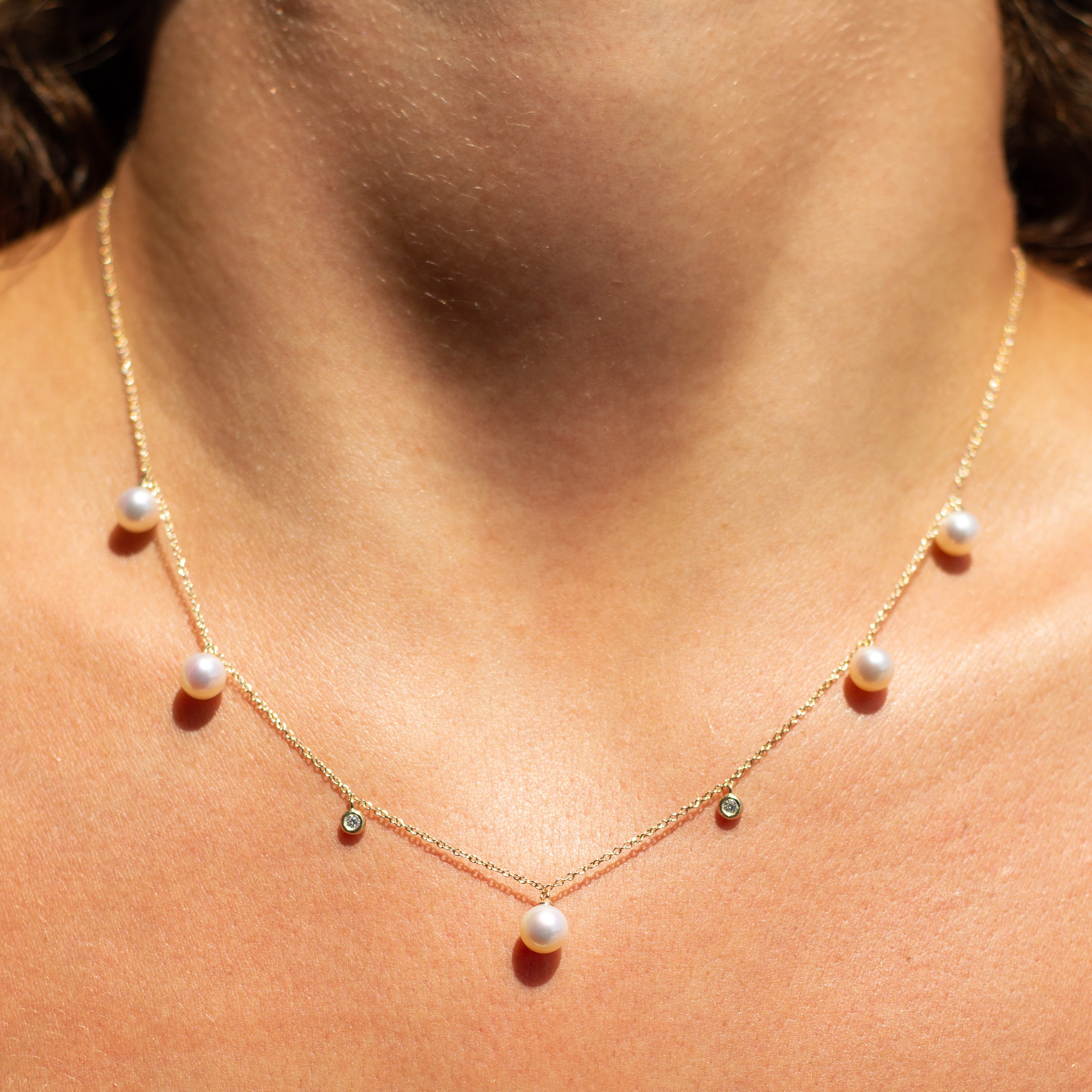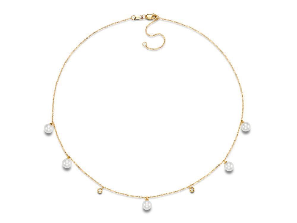 Product Description Beautiful and elegant, this station necklace features five freshwater pearls and two round brilliant cut diamonds totaling 0.06 carats. Other Details Necklace Type: Fashion Pendant Type: Gemstone Total Setting Diamond Carat Weight: 0.1TW Length: 18 IN Disable Reason: None Gemstone Type: Pearl Type: Necklace Style: Contemporary Metal Color: Yellow Gold