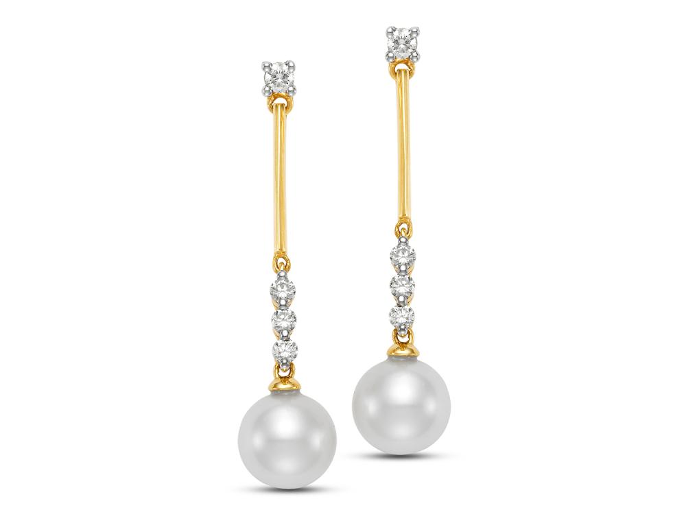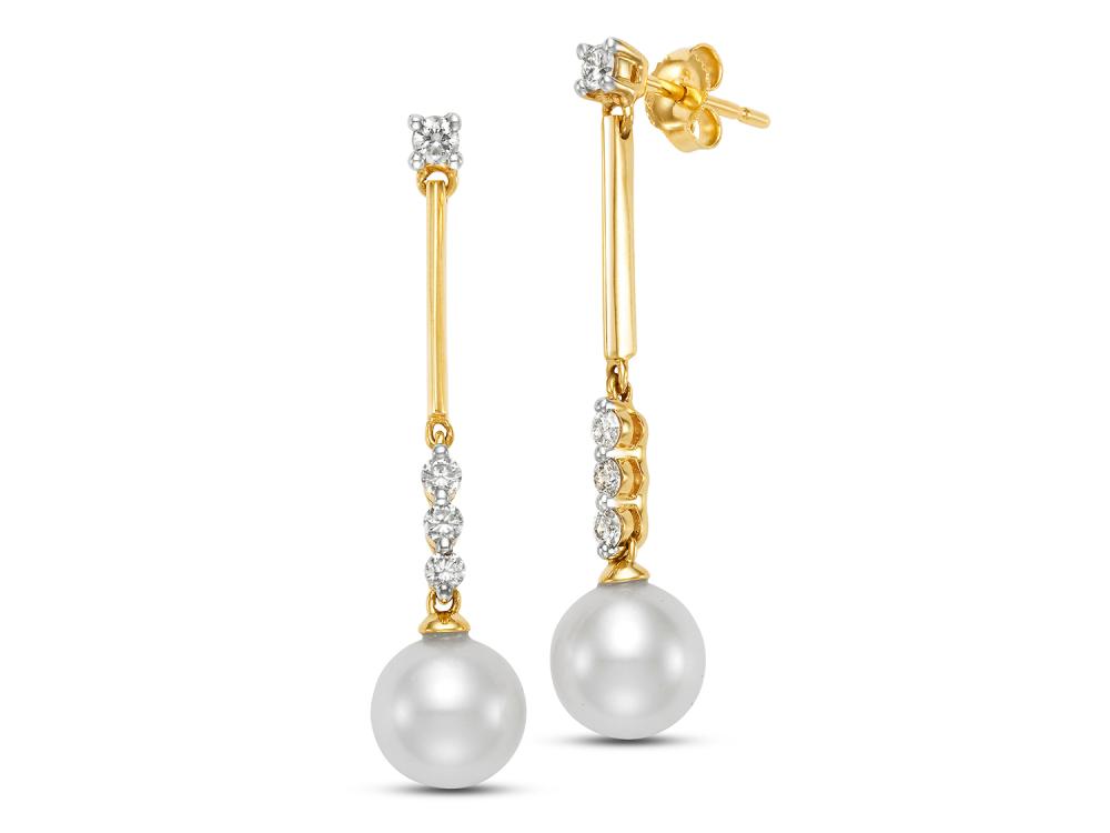 Product Description A stunning way to dress up any occasion, these drop earrings feature two freshwater pearls measuring 8.0-8.5 millimeters accented with 0.35 carats of round brilliant cut diamonds. Other Details Metal Color: Yellow Gold Style: Contemporary Gemstone Type: Pearl Type: Earrings Women Wedding Band Type: Gemstone Total Setting Diamond Carat Weight: 0.35TW Disable Reason: None Earring Type: Gemstones