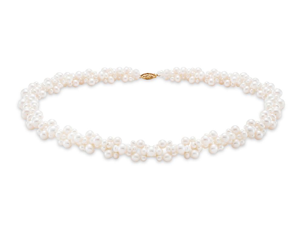 This stunning necklace is crafted with freshwater pearls ranging from 3.0-5.5 millimeters in a cluster design. Measuring 18 inches, it includes a 14 karat gold clasp.