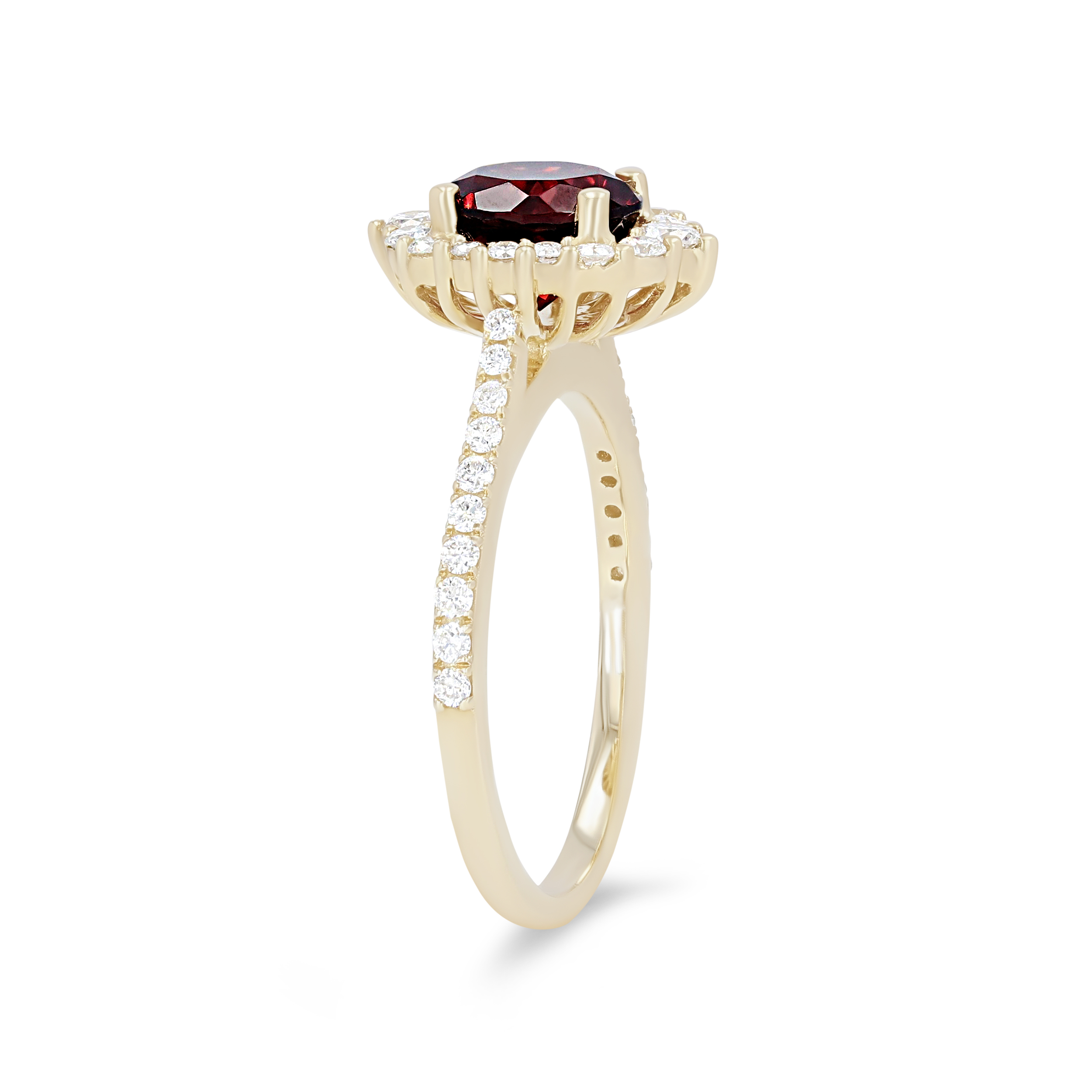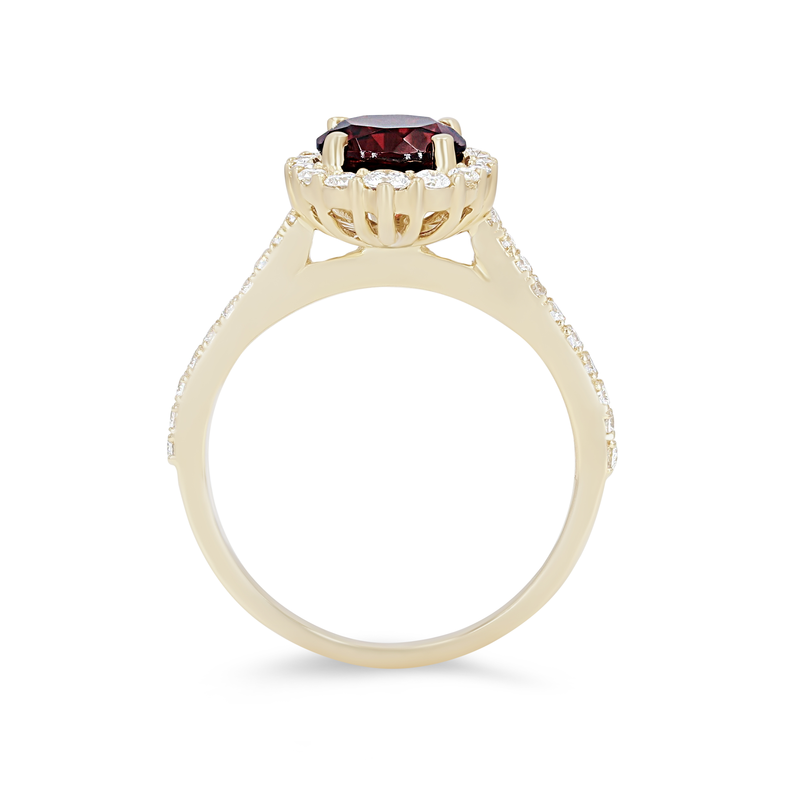 Product Description Sport a beautiful shade of red with this ring, featuring a 1.50 carat garnet surrounded by a halo of round brilliant cut diamonds totaling 0.49 carats. Other Details Gemstone Type: Garnet Center Stone Shape: Rounds Total Setting Diamond Carat Weight: 0.49TW Center Stone Type: Garnet Women Wedding Band Type: Gemstone Metal Color: Yellow Gold Disable Reason: None Type: Ring Style: Classic