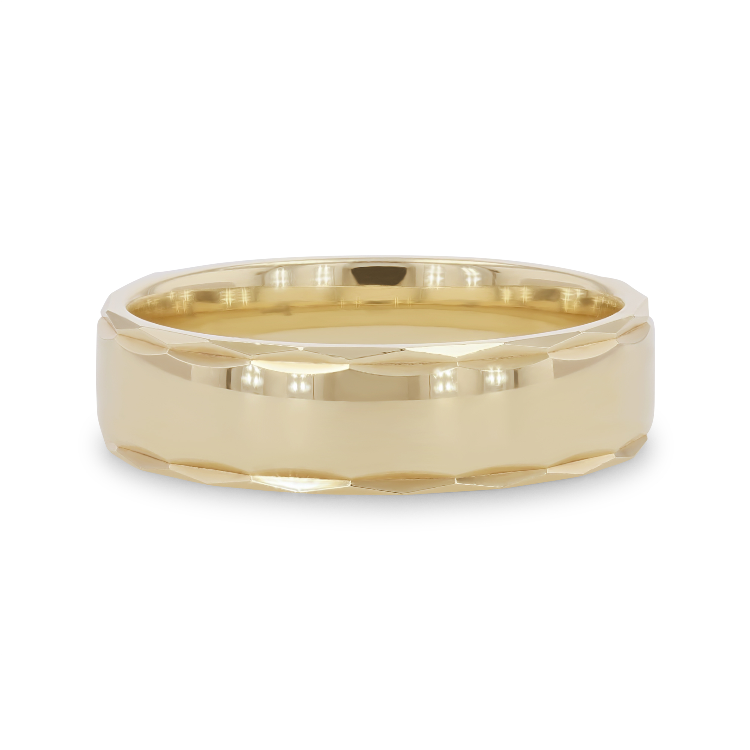 Product Description Perfect for the one that wants a unique look, this wedding band features geometric design edges with a high-polished center. It measures six millimeters. Other Details GENTS WED BD TYPE 2: Carved Metal Color: Yellow Gold Metal Color: Platinum Type: Gents Wedding Band Disable Reason: None Men Wedding Band Type: Men's Plain Bands Metal Color: White Gold Gents Wedding Band Style: Contemporary GENTS WED BD TYPE: Plain Metal Color: Rose Gold