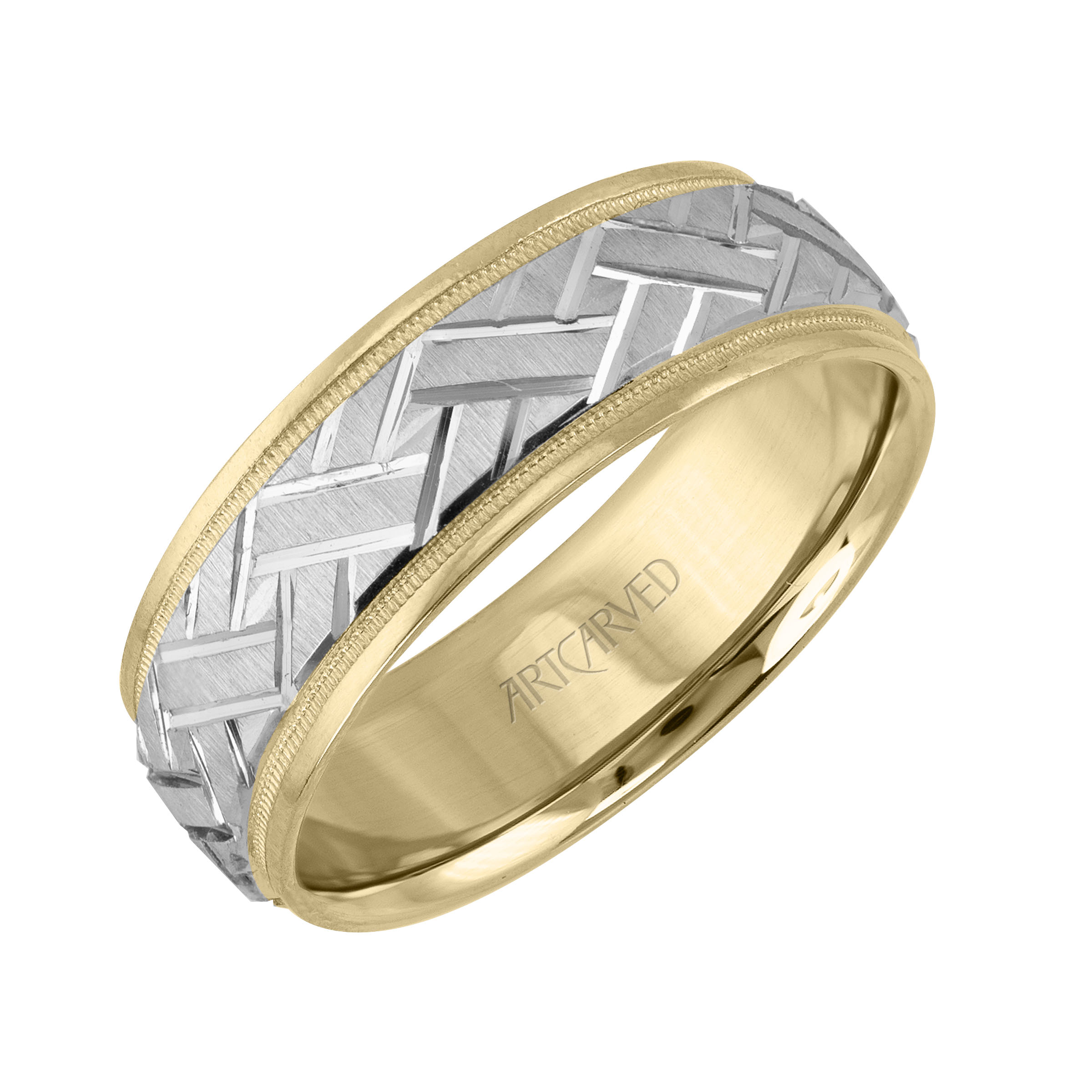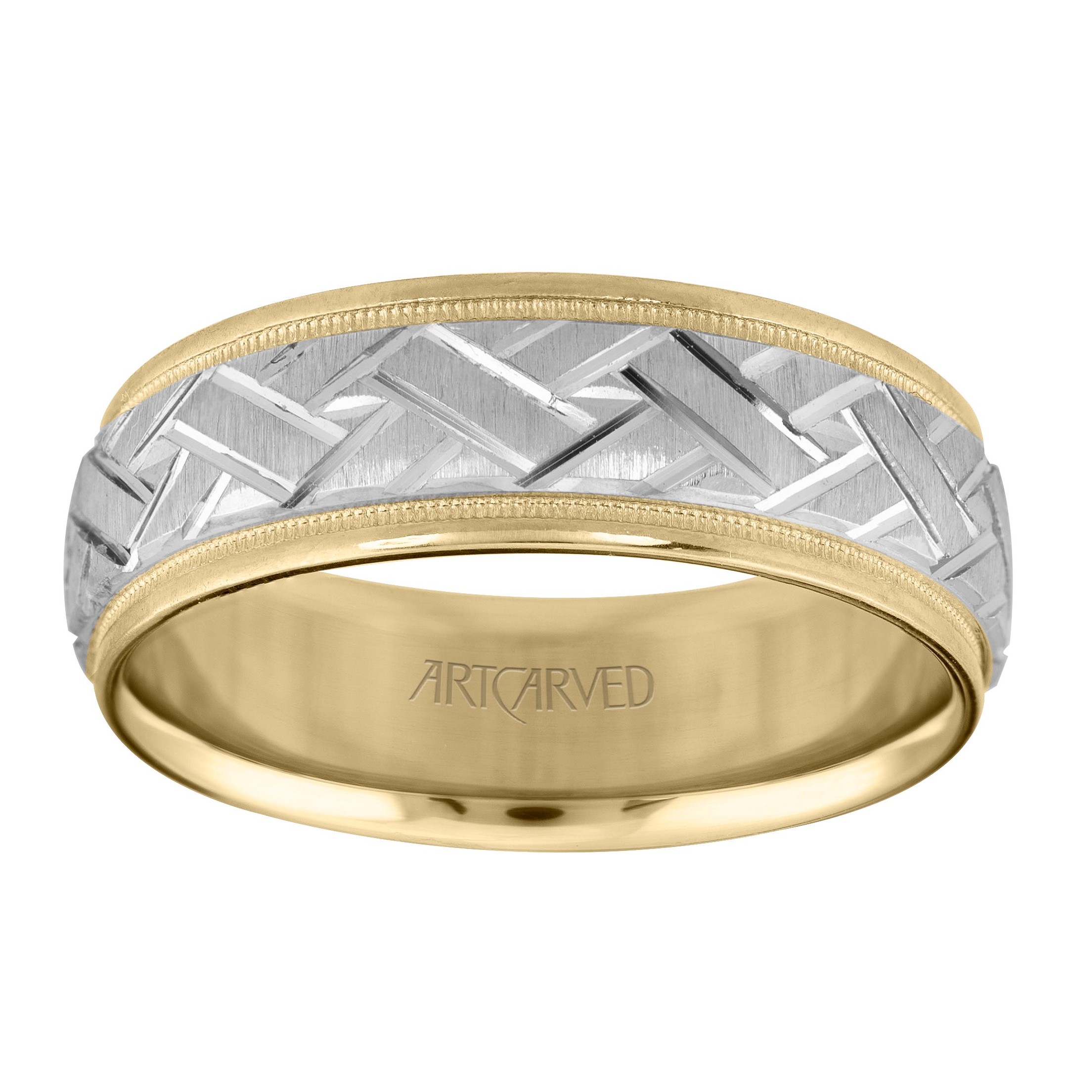 Product Description Perfect for the one wanting a stand-out look, this seven millimeter wedding band features a braided design with milgrain edges. Other Details Disable Reason: None GENTS WED BD TYPE 2: Textured Men Wedding Band Type: Carved Gents Wedding Band Style: Contemporary Metal Color: White Gold Metal Color: Yellow Gold Type: Gents Wedding Band Metal Color: Two Tone Metal Color: Rose Gold