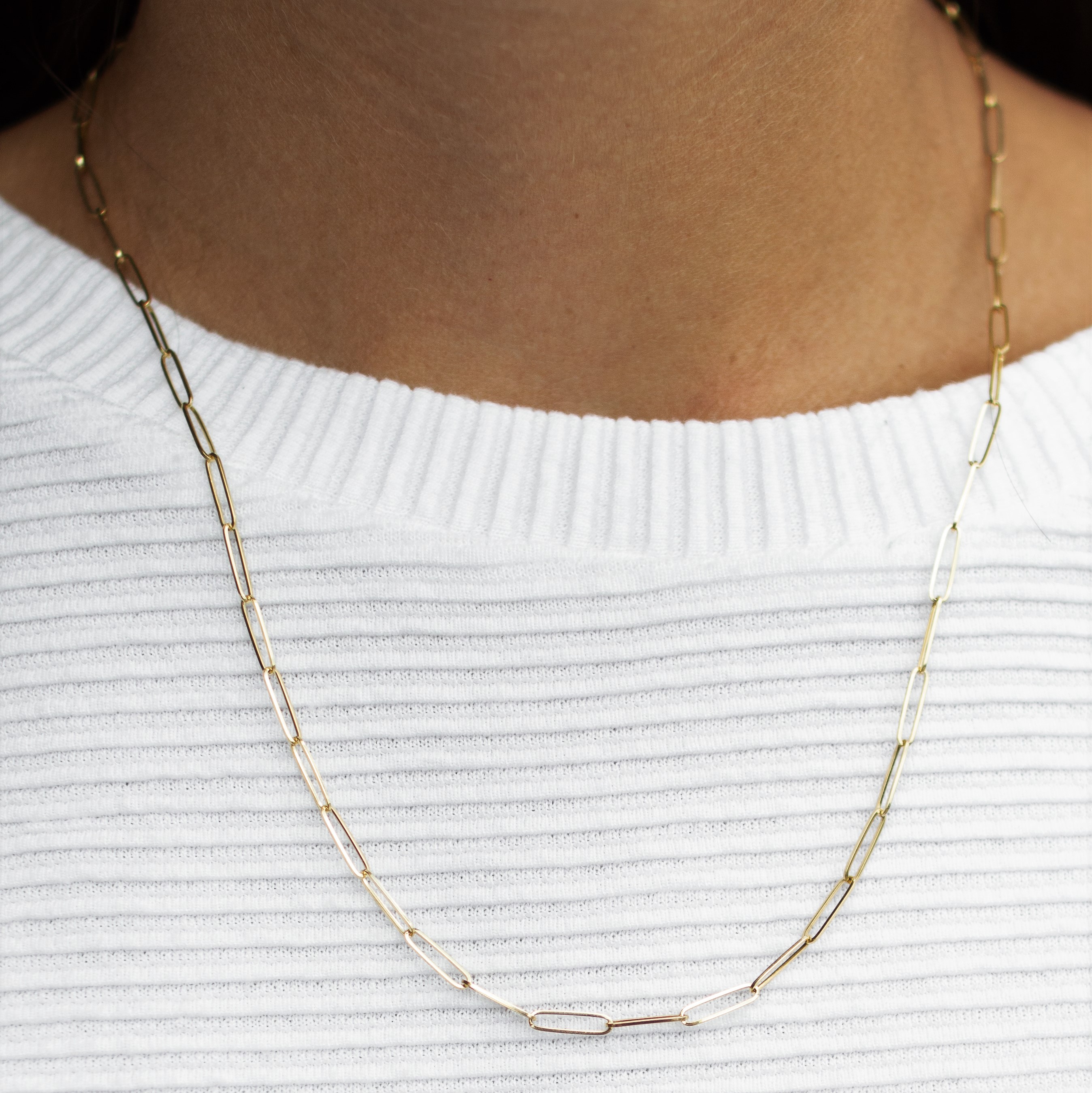 Product Description Modern and on-trend, this paperclip chain necklace measures 18 inches long and 2.6 millimeters wide. Other Details Metal Color: Yellow Gold Style: Contemporary Necklace Type: Fashion Disable Reason: None Type: Necklace Length: 18 IN