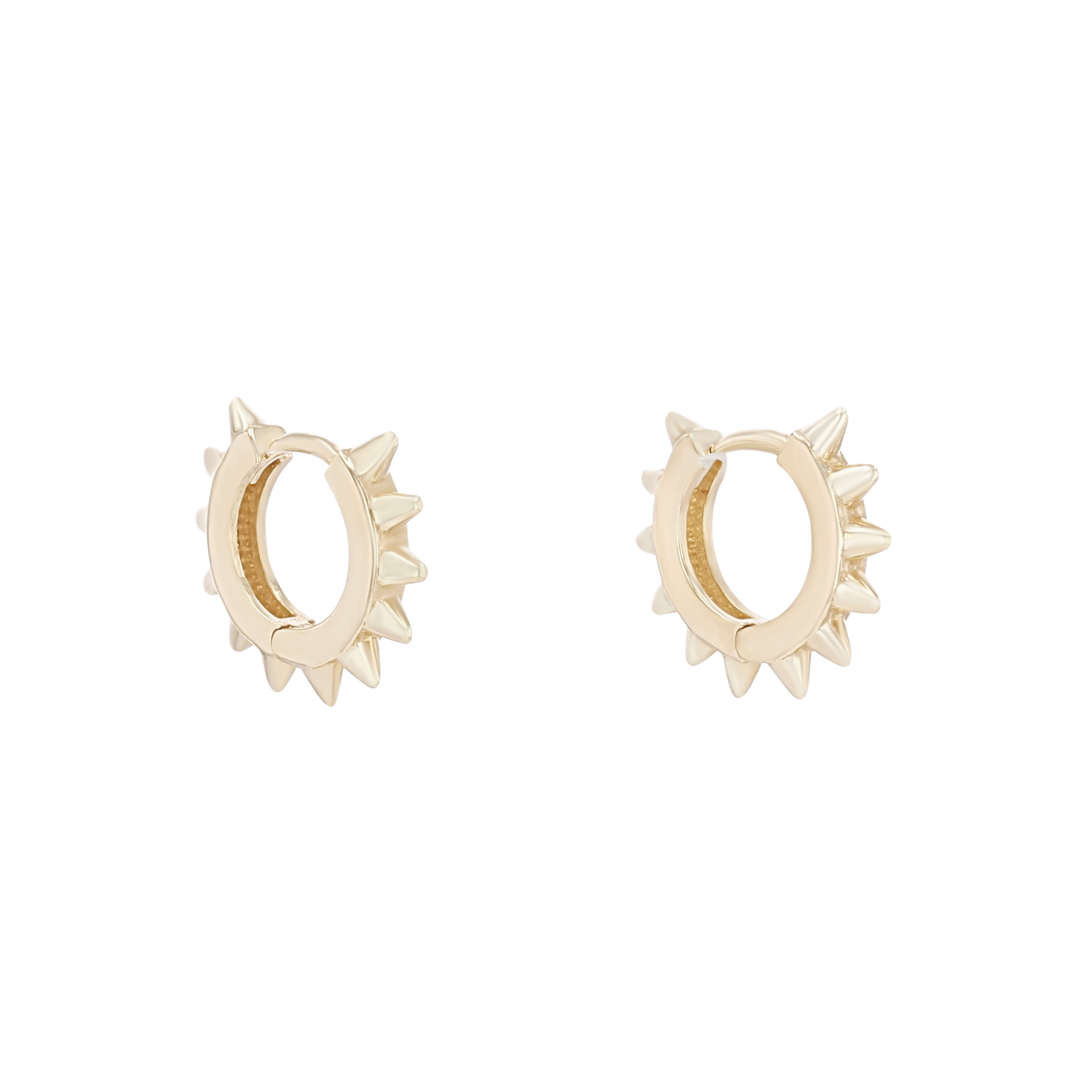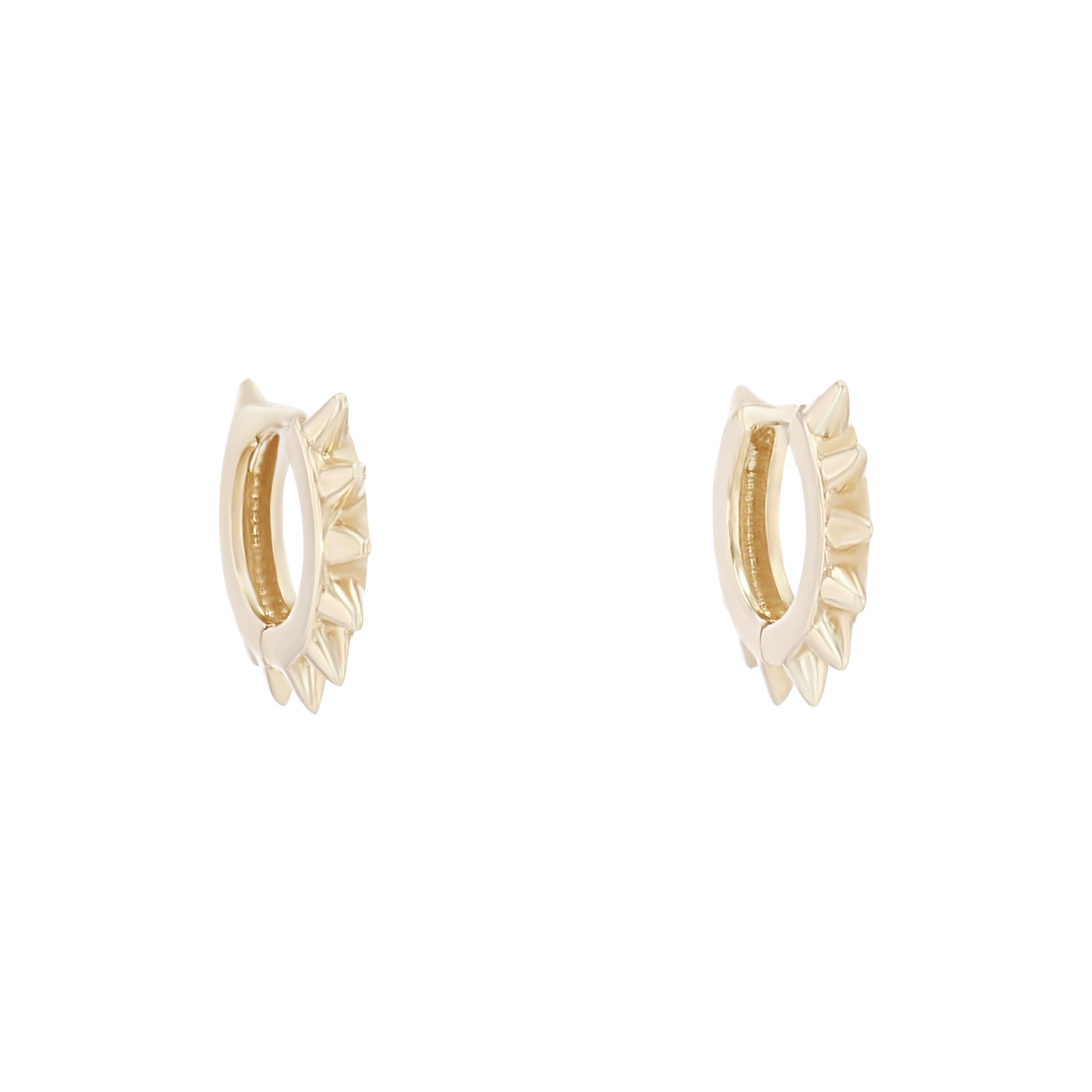 Product Description Edgy and modern, these huggie style hoop earrings feature a spike design. They measure approximately 0.39 inches in diameter. Other Details Style: Contemporary Type: Earrings Disable Reason: None Metal Color: Yellow Gold Earring Type: Hoops & Huggies