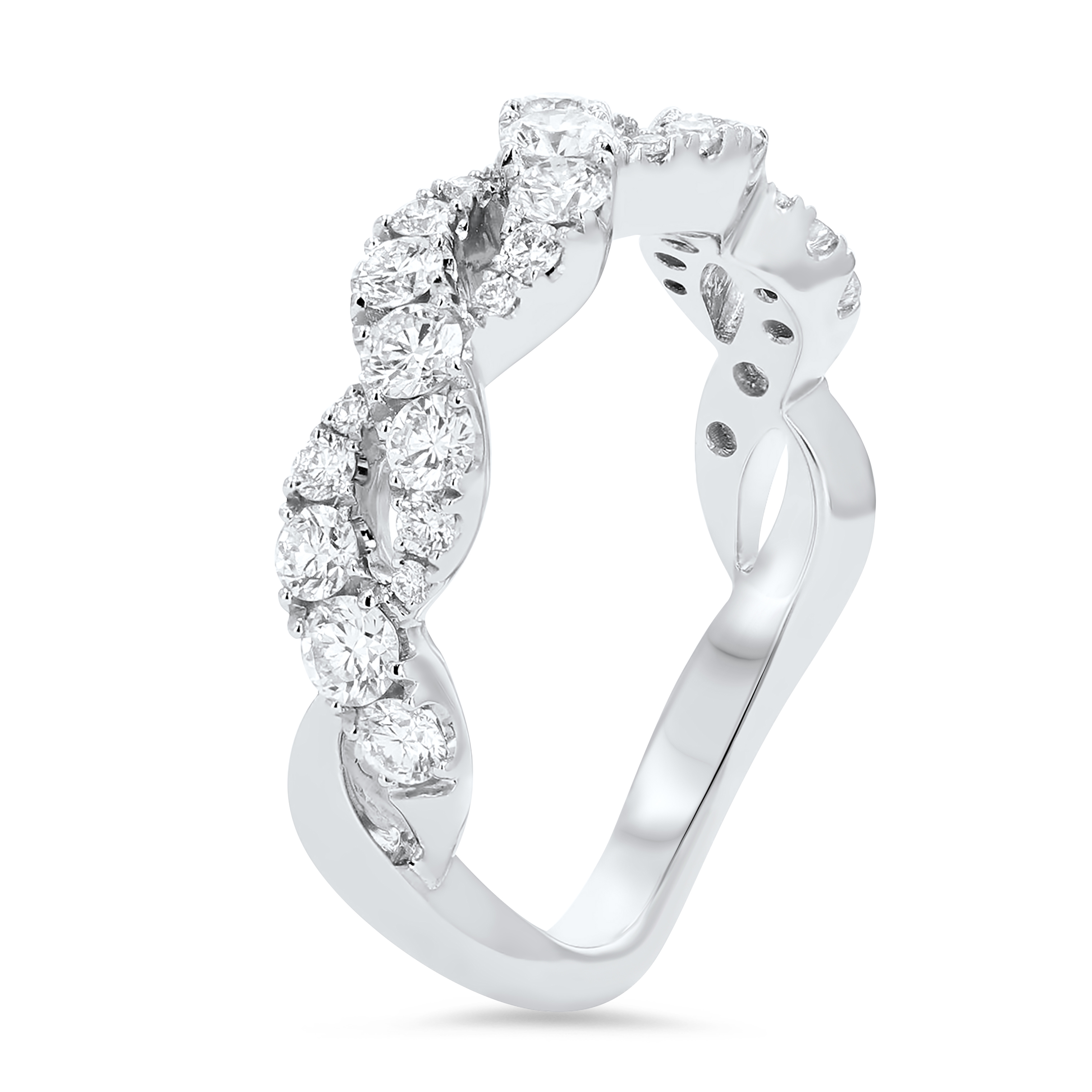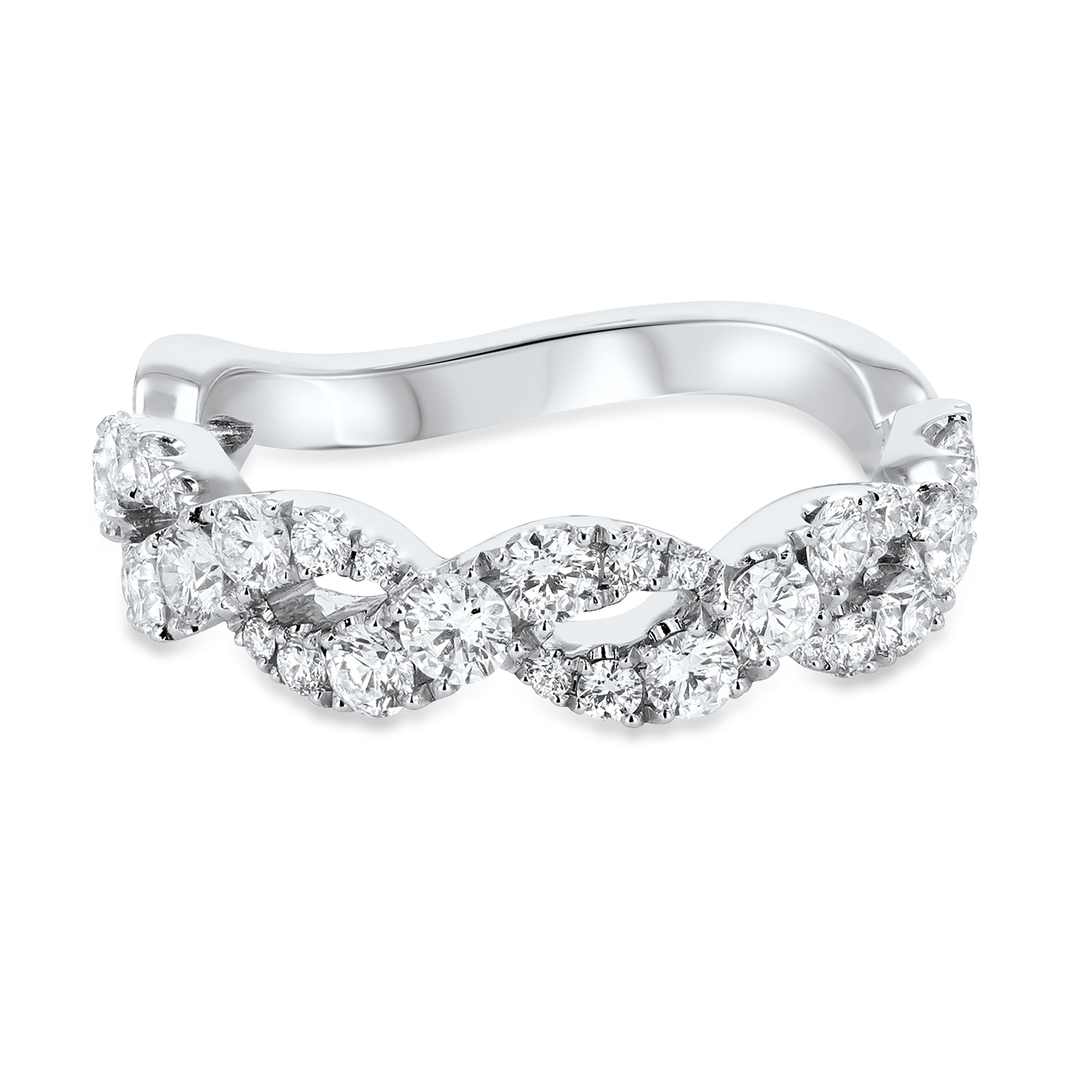 Product Description The timeless twist design of this band contains 0.94 carats of round brilliant cut diamonds graduating in size. Pair it with other bands in a stack or as a stand-alone fashion ring. Other Details Metal Color: Platinum Metal Color: Yellow Gold Type: Ladies Wedding Band Metal Color: Rose Gold Ring Type: Fashion Style: Contemporary Disable Reason: None Total Setting Diamond Carat Weight: 0.94TW Wedding Band Type: Twist Metal Color: White Gold Gemstone Type: Diamond