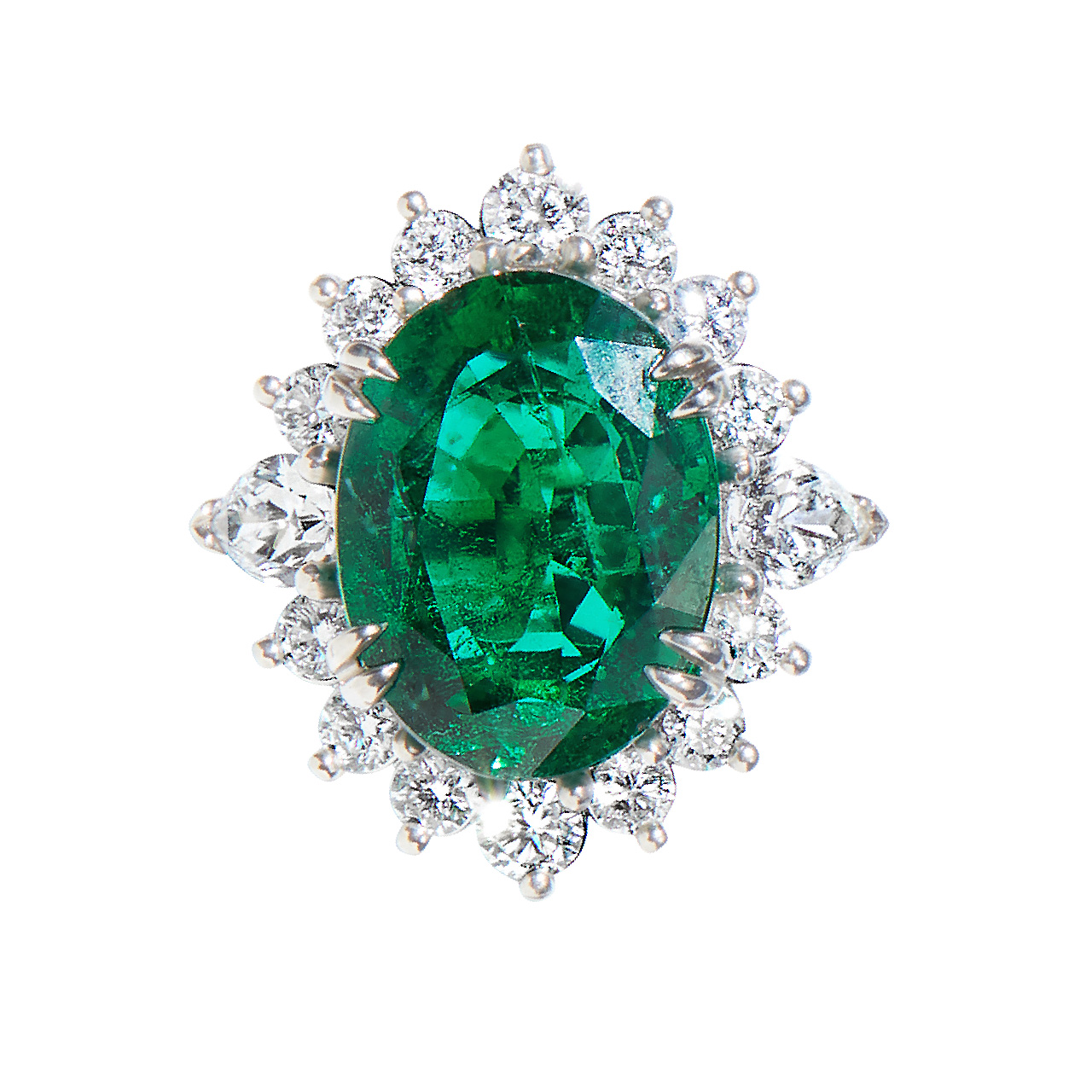 Product Description A stunning ring containing an oval cut green emerald weighing 15.05 carats, surrounded by 3.43 carats of round brilliant and pear cut diamonds, set in platinum. Other Details Center Stone Shape: Ovals Gemstone Type: Emerald Metal Color: Platinum Luxury Collection Item Type: Ring Type: Luxury Center Stone Type: Emerald Total Setting Diamond Carat Weight: 3.43TW Disable Reason: None