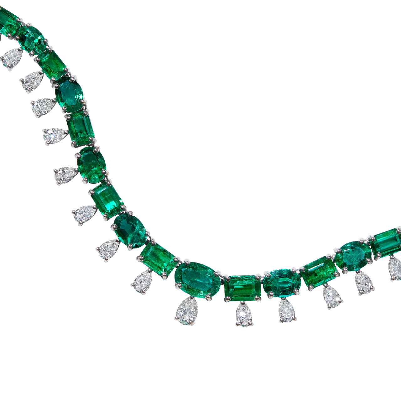 Product Description A stunning riviera necklace featuring 37.11 carats of green emeralds and 10.31 carats of round brilliant diamonds, set in 18 karat white gold. Other Details Luxury Collection Item Type: Necklace Metal Color: White Gold Total Gemstone Carat Weight: 37.11TW Necklace Type: Fashion Type: Luxury Gemstone Type: Emerald Total Setting Diamond Carat Weight: 10.31TW Disable Reason: None Pendant Type: Gemstone