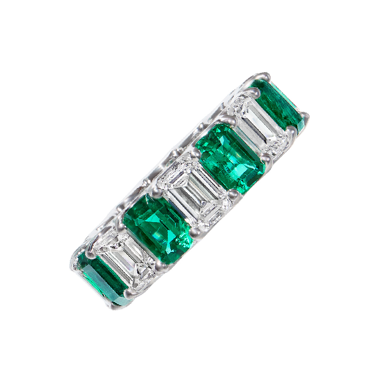 Product Description A GIA certified eternity band containing 4.76 carats of green emeralds and 4.62 carats of emerald cut diamonds, set in platinum. Other Details Disable Reason: None Total Setting Diamond Carat Weight: 4.62TW Metal Color: Platinum Type: Luxury Gemstone Type: Emerald Average color range: G Total Gemstone Carat Weight: 4.76TW Luxury Collection Item Type: Ring Average clarity range: VS1
