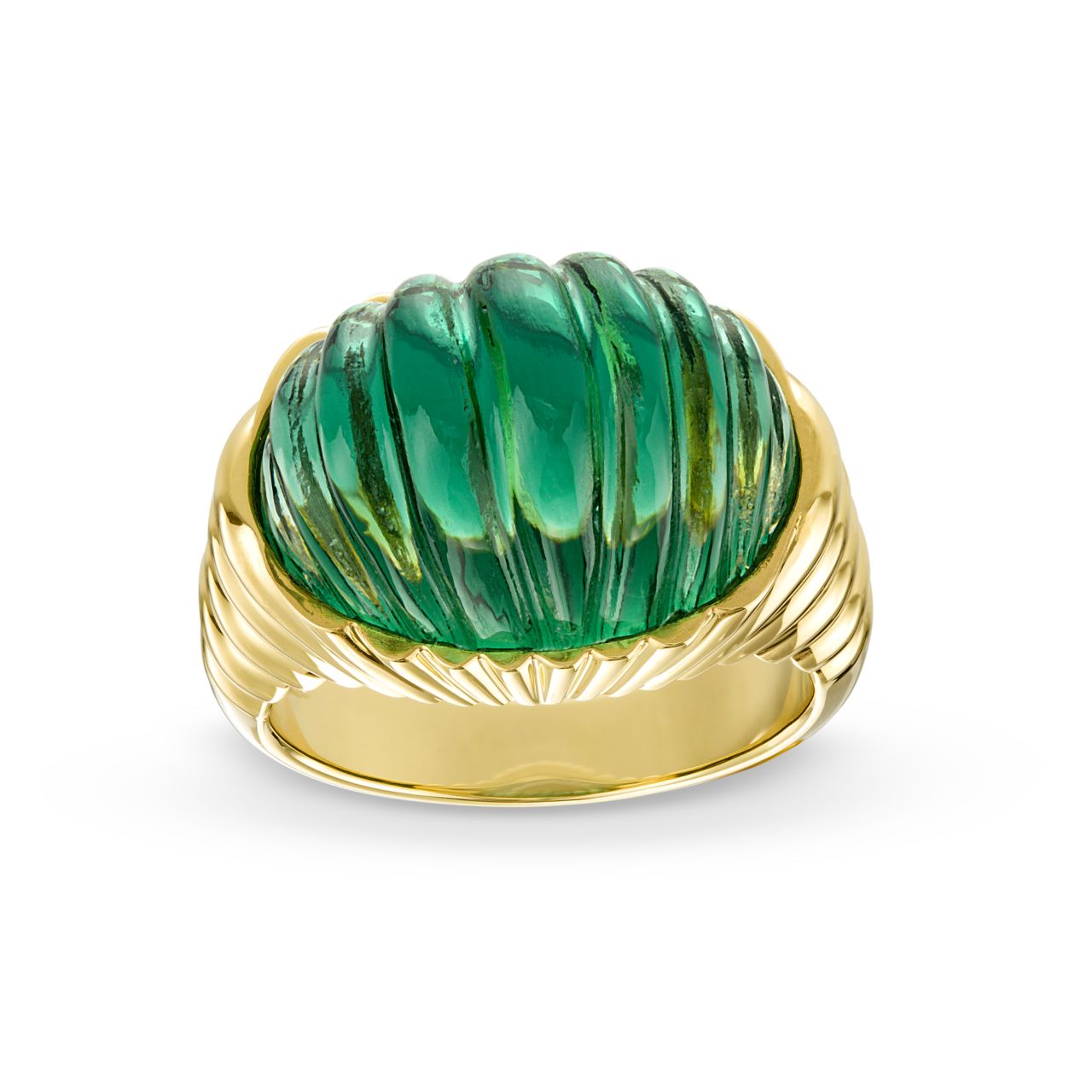 Experience the vintage inspired beauty of the Green Quartz Dome Ring�a stunning blend of elegance and retro flair. This exquisite ring features a luscious green quartz nestled within a ribbed dome setting, creating a captivating play of light and texture.