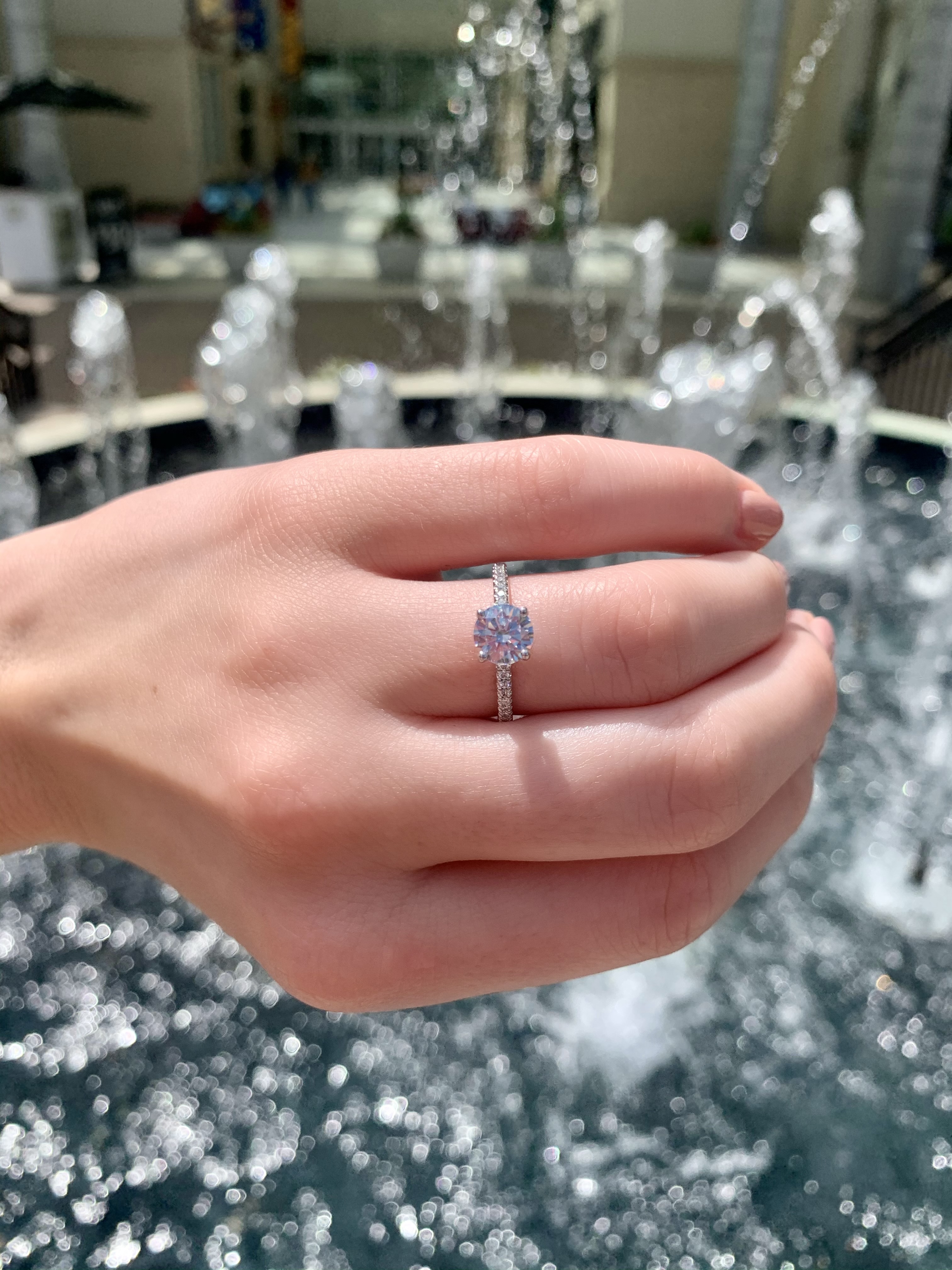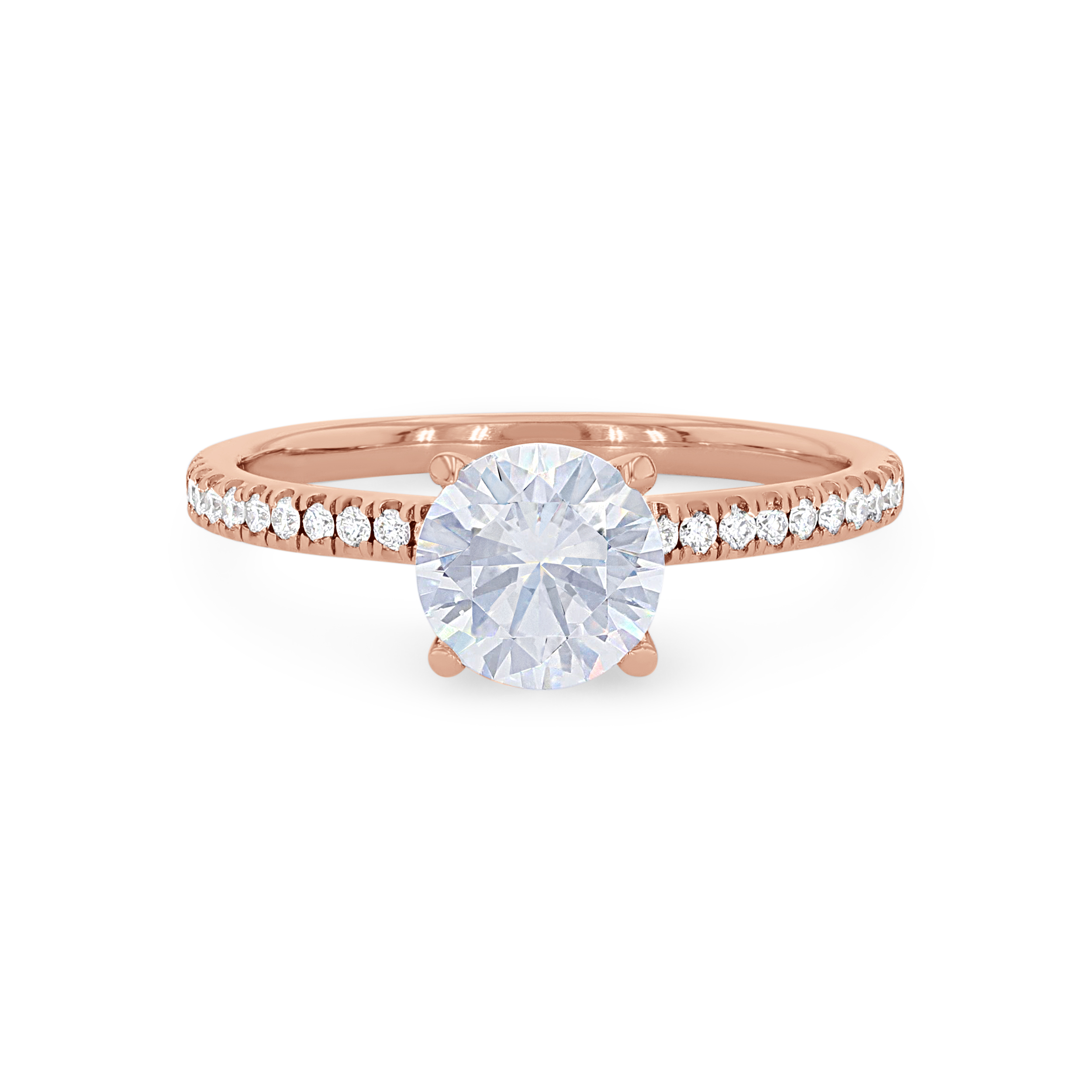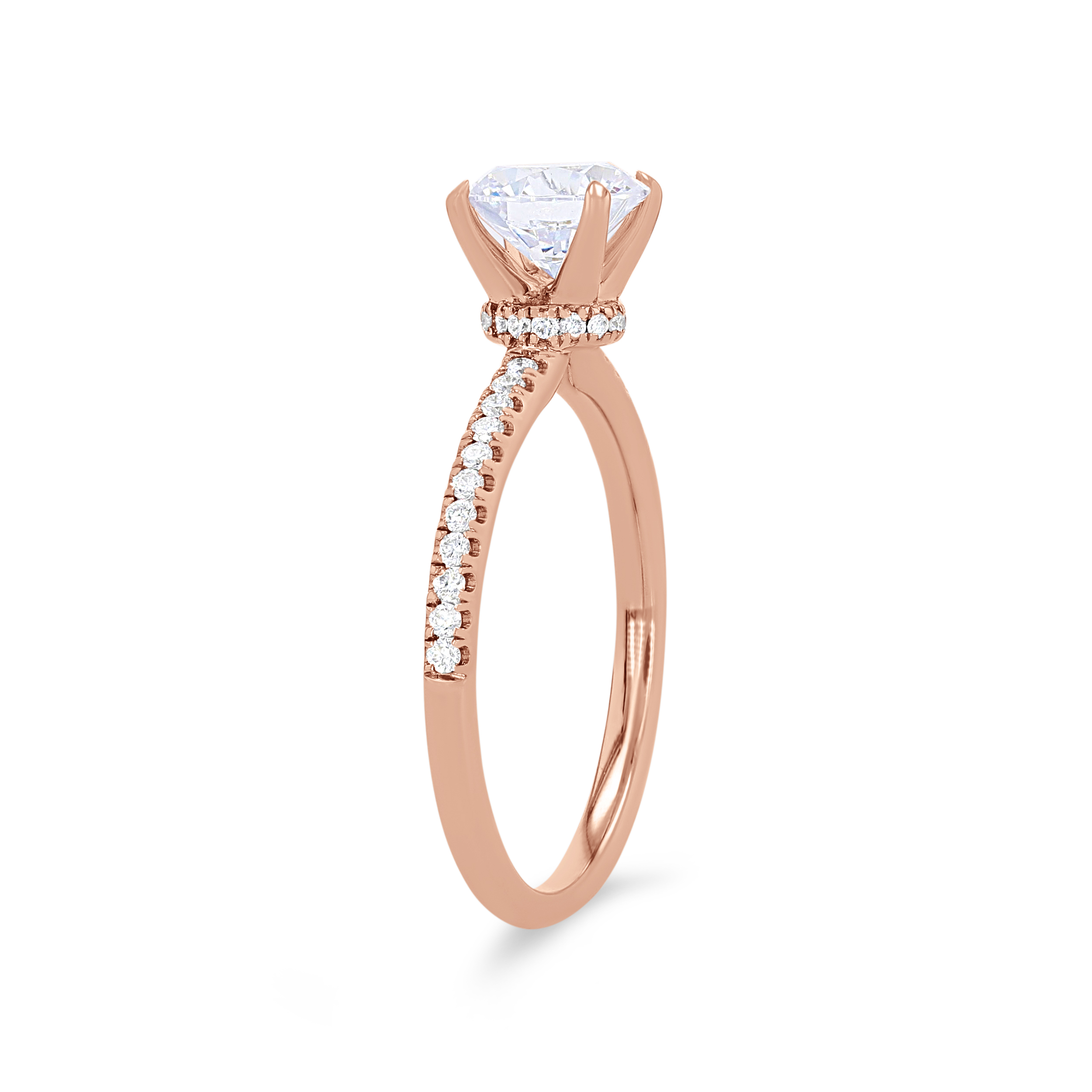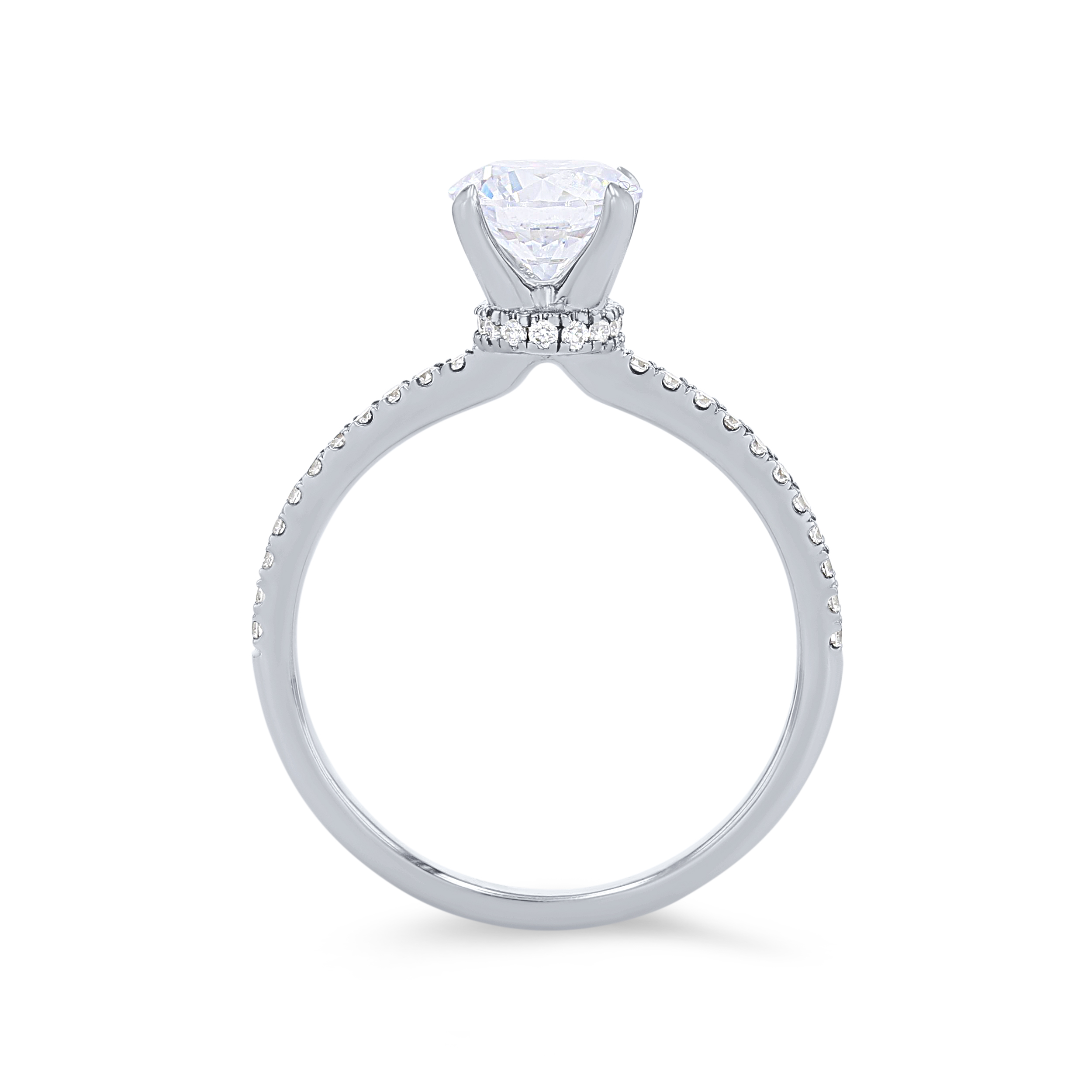 Classic with a twist, this engagement setting features a hidden diamond belt accent at the base of the head, as well as along the shank. The total weight is 0.21 carats.