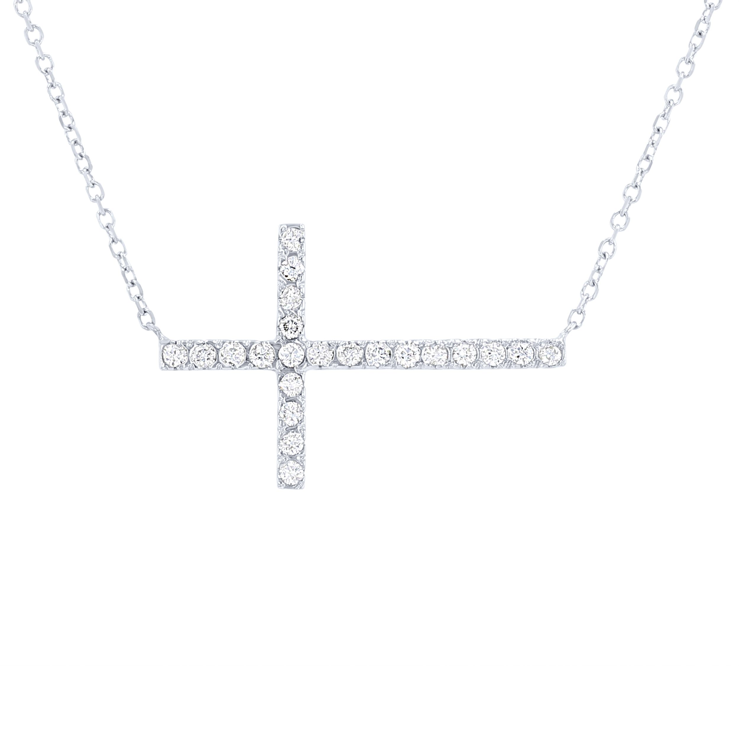 Product Description A contemporary twist on a classic piece, this cross pendant features a sideways design accented by 0.19 carats of round brilliant cut diamonds. Other Details Type: Necklace Style: Contemporary Metal Color: White Gold Pendant Type: Religious Disable Reason: None Necklace Type: Fashion Total Setting Diamond Carat Weight: 0.19TW Gemstone Type: Diamond