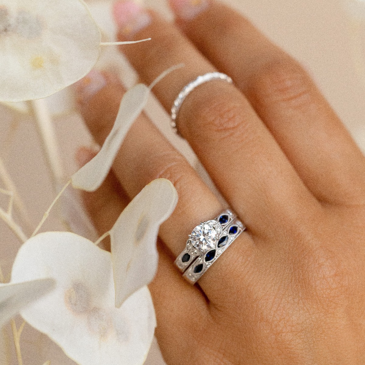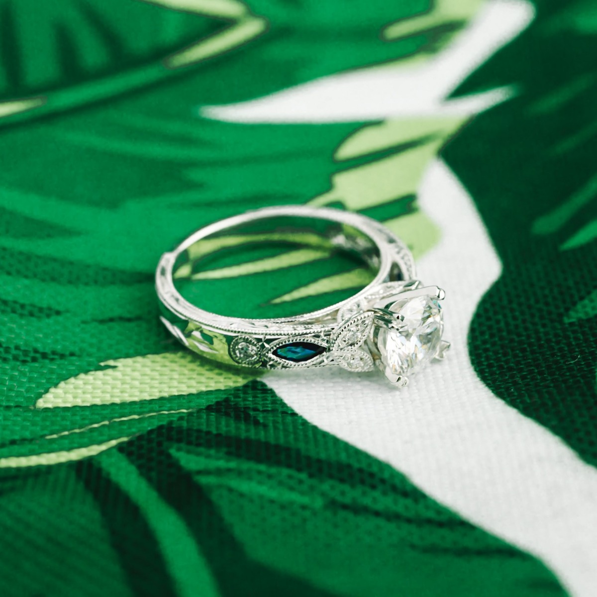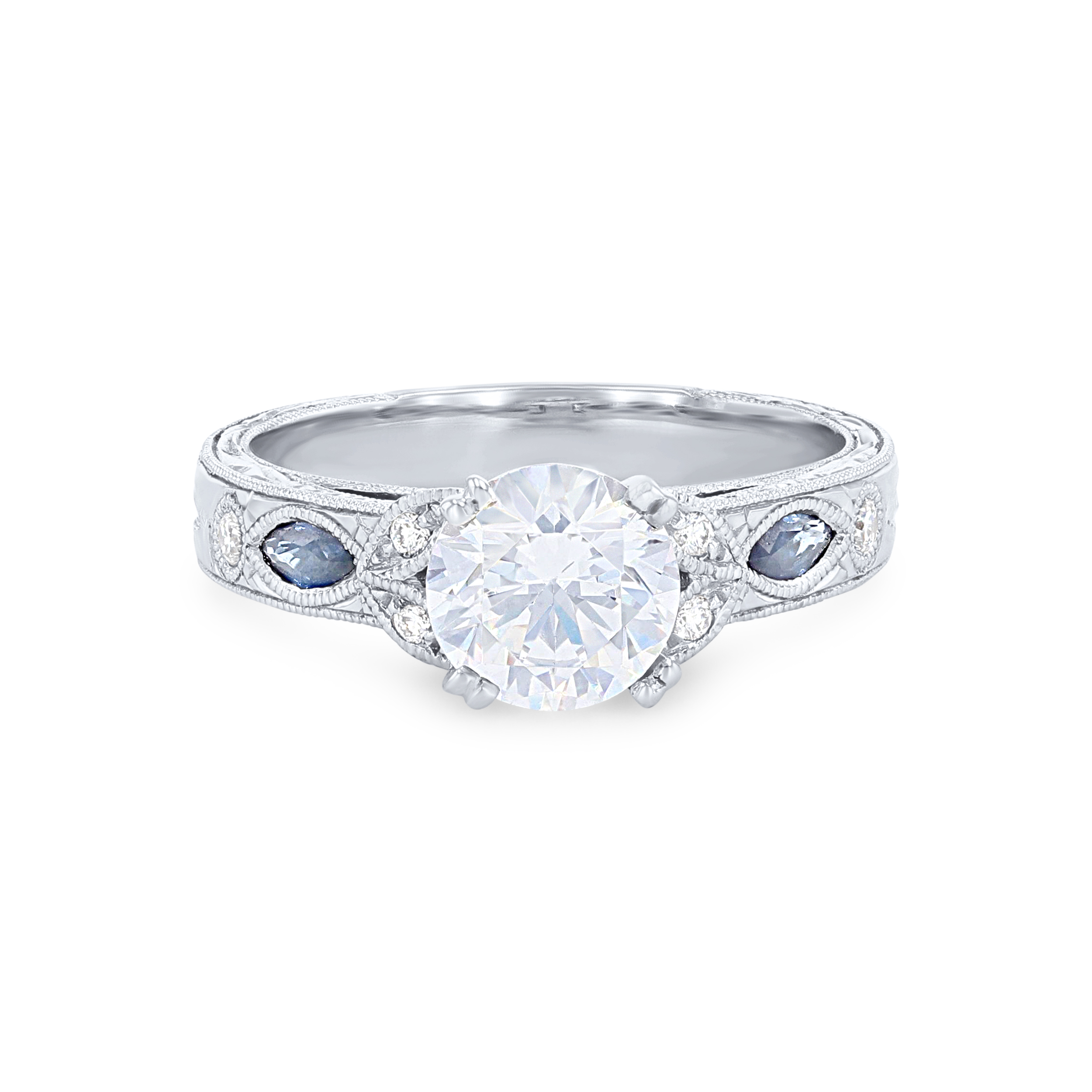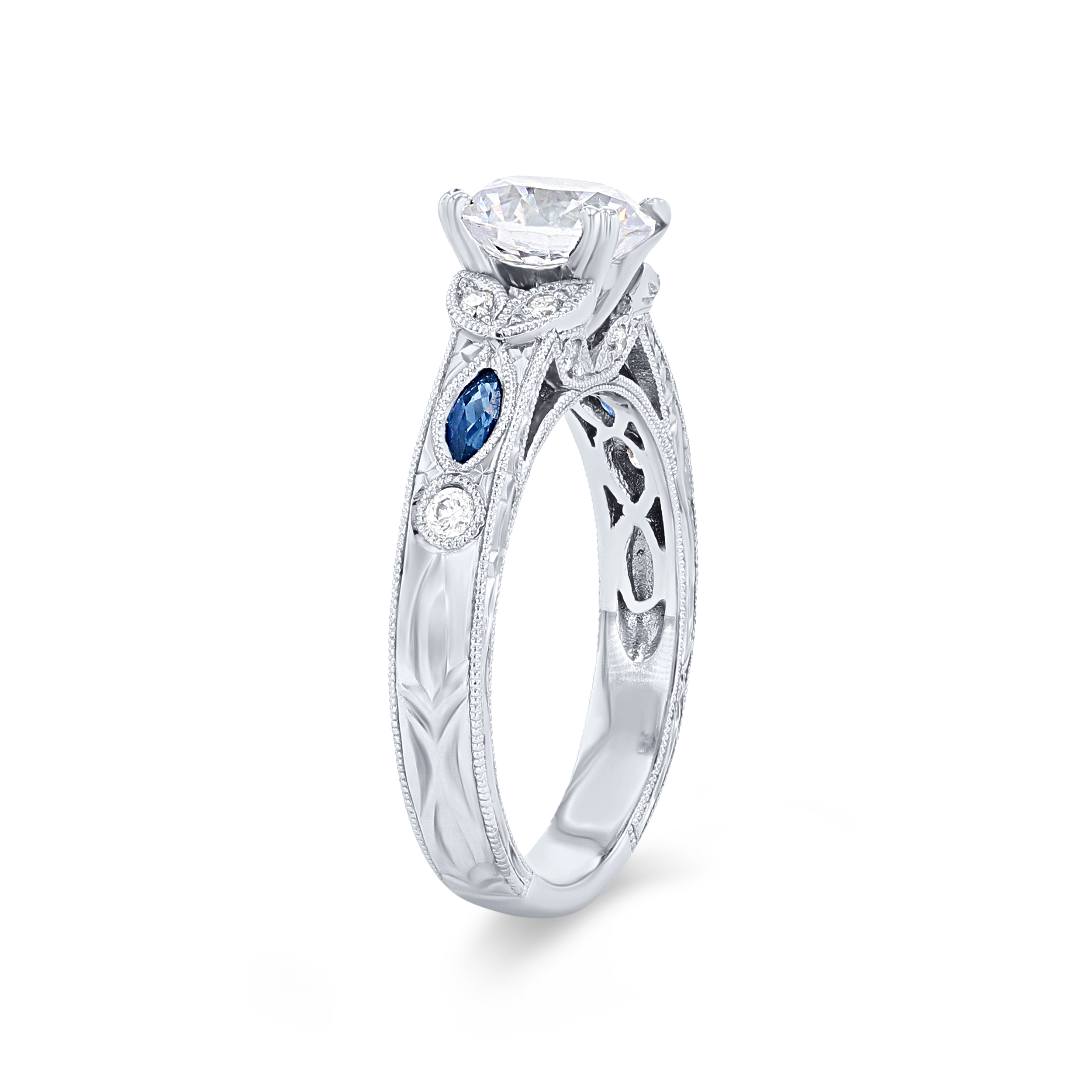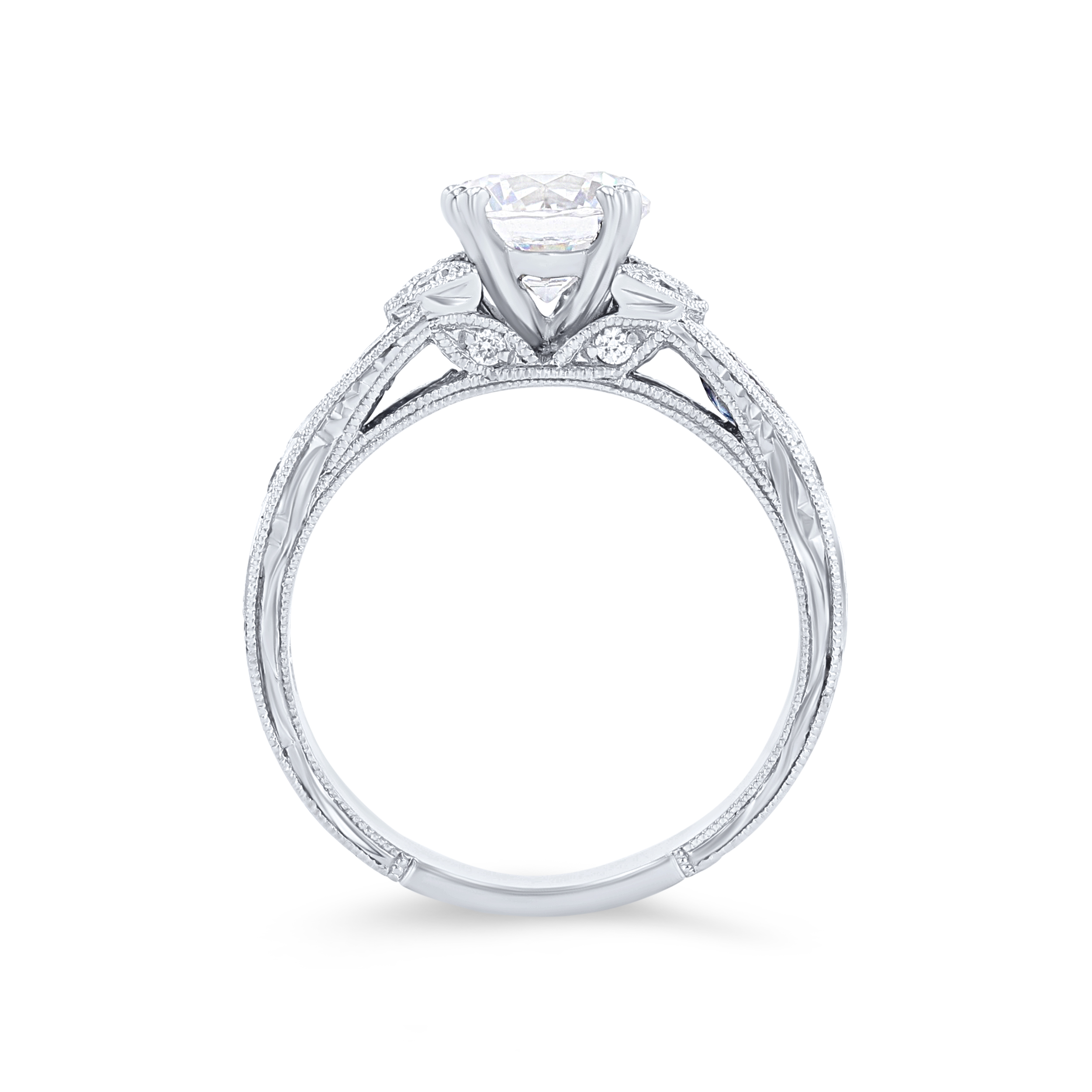 Product Description A stunning design from the Dahlia Collection, this hand-engraved engagement setting features 0.12 carats of blue sapphires and 0.12 carats of round brilliant cut diamonds. Wedding band sold separately. Other Details Metal Color: Platinum Style: Vintage Total Gemstone Carat Weight: 0.12TW Metal Color: Yellow Gold Type: Setting Total Setting Diamond Carat Weight: 0.12TW Disable Reason: None Mounting Type: Diamond Accented Metal Color: White Gold Women Wedding Band Type: Gemstone Average color range: GH Gemstone Type: Sapphire Average clarity range: VS