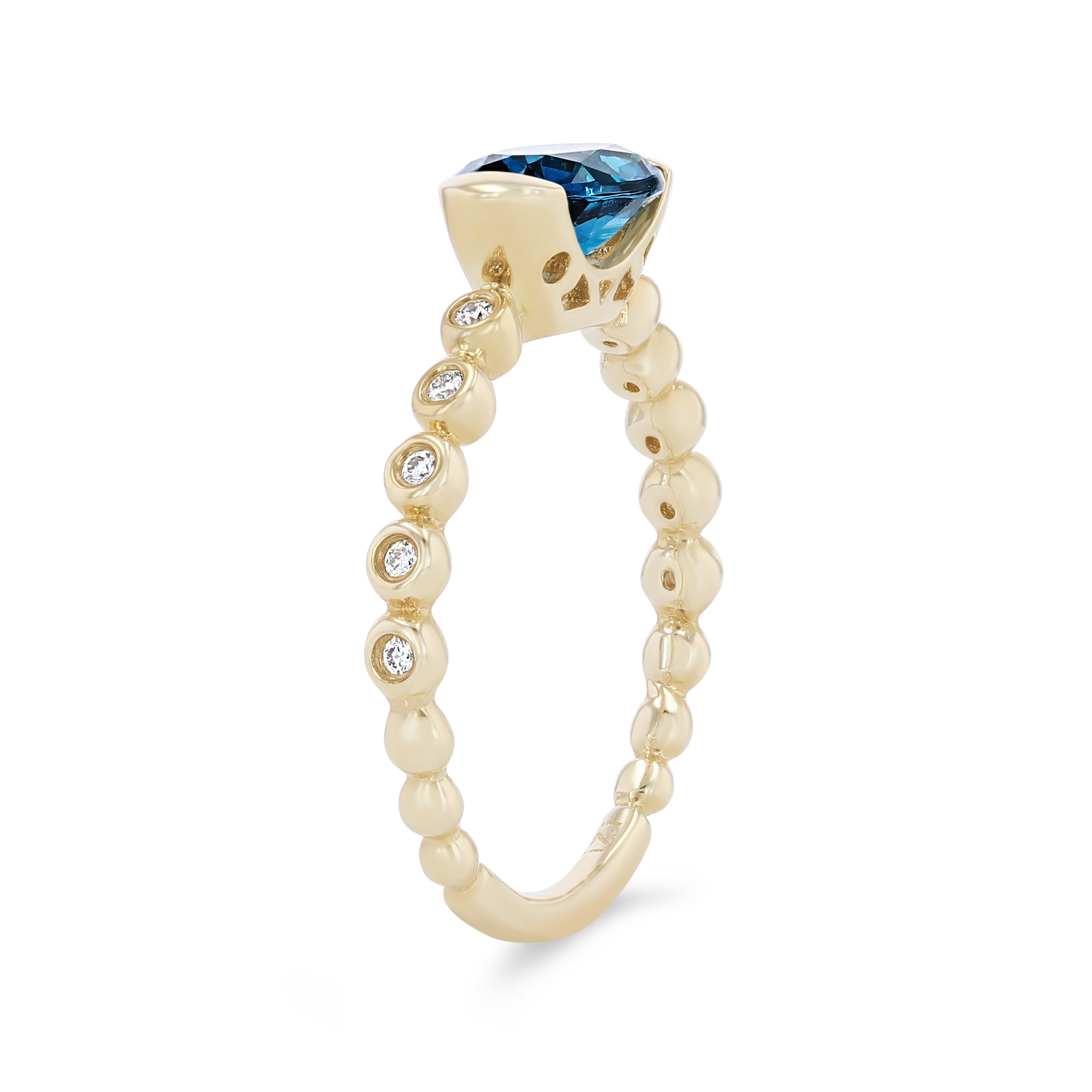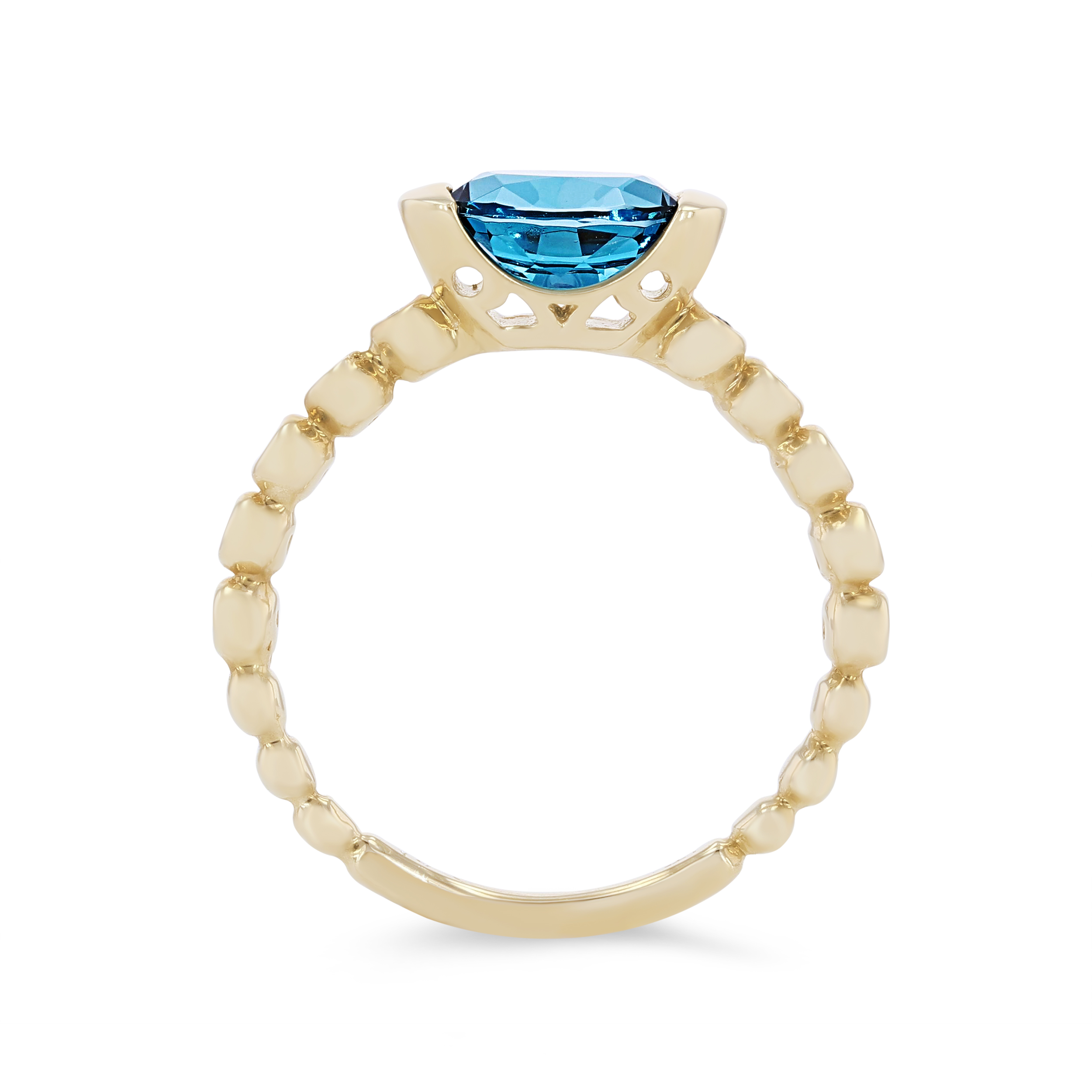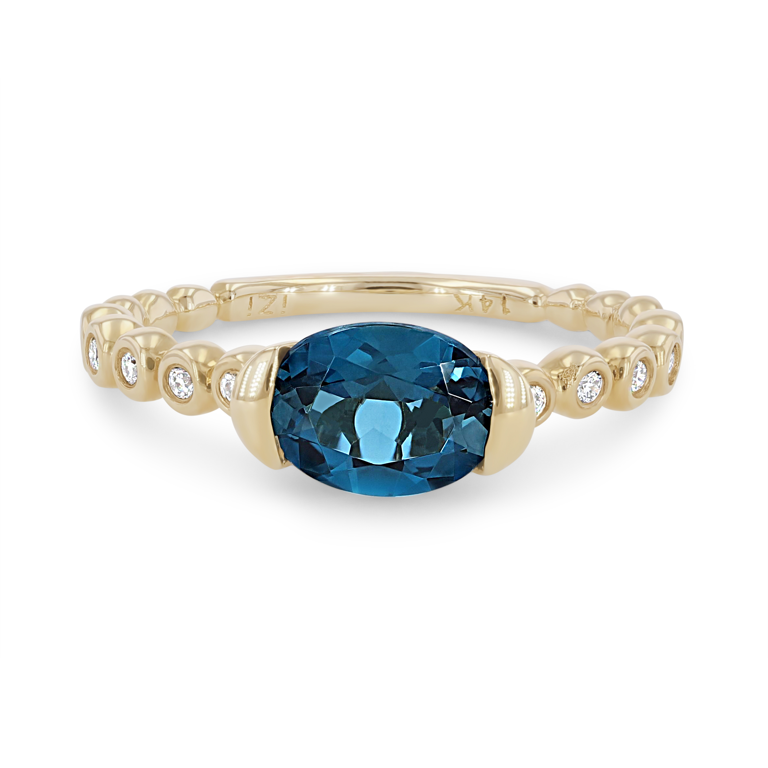 Product Description A truly modern design, this ring features an oval cut London blue topaz weighing 1.53 carats set horizontally in a half-bezel setting accented by 0.09 carats of round brilliant cut diamonds. Other Details Gemstone Type: Blue Topaz Disable Reason: None Metal Color: Yellow Gold Total Gemstone Carat Weight: 1.53TW Women Wedding Band Type: Gemstone Style: Contemporary Type: Ring Total Setting Diamond Carat Weight: 0.09TW