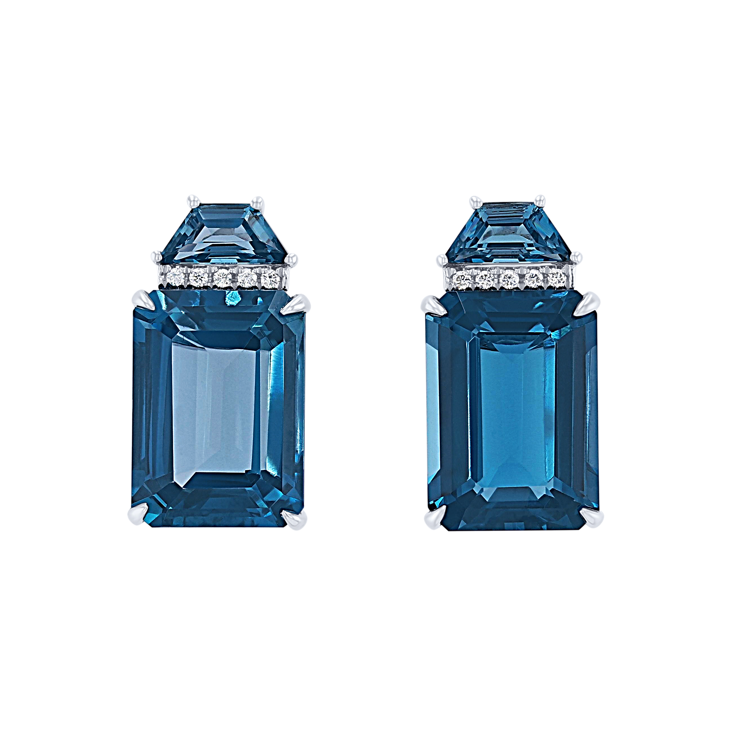 Product Description Perfect for dressing up any look, these earrings feature emerald cut and trapezoid cut London blue topaz totaling 19.10 carats accented by 0.10 carats of round brilliant cut diamonds. Other Details Gemstone Type: Blue Topaz Total Gemstone Carat Weight: 19.1TW Total Setting Diamond Carat Weight: 0.1TW Disable Reason: None Metal Color: White Gold Earring Type: Gemstones Women Wedding Band Type: Gemstone Type: Earrings Style: Contemporary