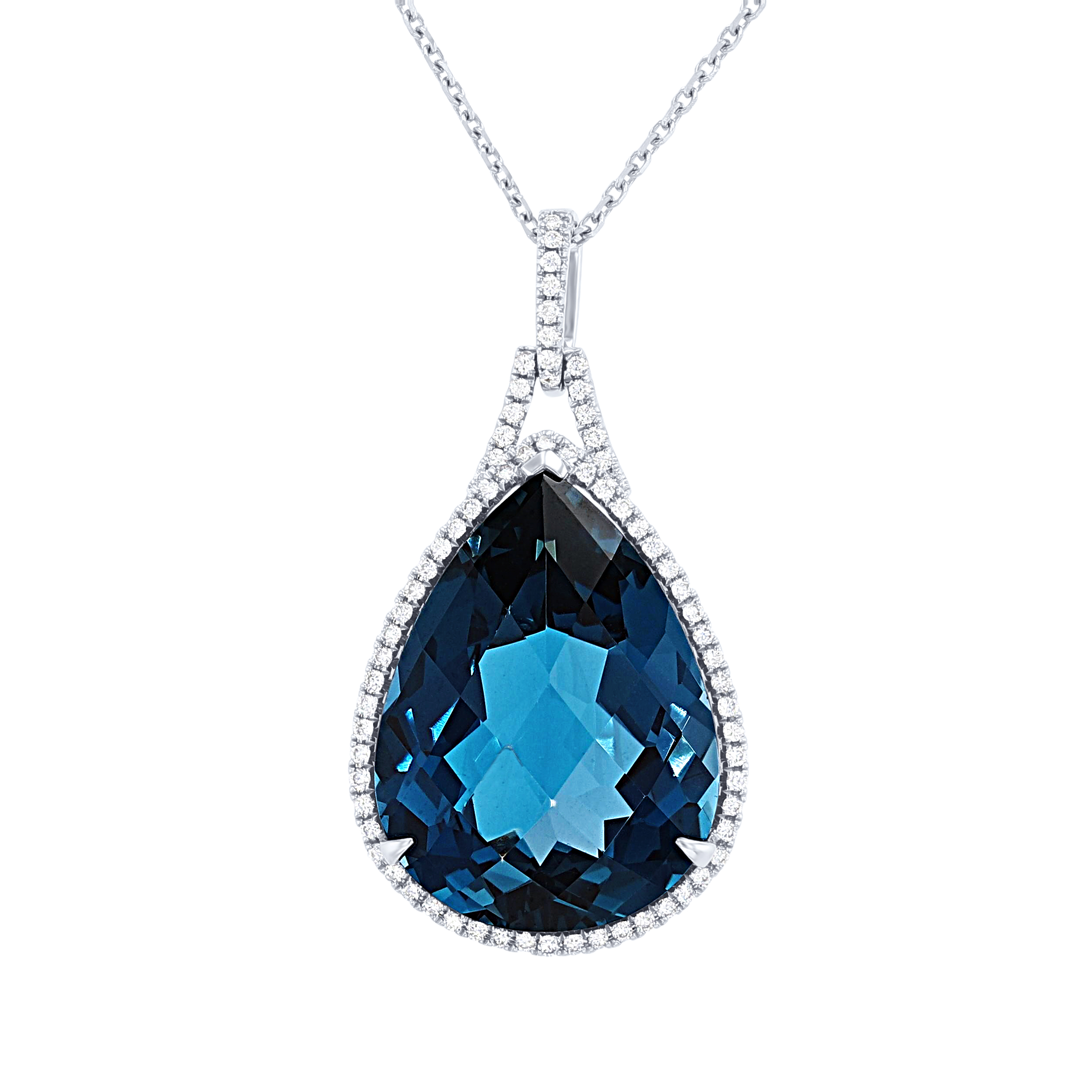 Product Description This show-stopping pendant features a striking pear shape London blue topaz weighing 21.85 carats surrounded by a halo of round brilliant cut diamonds totaling 0.34 carats. Other Details Disable Reason: None Type: Necklace Length: 16 IN Gemstone Type: Blue Topaz Pendant Type: Gemstone Total Setting Diamond Carat Weight: 0.34TW Total Gemstone Carat Weight: 21.85TW Necklace Type: Fashion Style: Contemporary Metal Color: White Gold