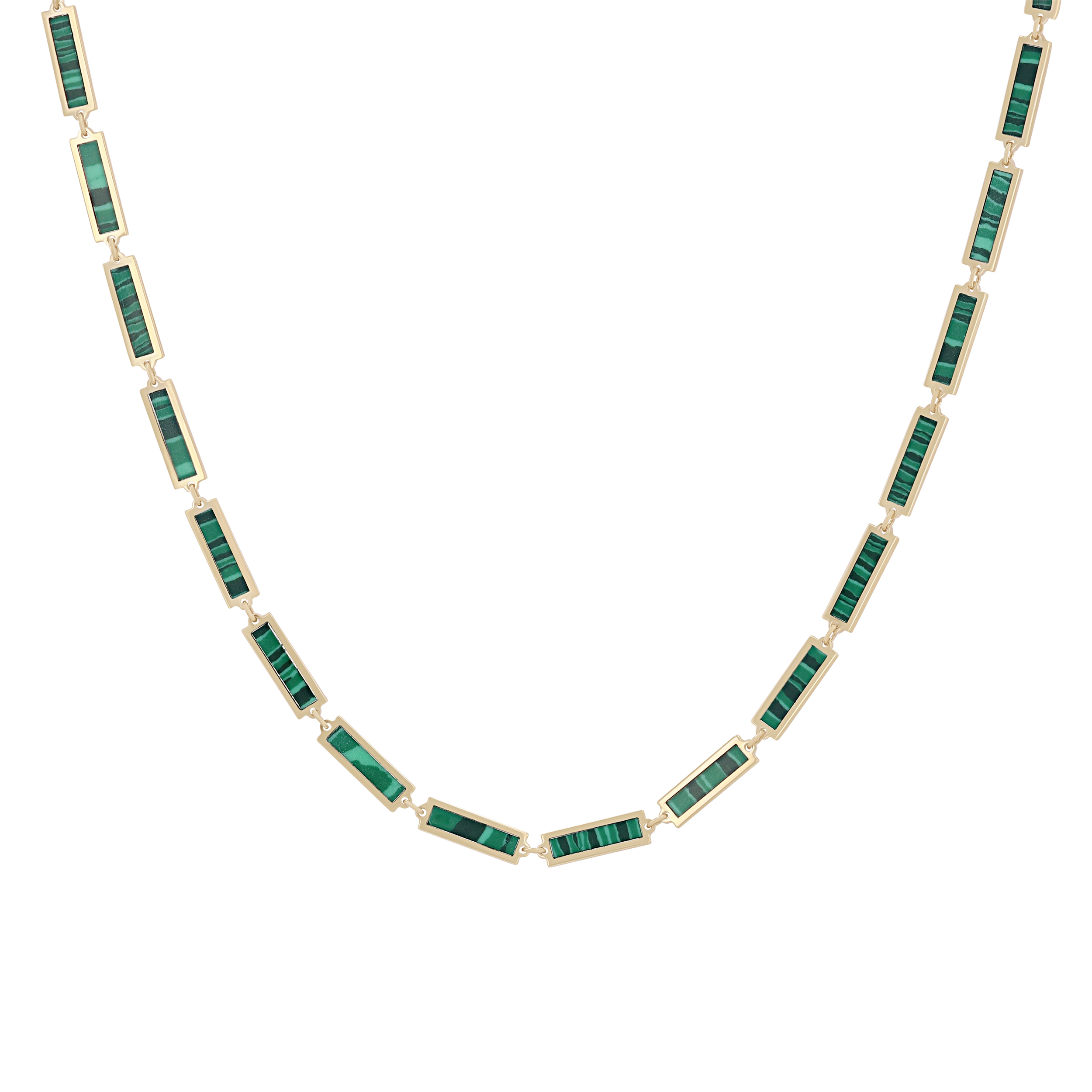 Product Description Beautiful segments of malachite are outlined with 14 karat yellow gold, measuring 24 inches long. Other Details Metal Color: Yellow Gold Necklace Type: Fashion Gemstone Type: Malachite Disable Reason: None Length: 24 IN Style: Contemporary Pendant Type: Gemstone Type: Necklace