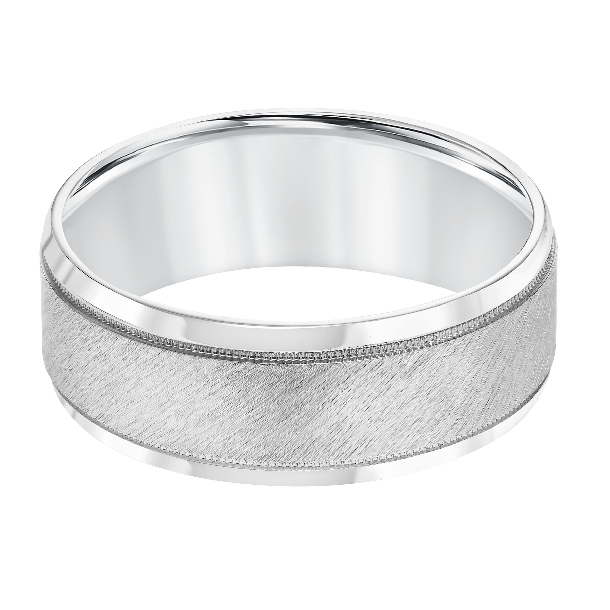 Product Description This eye-catching wedding band features a textured matte finish accented by milgrain, measuring eight millimeters wide. Other Details Metal Color: Yellow Gold Type: Gents Wedding Band Disable Reason: None Metal Color: Rose Gold Metal Color: White Gold Men Wedding Band Type: Textured Metal Color: Platinum Gents Wedding Band Style: Contemporary