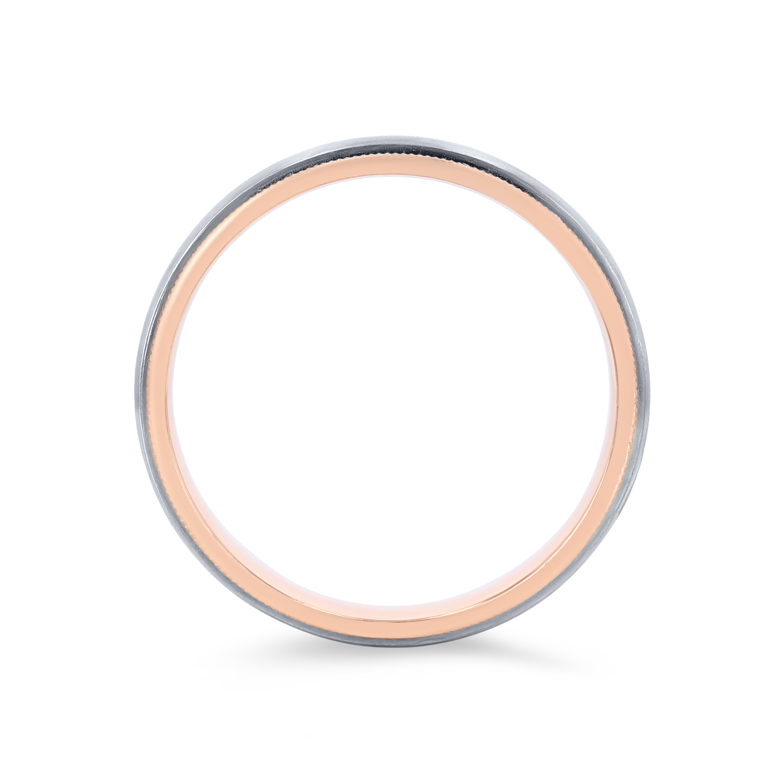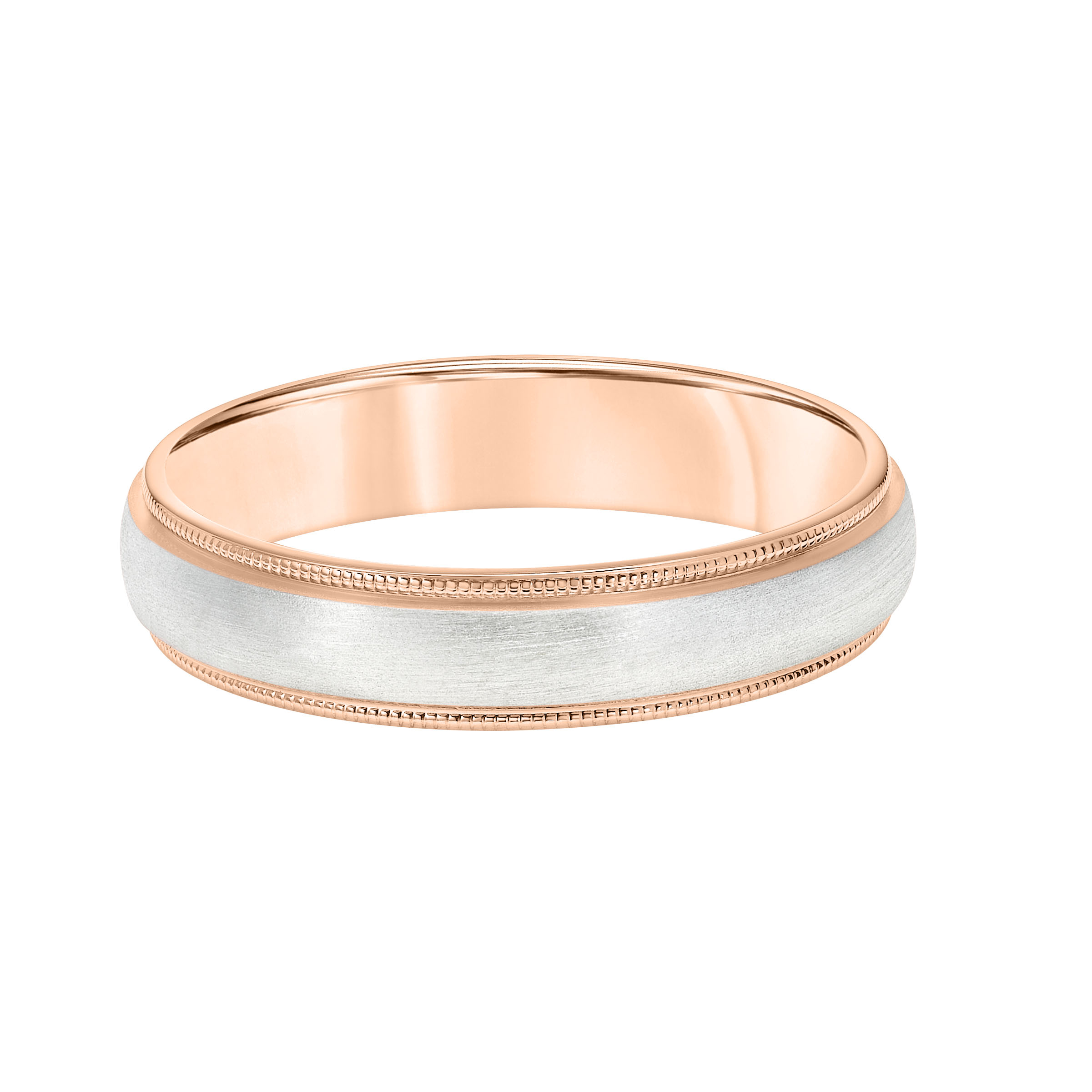Product Description Crafted with delicate milgrain edges, this wedding band features two tones of gold in a matte finish. It measures five millimeters wide. Other Details Metal Color: Two Tone Metal Color: Rose Gold Men Wedding Band Type: Milgrain Gents Wedding Band Style: Classic Metal Color: White Gold Disable Reason: None Metal Color: Yellow Gold Type: Gents Wedding Band