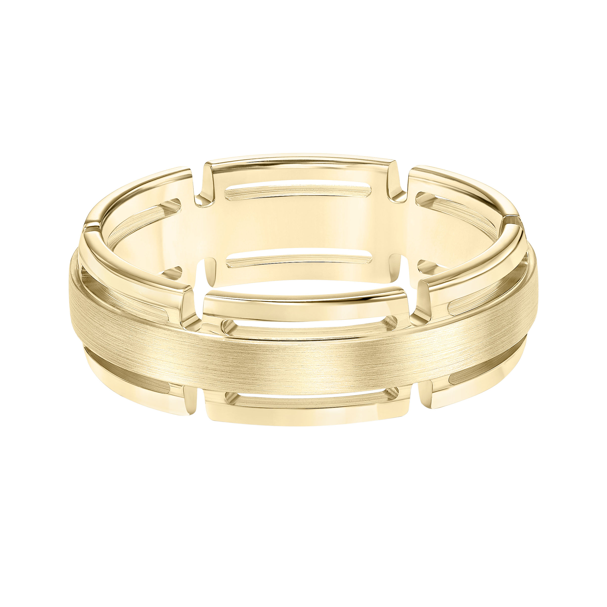 Product Description This modern wedding band features an open concept link design with a matte finish center, measuring seven millimeters wide. Other Details Type: Gents Wedding Band Gents Wedding Band Style: Engraved Finish: Matte Style: Contemporary