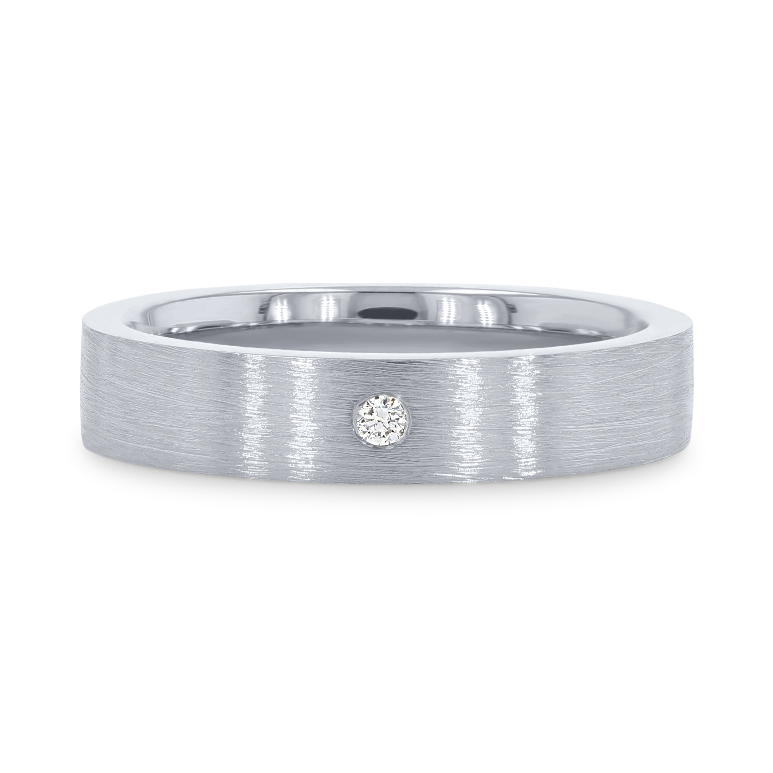 Sleek and modern, this four-millimeter wide matte band holds a single round brilliant cut diamond weighing 0.02 carats.