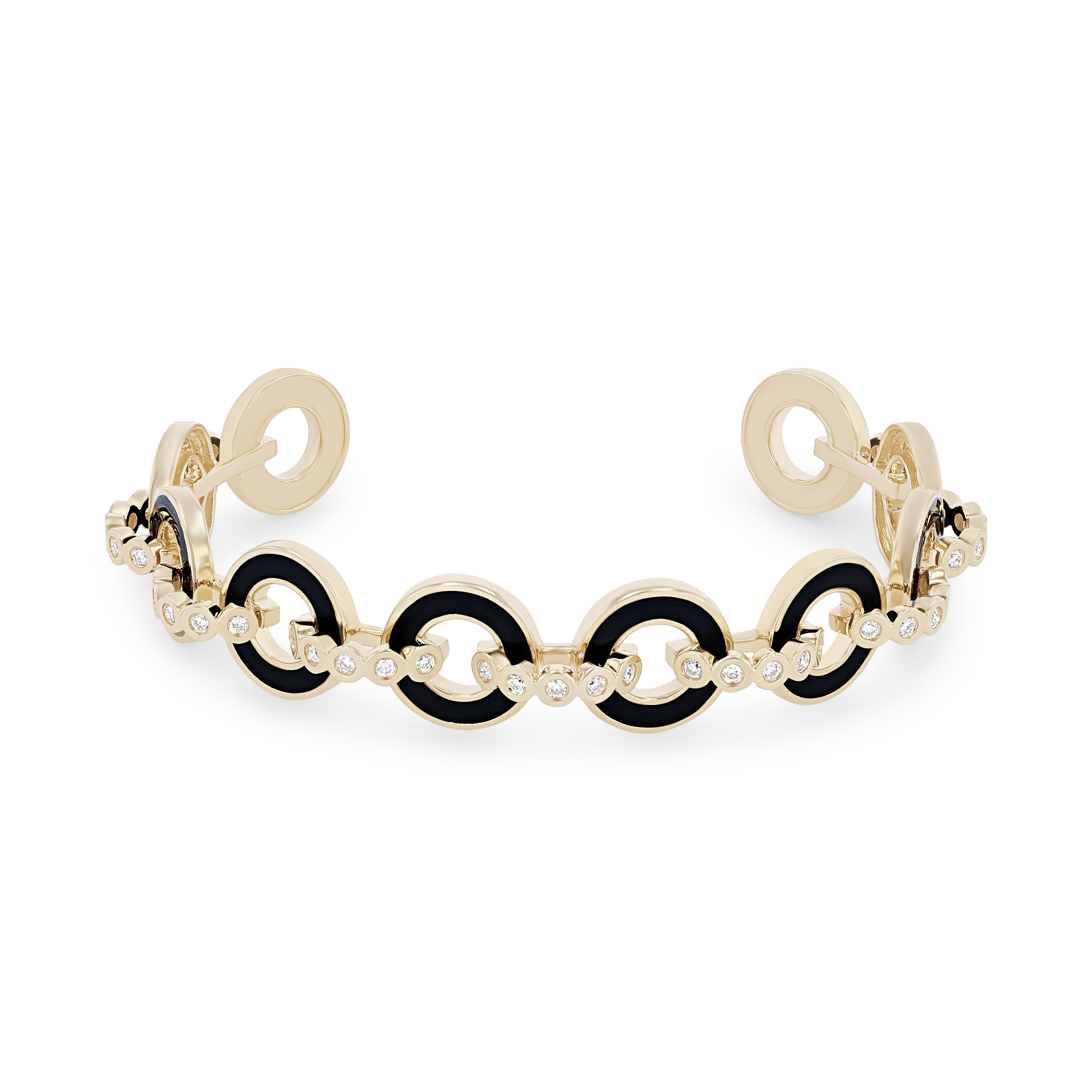 Product Description Make a statement with this unique cuff bangle by Michael M. accented with 0.68 carats of round brilliant cut diamonds and black enamel. Other Details Metal Color: Yellow Gold Gemstone Type: Diamond Disable Reason: None Bracelet Type: Bangles Style: Contemporary Total Setting Diamond Carat Weight: 0.68TW Type: Bracelet