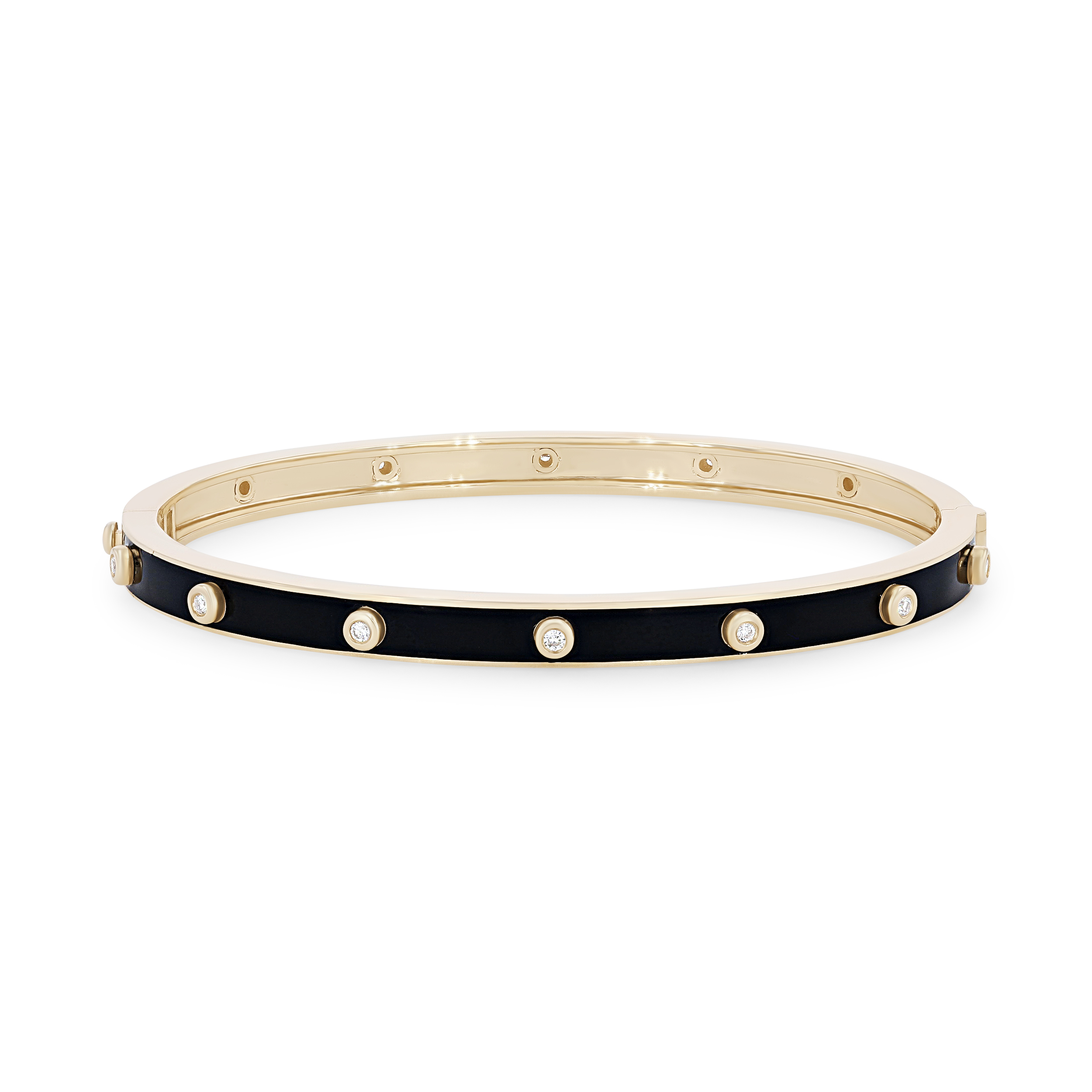 Product Description Crafted with sleek black enamel, this bangle by Michael M. features bezel set round brilliant cut diamonds totaling 0.21 carats. Other Details Disable Reason: None Metal Color: Yellow Gold Type: Bracelet Total Setting Diamond Carat Weight: 0.21TW Gemstone Type: Diamond Bracelet Type: Bangles Style: Contemporary