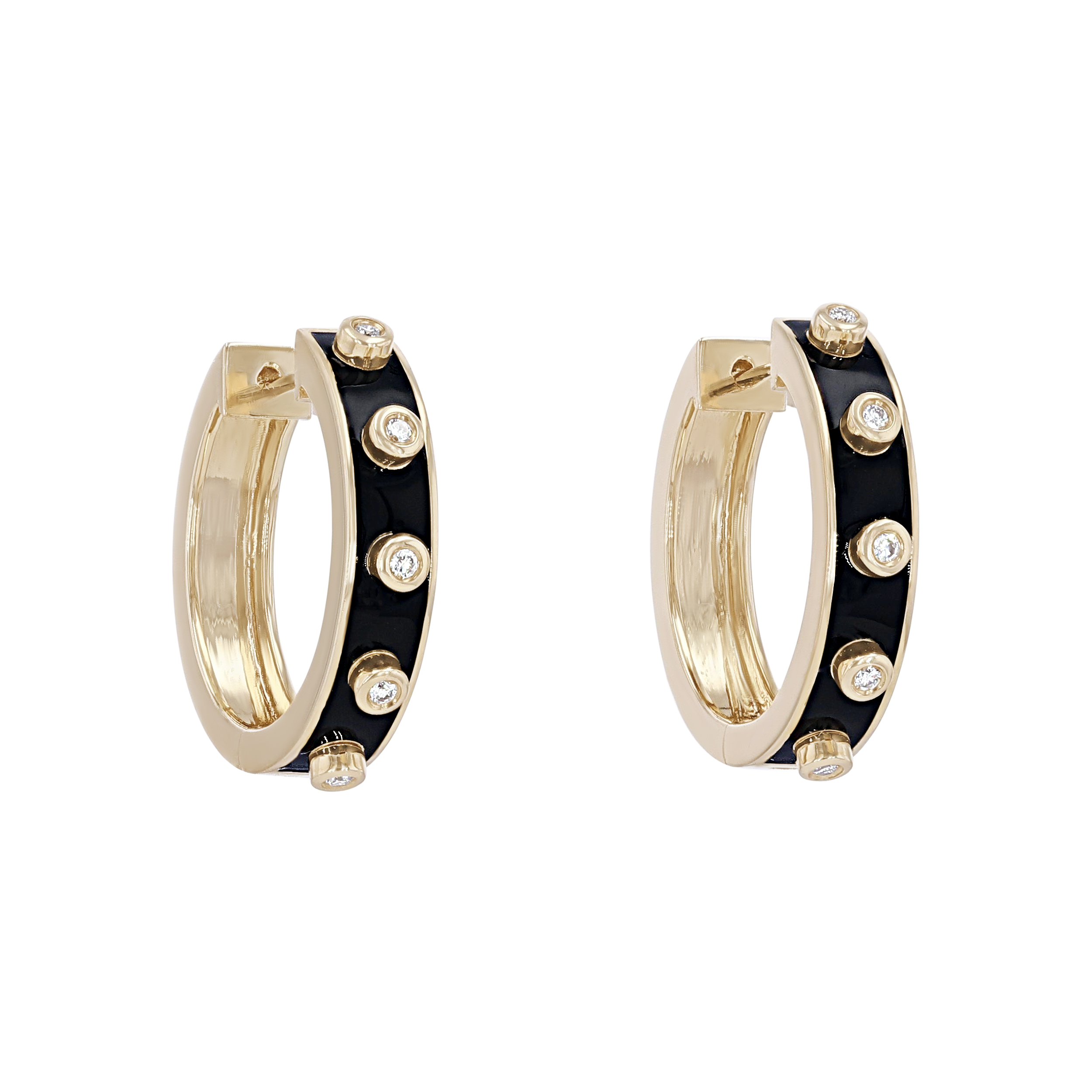 Product Description Crafted with sleek black enamel, these huggie earrings by Michael M. features bezel round brilliant cut diamonds totaling 0.09 carats. Other Details Style: Contemporary Total Setting Diamond Carat Weight: 0.09TW Gemstone Type: Diamond Metal Color: Yellow Gold Disable Reason: None Earring Type: Hoops & Huggies Type: Earrings