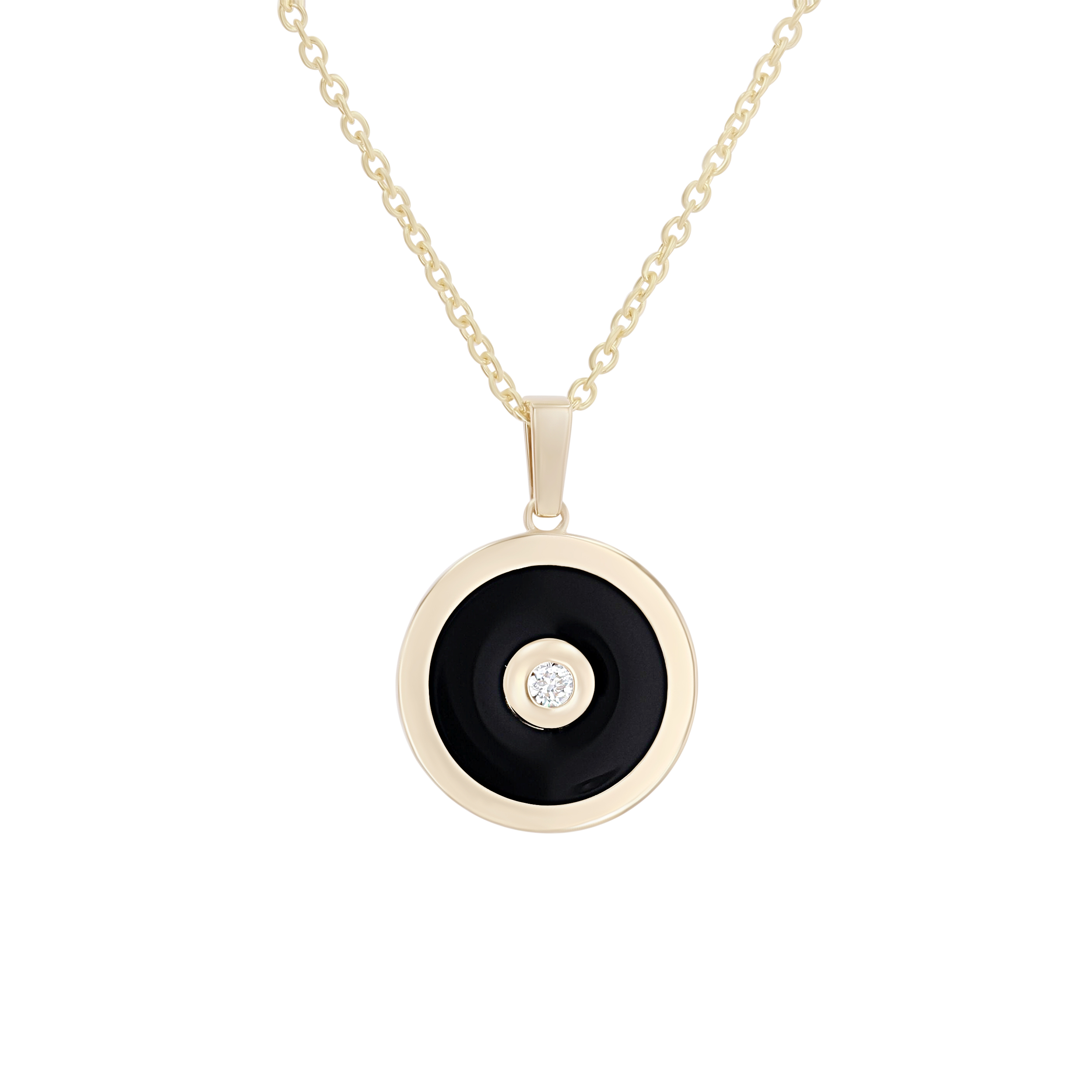 Product Description A singe bezel set round brilliant cut diamond weighing 0.05 carats is surrounded by beautiful black enamel. Other Details Disable Reason: None Length: 18 IN Necklace Type: Fashion Pendant Type: Circle Total Setting Diamond Carat Weight: 0.05TW Type: Necklace Gemstone Type: Diamond Metal Color: Yellow Gold Style: Contemporary
