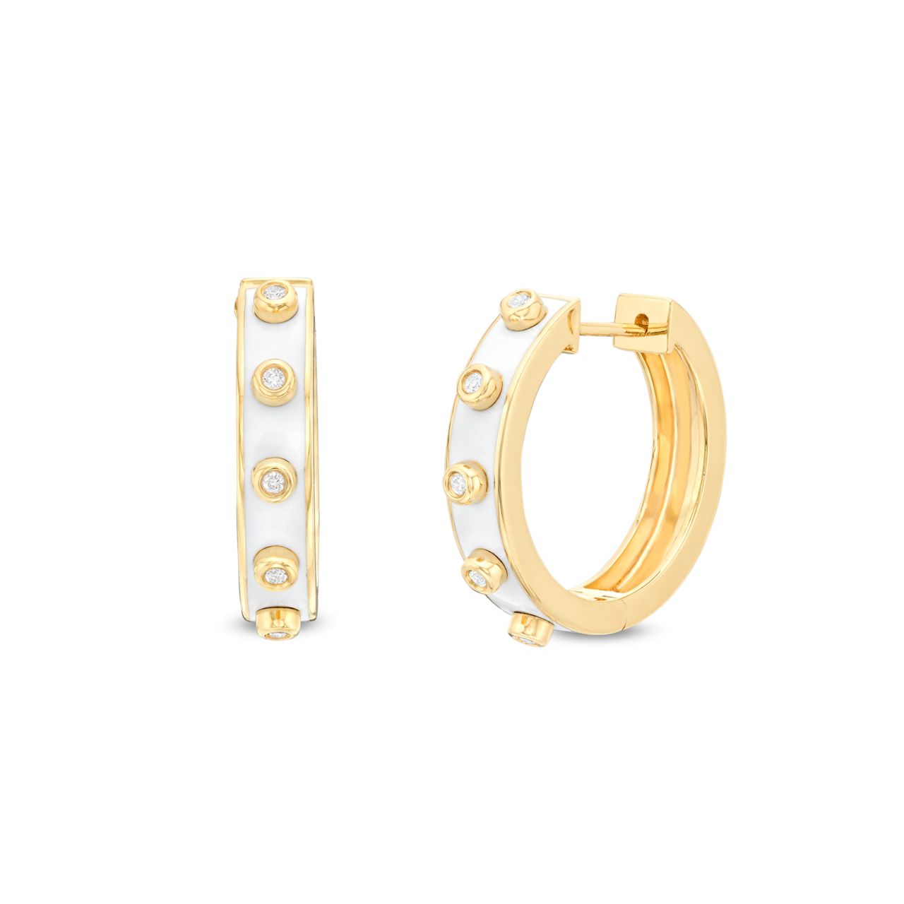 Product Description Crafted with sleek white enamel, these huggie earrings by Michael M. features bezel round brilliant cut diamonds totaling 0.09 carats. Other Details Earring Type: Hoops & Huggies Disable Reason: None Gemstone Type: Diamond Type: Earrings Style: Contemporary Metal Color: Yellow Gold Total Setting Diamond Carat Weight: 0.09TW