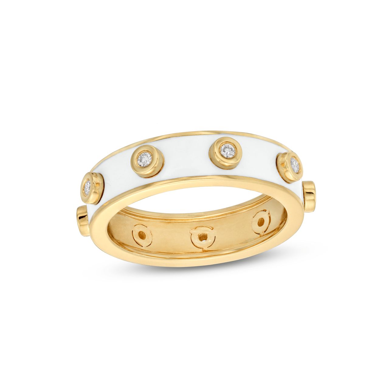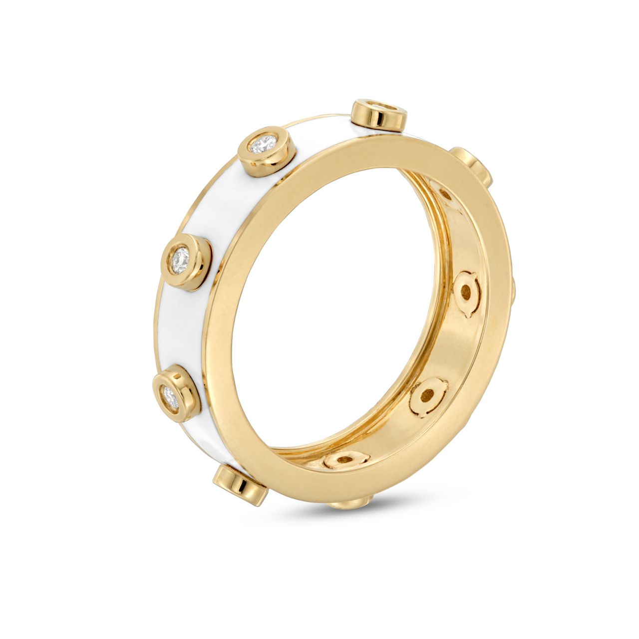 Product Description Crafted with striking white enamel, this bezel ring by Michael M. is accented with round brilliant cut diamonds totaling 0.14 carats. Other Details Total Setting Diamond Carat Weight: 0.14TW Type: Ring Style: Contemporary Ring Type: Fashion Disable Reason: None Gemstone Type: Diamond Metal Color: Yellow Gold
