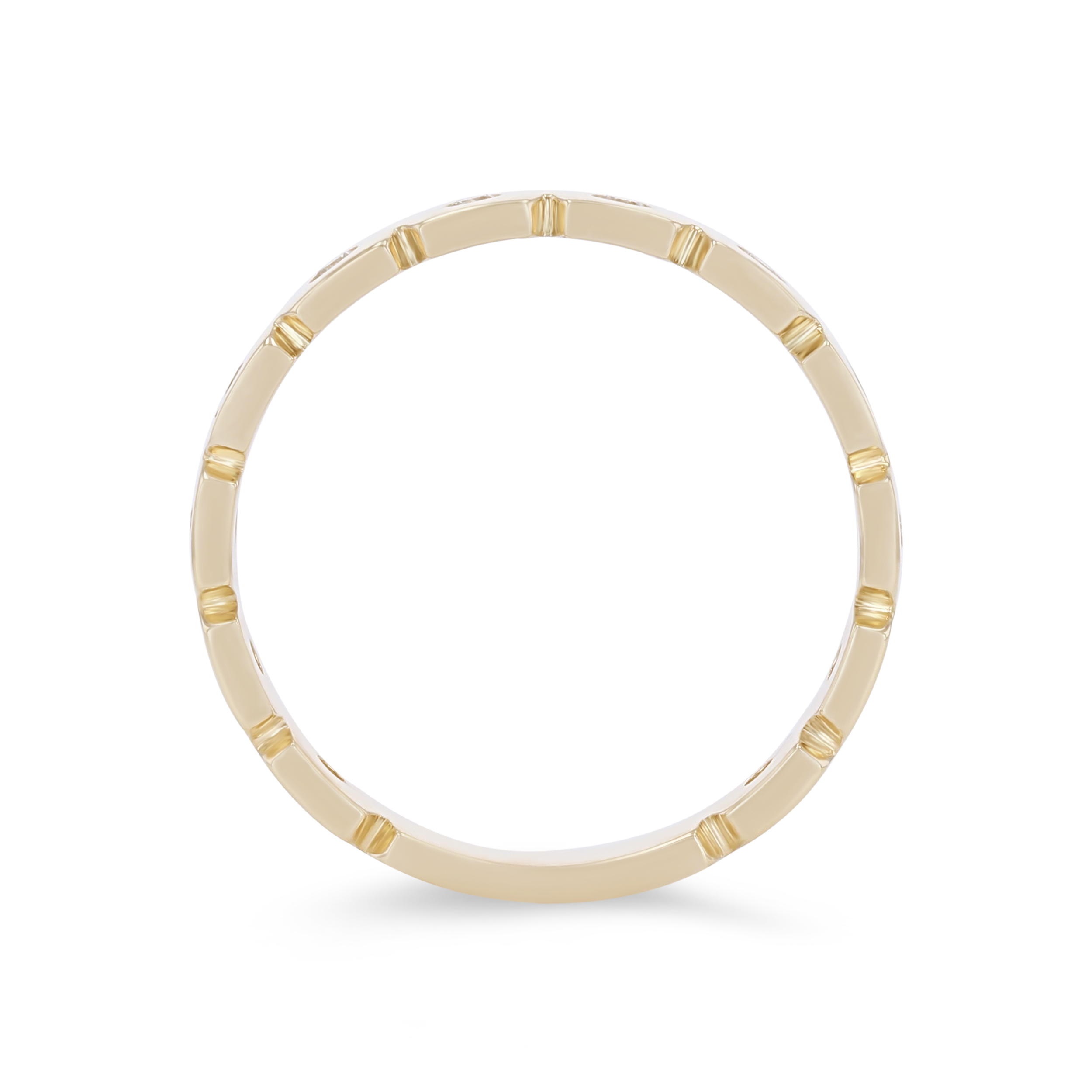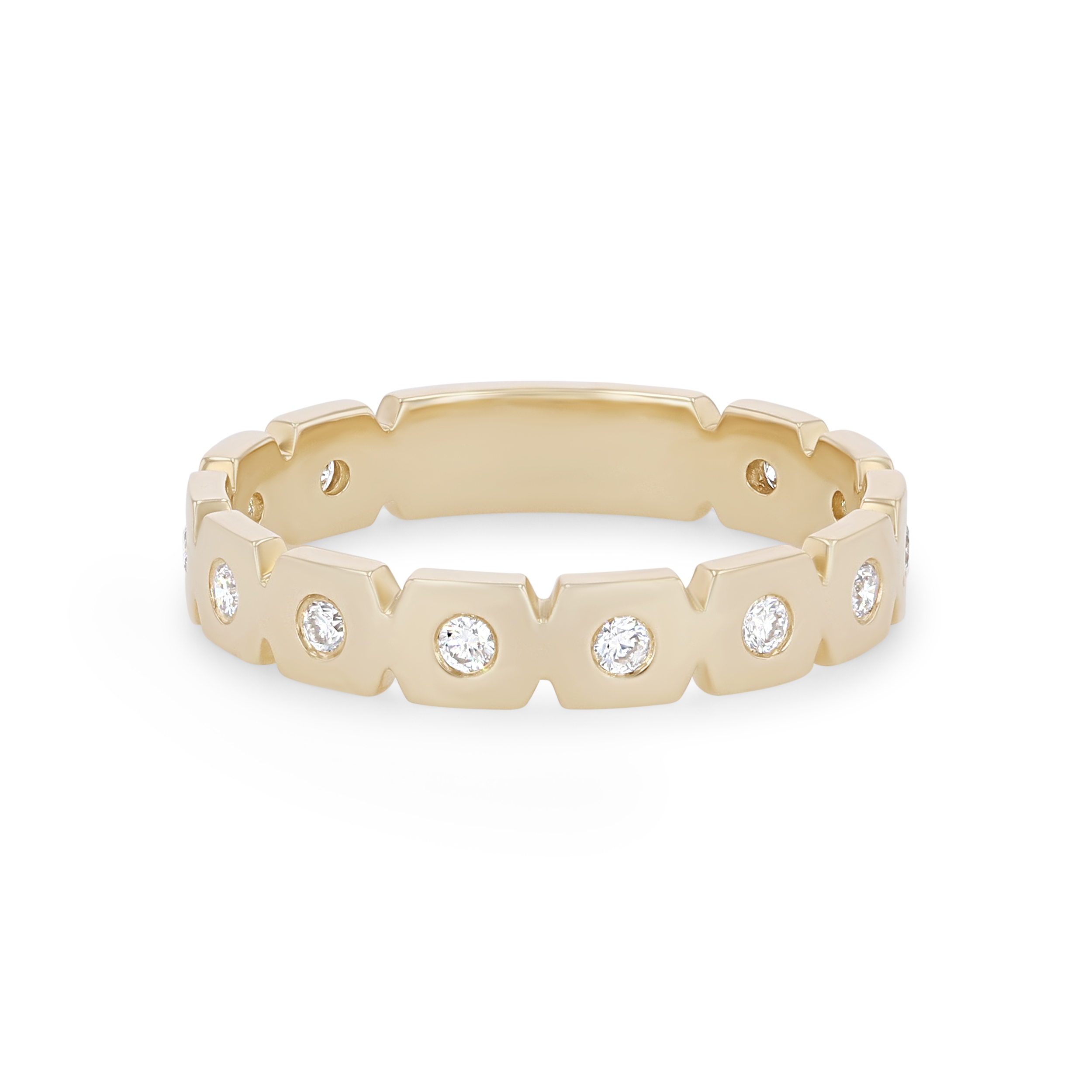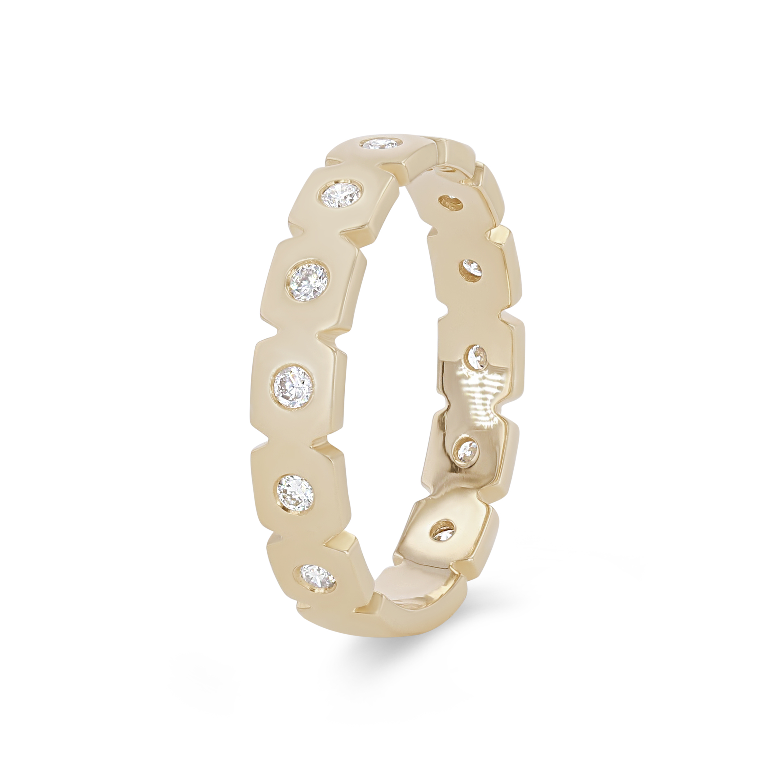 Product Description Ultra modern and sleek, this eternity band by Michael M. features a hexagonal design with round brilliant cut diamonds totaling 0.18 carats. Other Details Style: Contemporary Type: Ladies Wedding Band Total Setting Diamond Carat Weight: 0.18TW Metal Color: Yellow Gold Gemstone Type: Diamond Ring Type: Fashion Millimeter Width: 4 mm Wedding Band Type: Bezel Diamond: Stackable Disable Reason: None