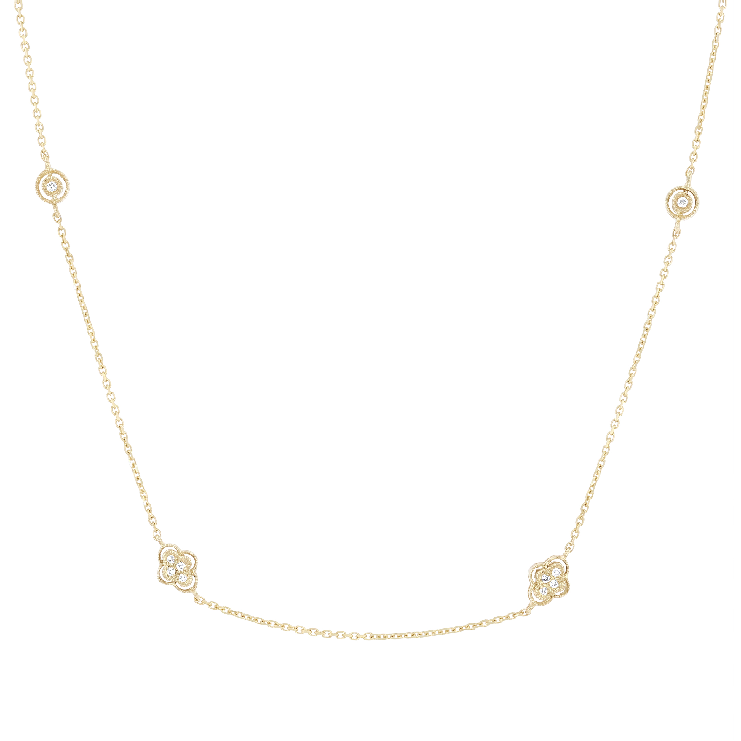 Product Description Perfect to dress up any occasion, this necklace features stations of round brilliant cut diamonds totaling 0.26 carats framed by milgrain detail. It measures 18 inches long. Other Details Length: 18 IN Disable Reason: None Total Setting Diamond Carat Weight: 0.26TW Necklace Type: Fashion Type: Necklace Style: Contemporary Metal Color: White Gold Metal Color: Yellow Gold Pendant Type: Station Gemstone Type: Diamond