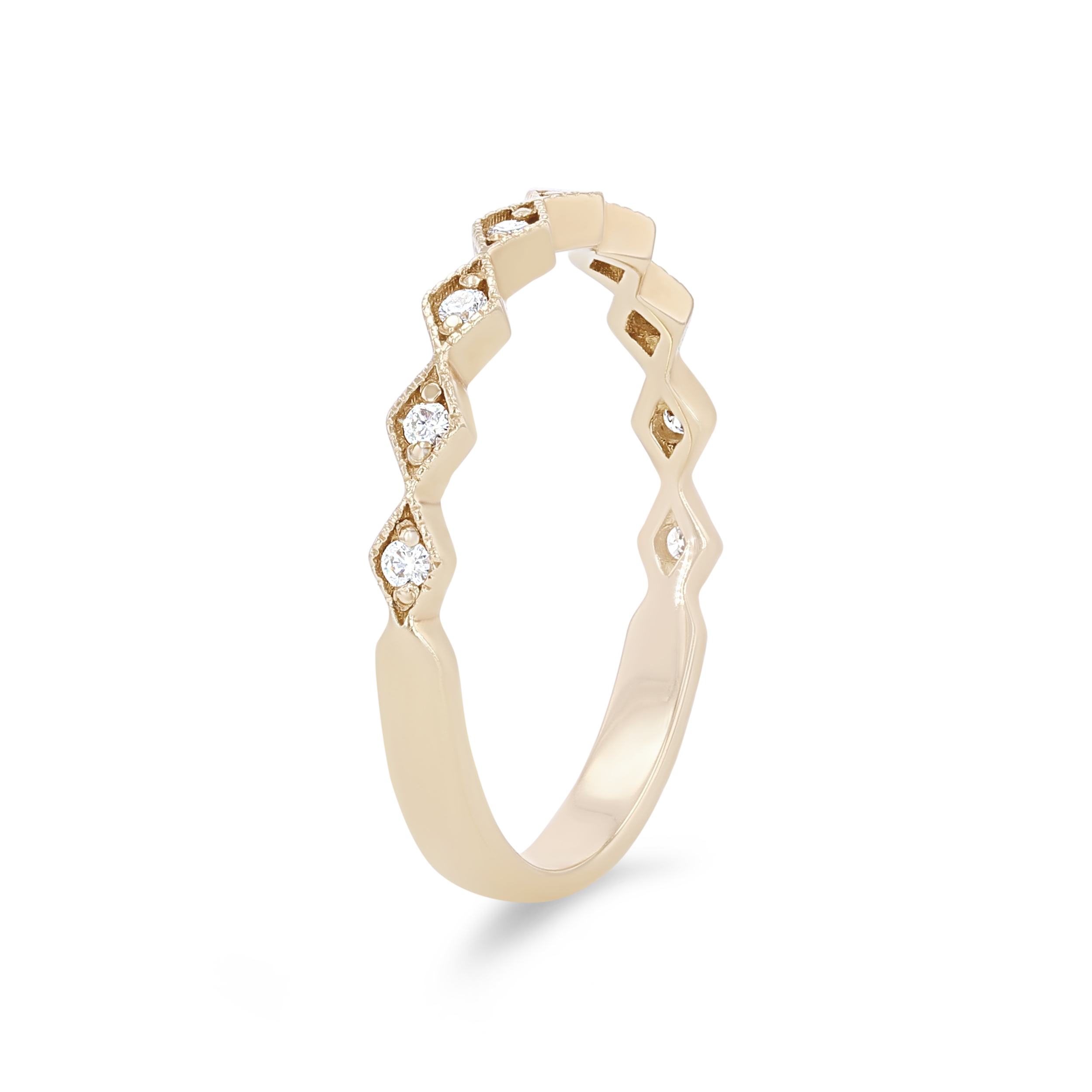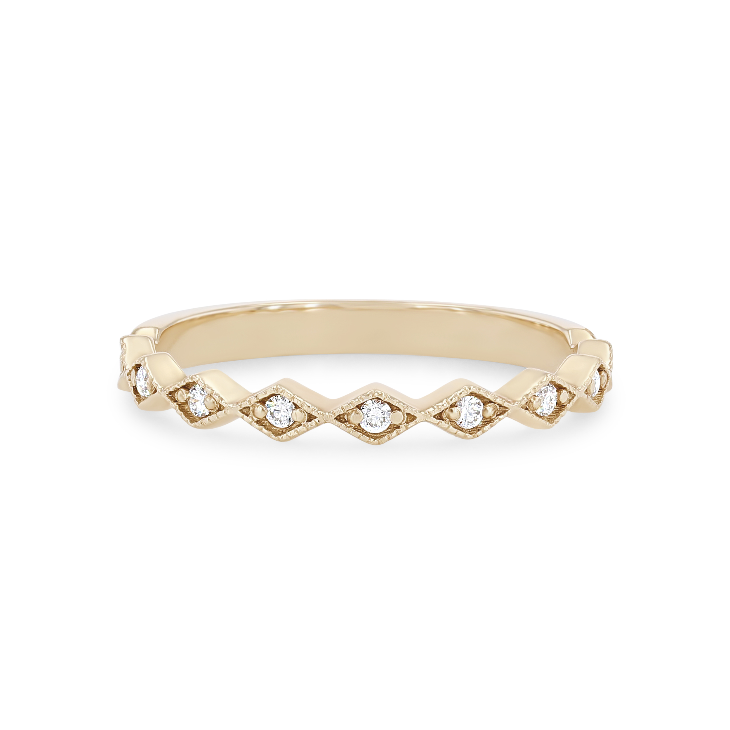 Product Description Geometric shapes surround the 0.10 total carats of round brilliant cut diamonds, complete with dainty milgrain edges. Other Details Metal Color: Rose Gold Metal Color: Platinum Metal Color: White Gold Total Setting Diamond Carat Weight: 0.1TW Gemstone Type: Diamond Disable Reason: None Metal Color: Yellow Gold Style: Vintage Type: Ladies Wedding Band Wedding Band Type: Stackable