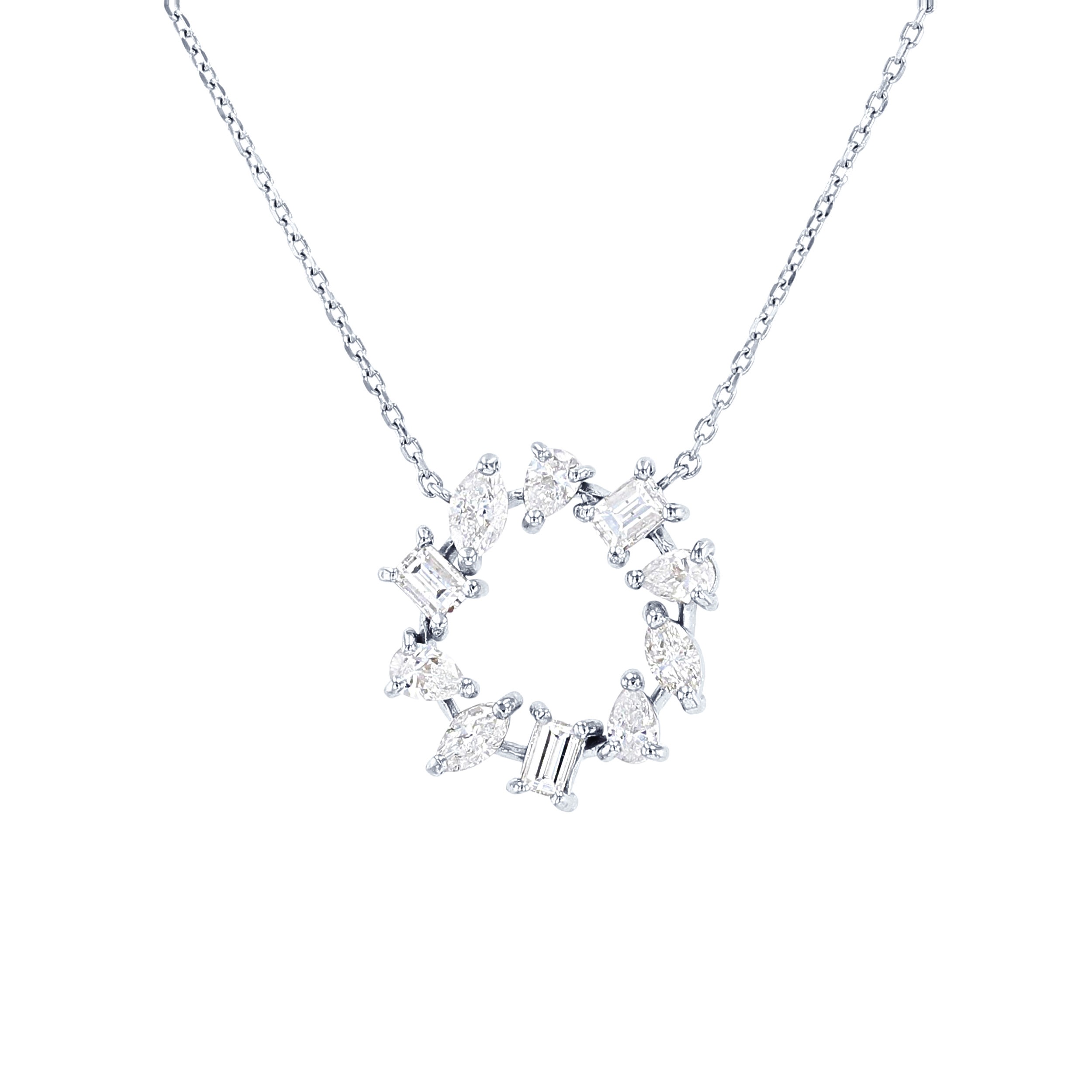 Product Description This contemporary circle pendant features a variety of diamond cuts including emerald, pear, and marquise. They all total 0.61 carats. Other Details Disable Reason: None Gemstone Type: Diamond Length: 17 IN Metal Color: White Gold Type: Necklace Necklace Type: Fashion Pendant Type: Circle Style: Contemporary Total Setting Diamond Carat Weight: 0.61TW