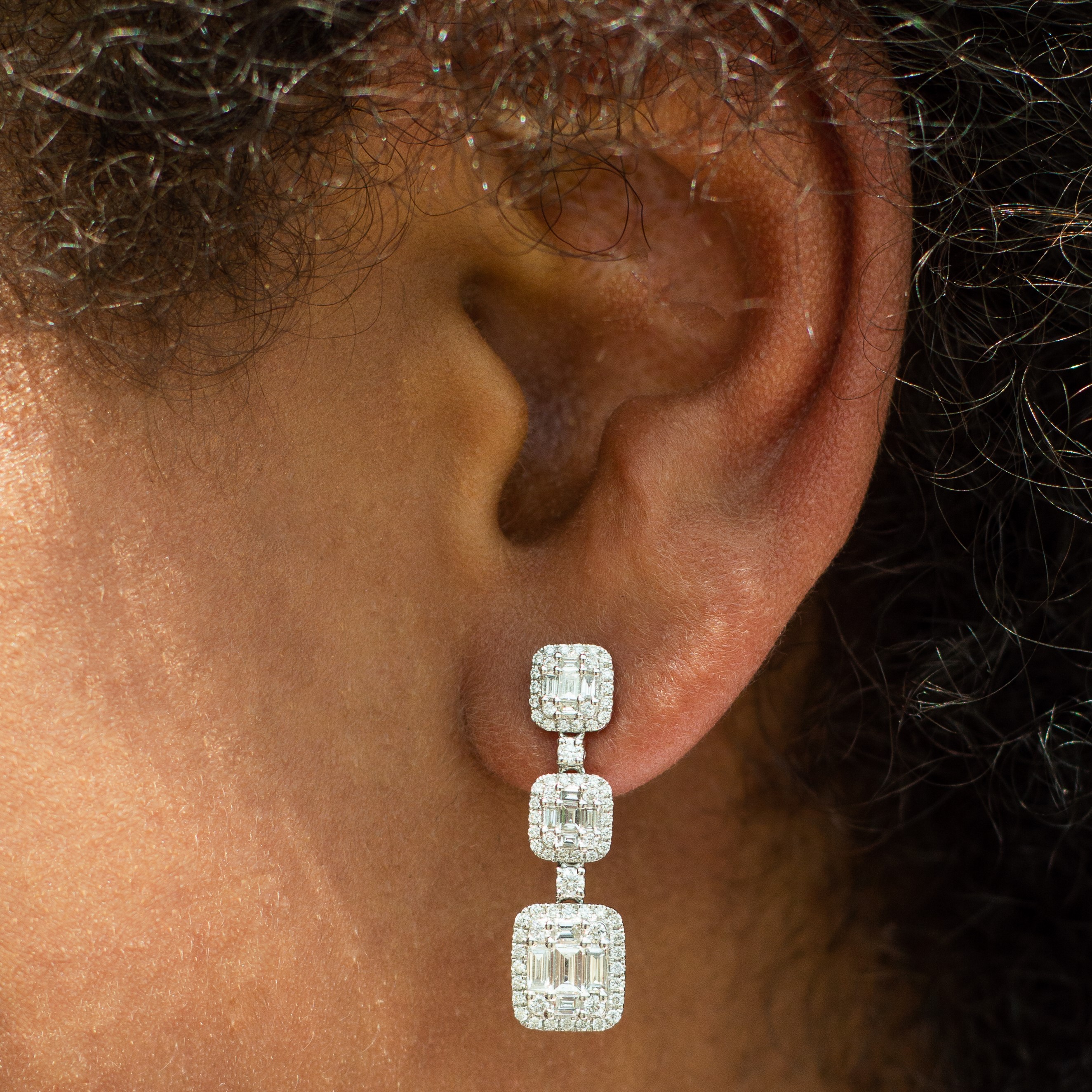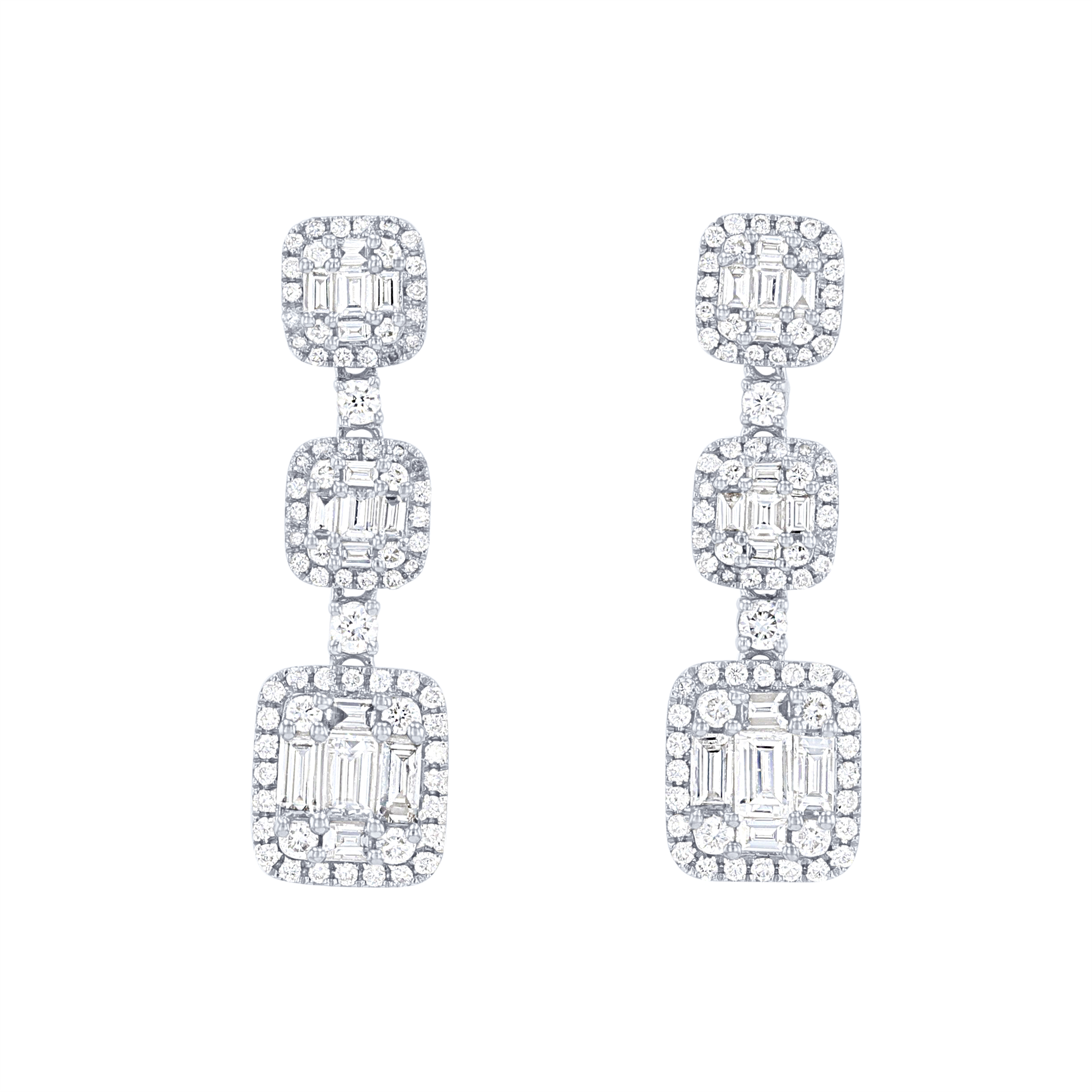 Product Description Crafted in an intricate mosaic design, these earrings features 0.70 carats of baguette cut diamonds and 0.67 carats of round brilliant cut diamonds. Other Details Total Setting Diamond Carat Weight: 1.37TW Style: Contemporary Disable Reason: None Metal Color: White Gold Earring Type: Dangle Type: Earrings Gemstone Type: Diamond