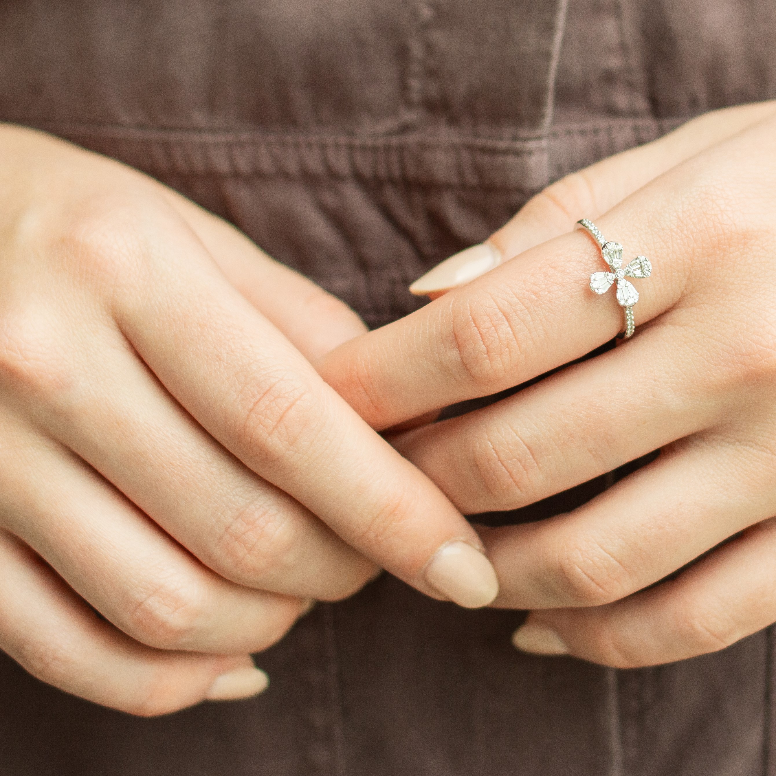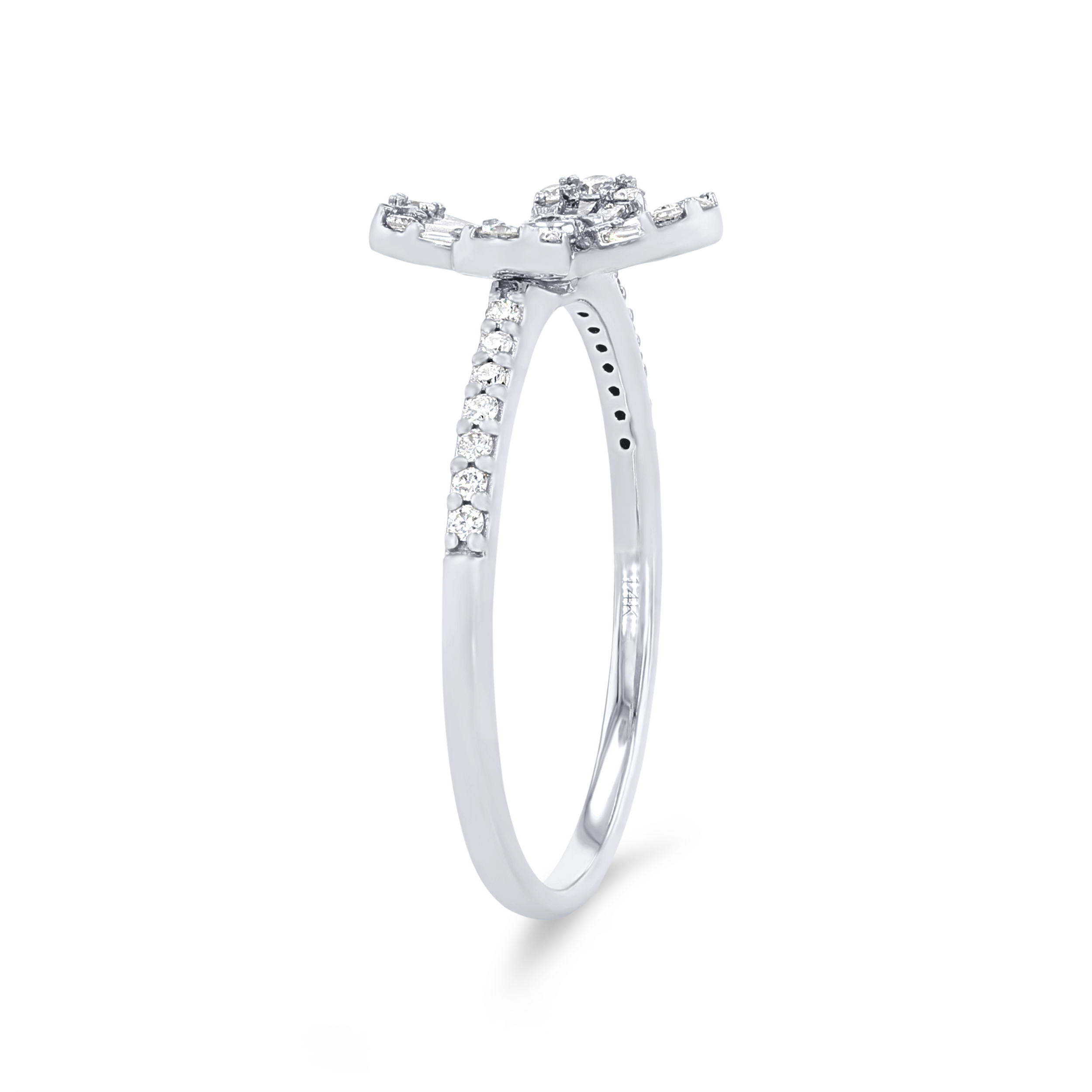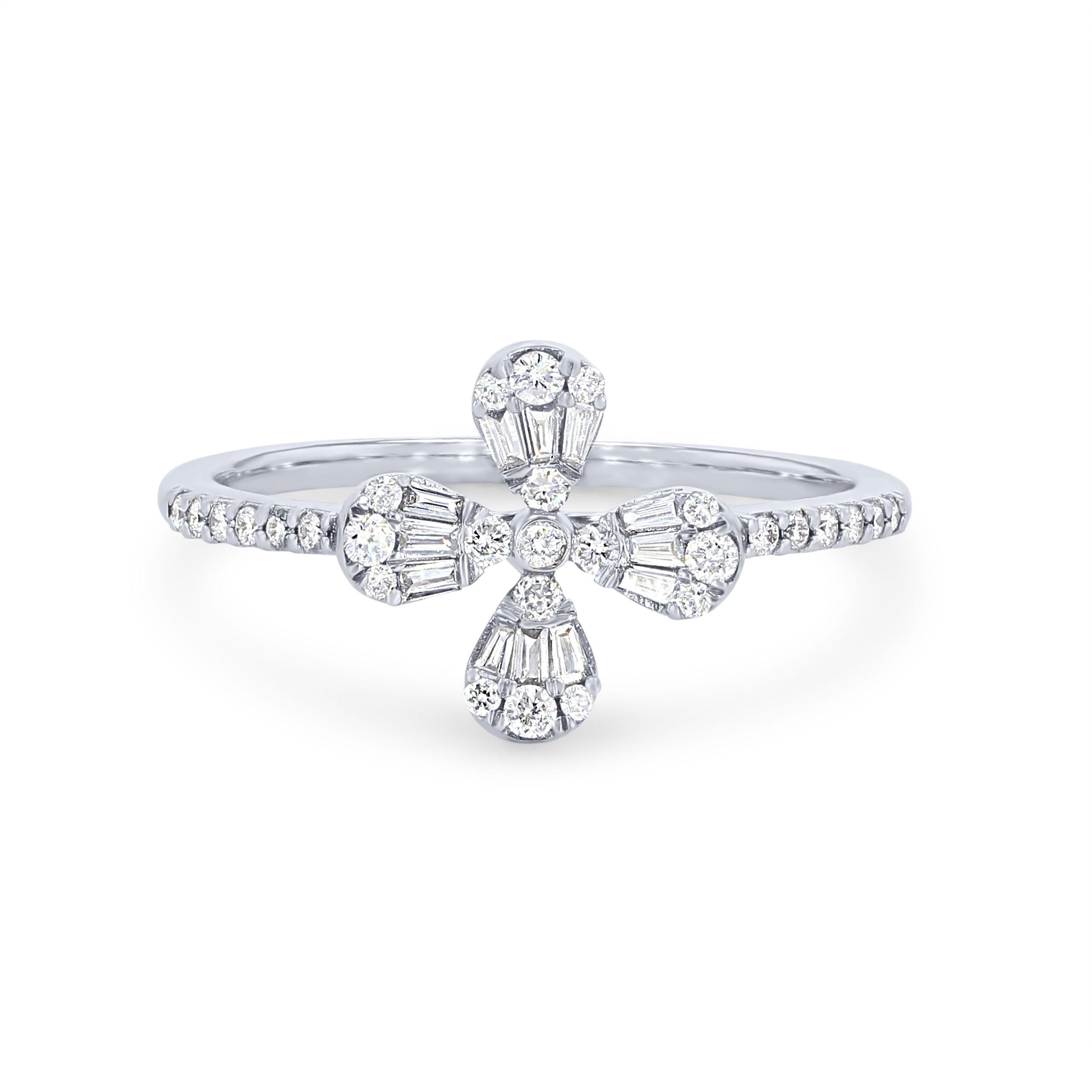 Product Description Delicately crafted in a flower design, this ring features a mosaic style setting of round brilliant cut and baguette cut diamonds all totaling 0.30 carats. Other Details Metal Color: Rose Gold Total Setting Diamond Carat Weight: 0.3TW Type: Ring Gemstone Type: Diamond Metal Color: White Gold Metal Color: Yellow Gold Ring Type: Fashion Style: Contemporary Disable Reason: None