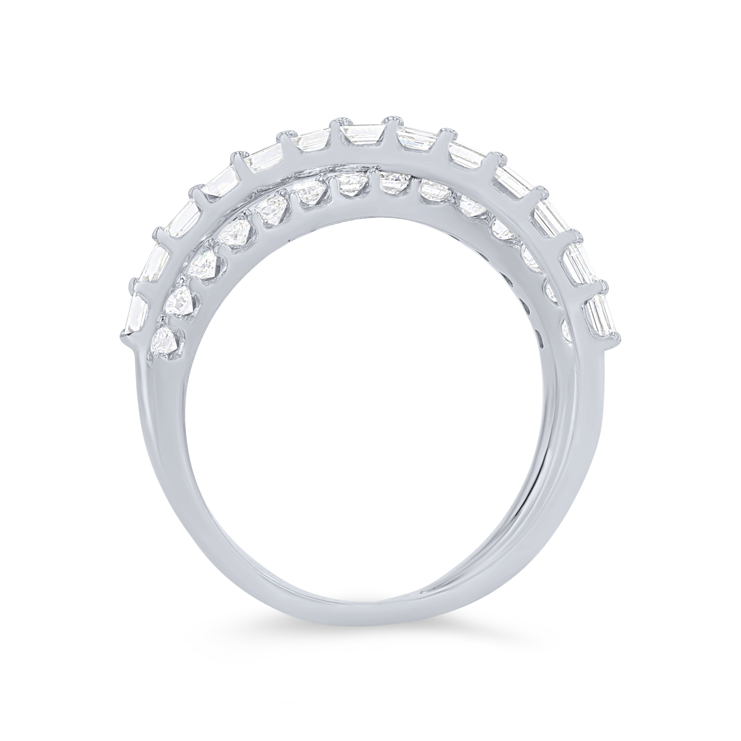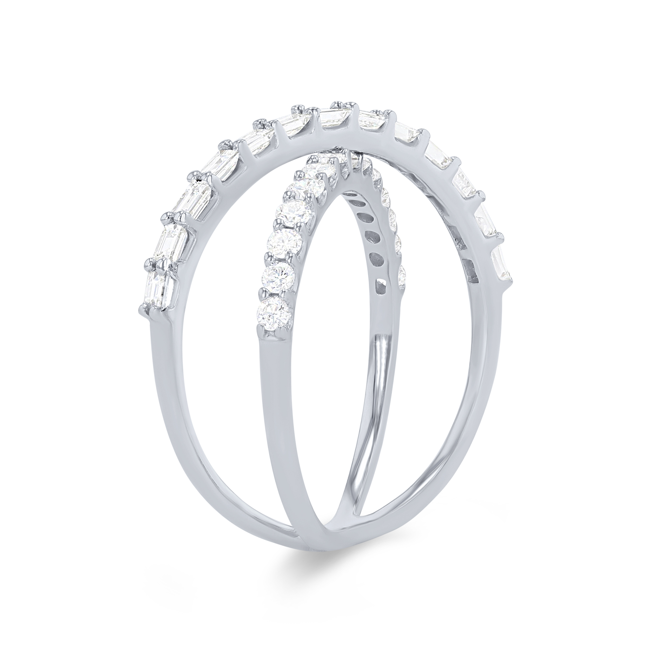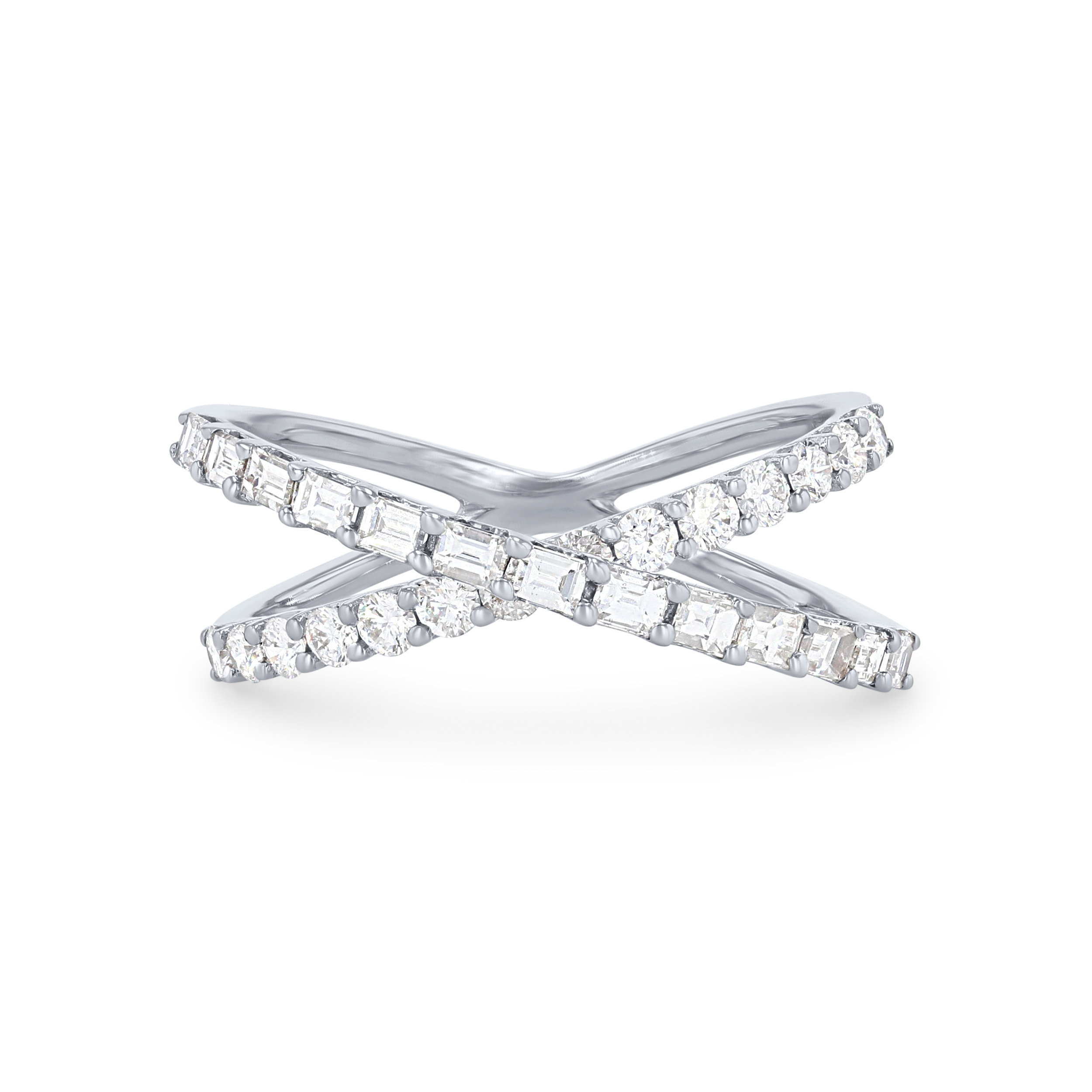 A beautiful contemporary piece, this "X" style ring features a row of baguette cut diamonds and round brilliant cut diamonds intersecting, all totaling 0.80 carats.