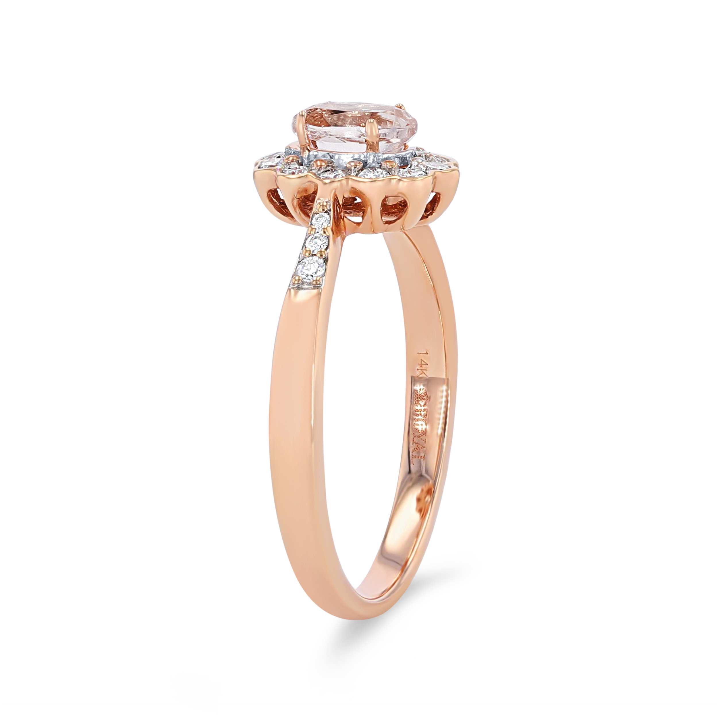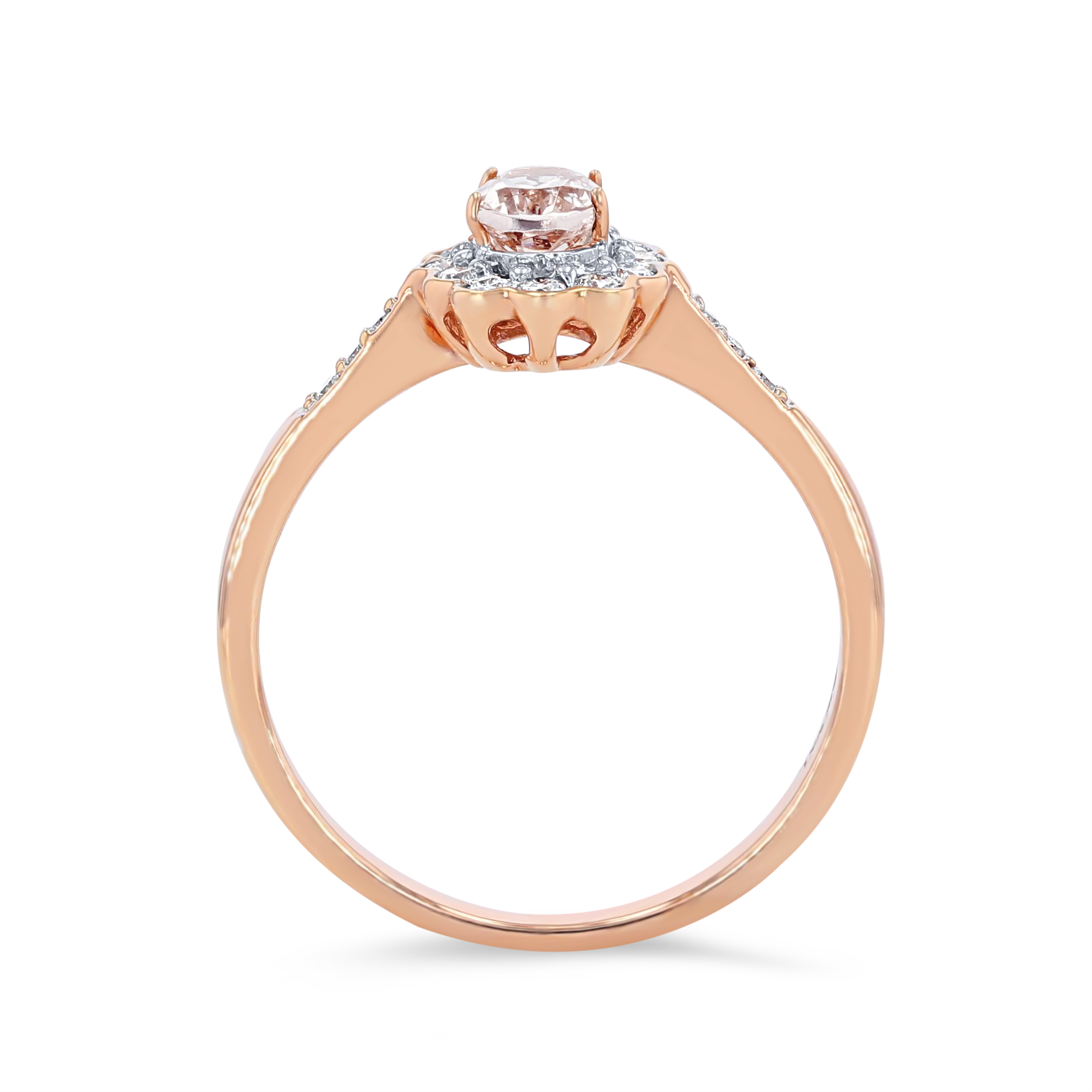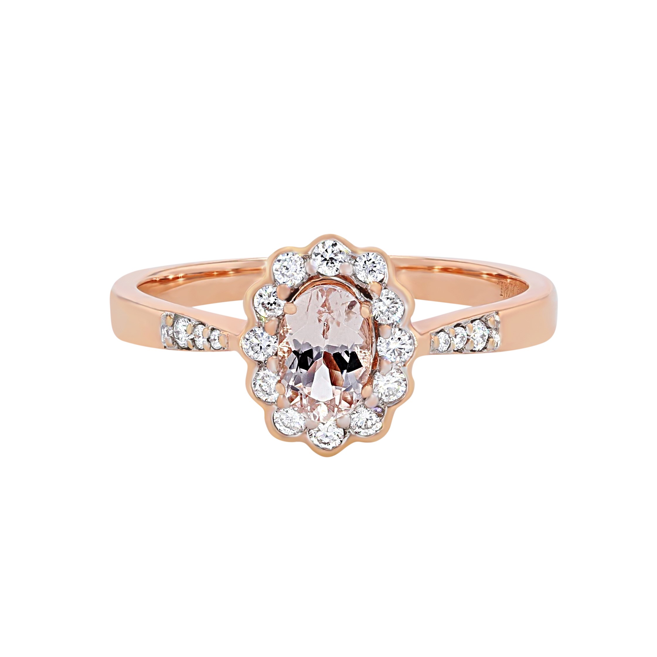 Product Description This dainty ring features a beautiful oval cut morganite weighing 0.40 carats surrounded by a scalloped floral inspired halo of round brilliant cut diamonds totaling 0.22 carats. Other Details Total Setting Diamond Carat Weight: 0.22TW Total Gemstone Carat Weight: 0.4TW Type: Ring Style: Contemporary Gemstone Type: Morganite Disable Reason: None Metal Color: Rose Gold Women Wedding Band Type: Gemstone