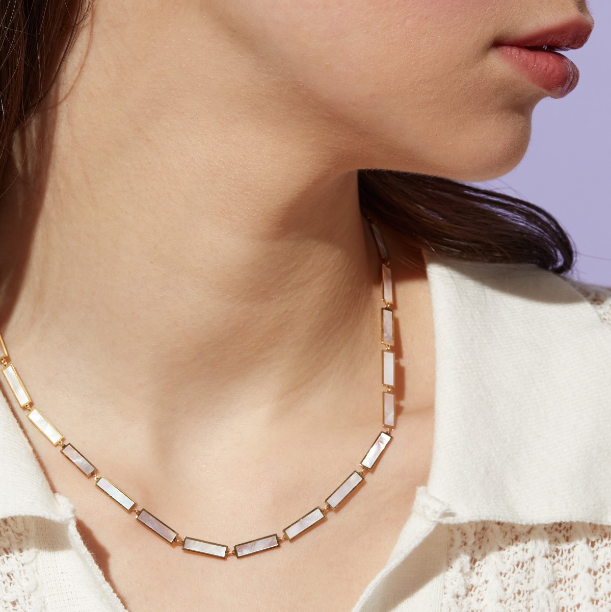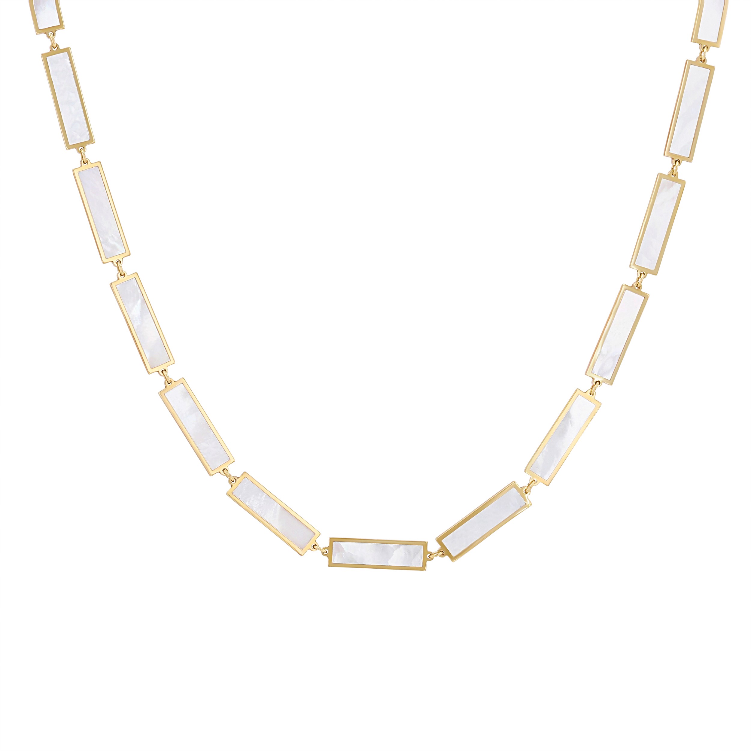 Product Description Beautiful segments of mother of pearl are outlined with 14 karat yellow gold, measuring 18 inches long. Other Details Type: Necklace Necklace Type: Fashion Disable Reason: None Style: Contemporary Gemstone Type: Pearl Metal Color: Yellow Gold Pendant Type: Gemstone Length: 18 IN