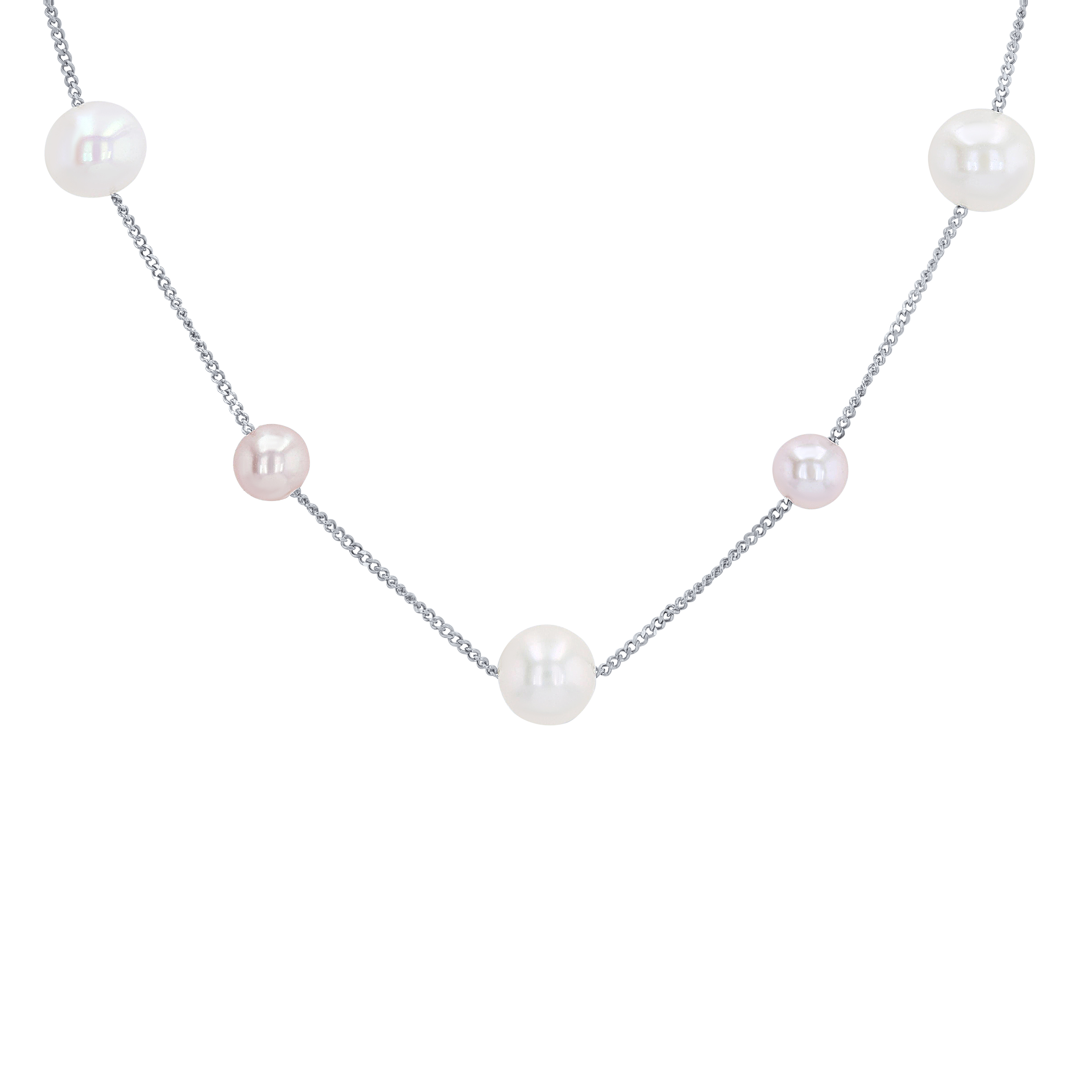 Product Description Alternating sizes and colors of pink and white freshwater pearls create a stunning tin cup necklace measuring 17 inches long. Other Details Women Wedding Band Type: Gemstone Pendant Type: Station Metal Color: White Gold Gemstone Type: Pearl Disable Reason: None Necklace Type: Fashion Length: 17 IN Type: Necklace Style: Contemporary