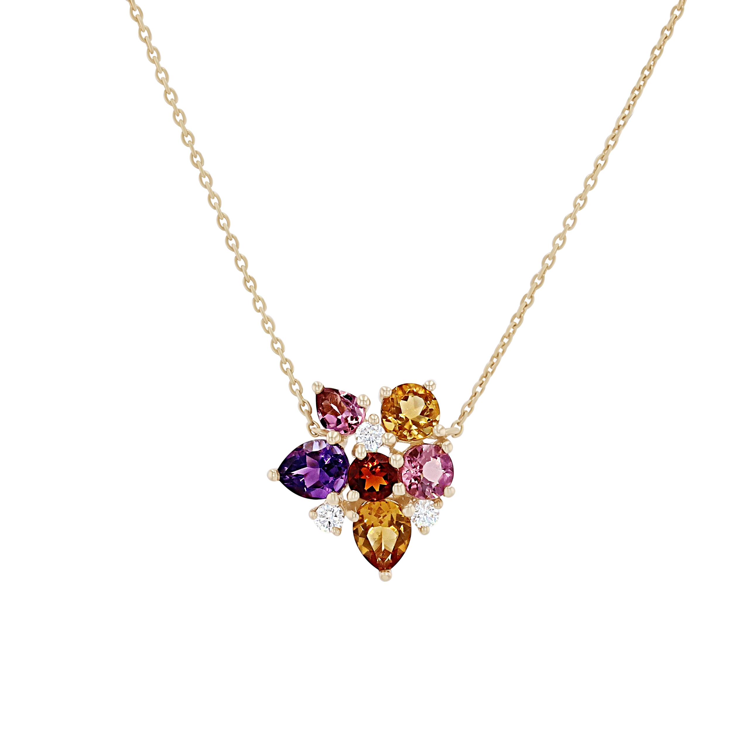 Full of color, this pendant features citrine, pink tourmaline, and amethyst all totaling 1.70 carats and round brilliant cut diamonds totaling 0.12 carats.