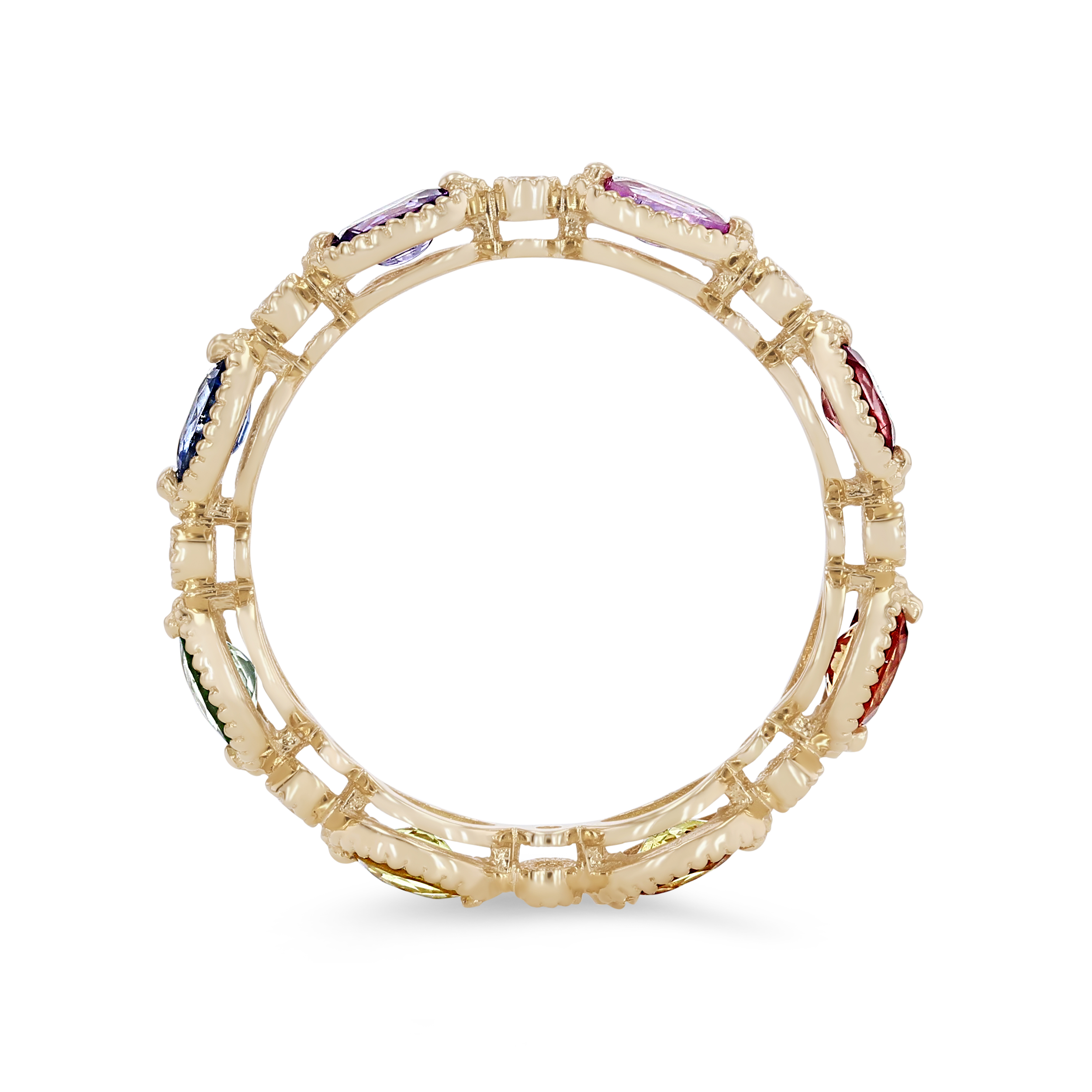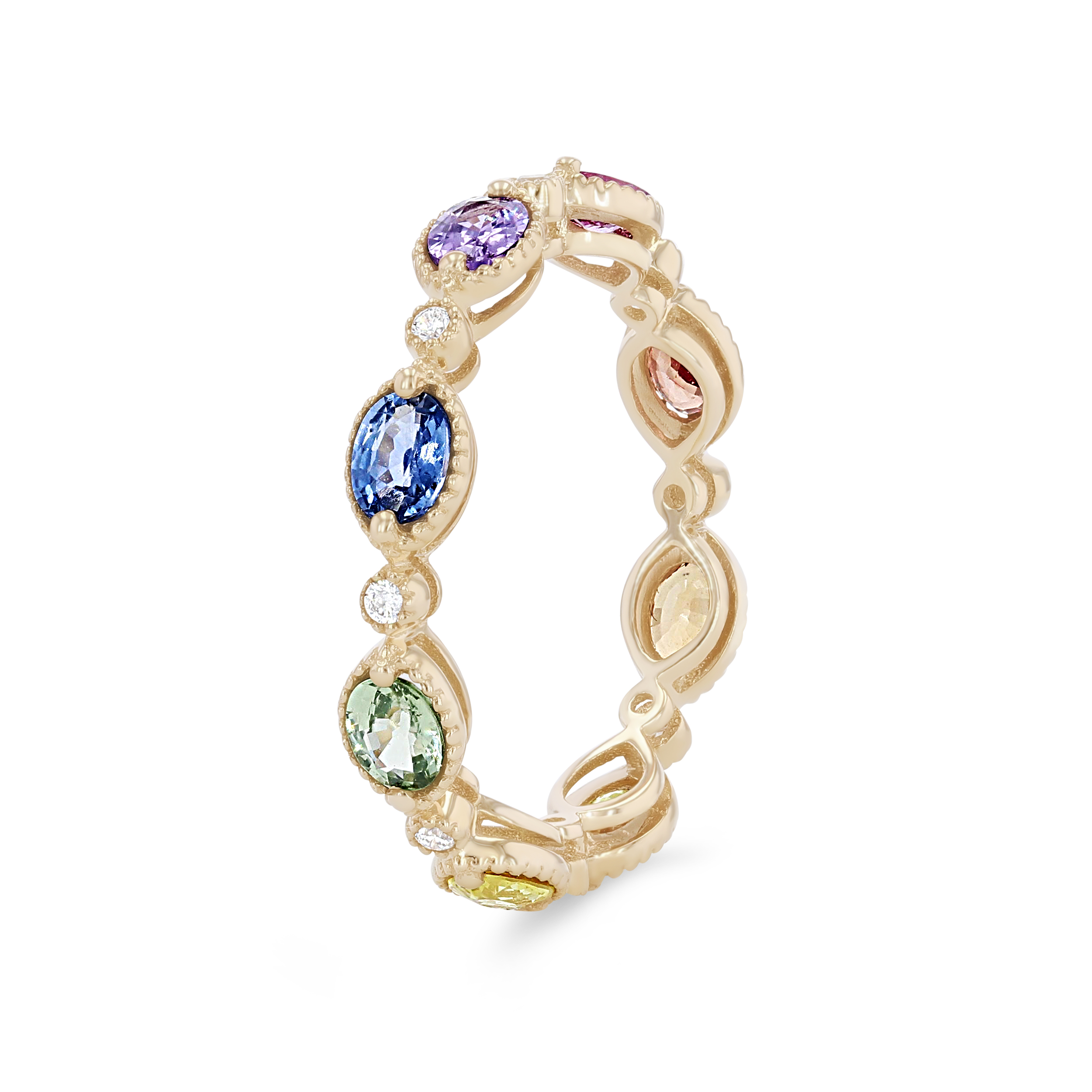 Product Description Wear a variety of colors with this beautiful eternity band, featuring 1.75 carats of sapphires alternating with 0.08 carats of round brilliant cut diamonds. Other Details Total Setting Diamond Carat Weight: 0.08TW Diamond: Eternity Metal Color: Yellow Gold Disable Reason: None Wedding Band Type: Fancy Shapes Women Wedding Band Type: Gemstone Style: Contemporary Total Gemstone Carat Weight: 1.75TW Type: Ladies Wedding Band Gemstone Type: Sapphire