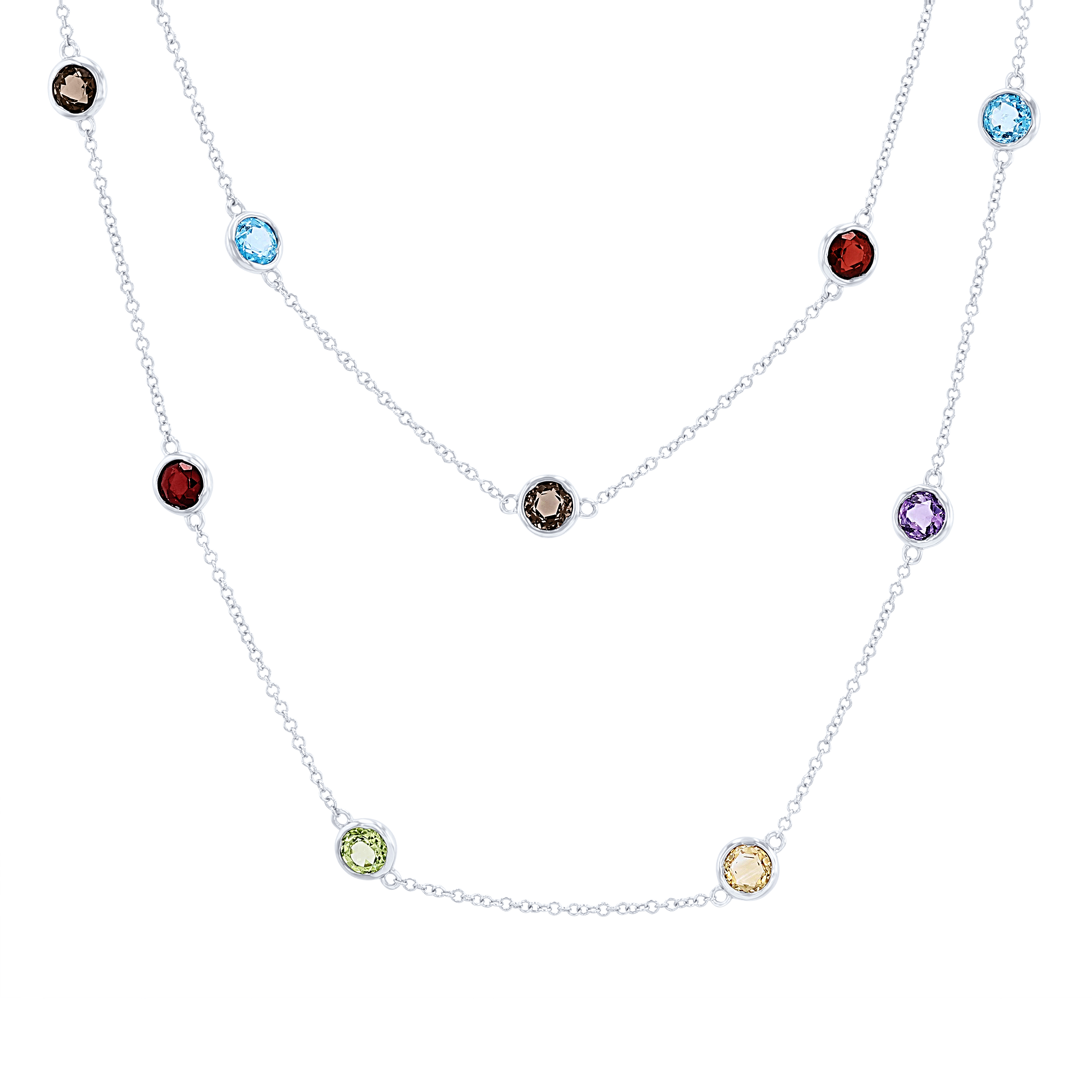 Product Description Perfect for the one that loves color, this station necklace features a variety of semi-precious gemstones all totaling 6.40 carats. Other Details Necklace Type: Fashion Type: Necklace Total Setting Diamond Carat Weight: 6.4TW Disable Reason: None Length: 36 IN Style: Contemporary Gemstone Type: Blue Topaz