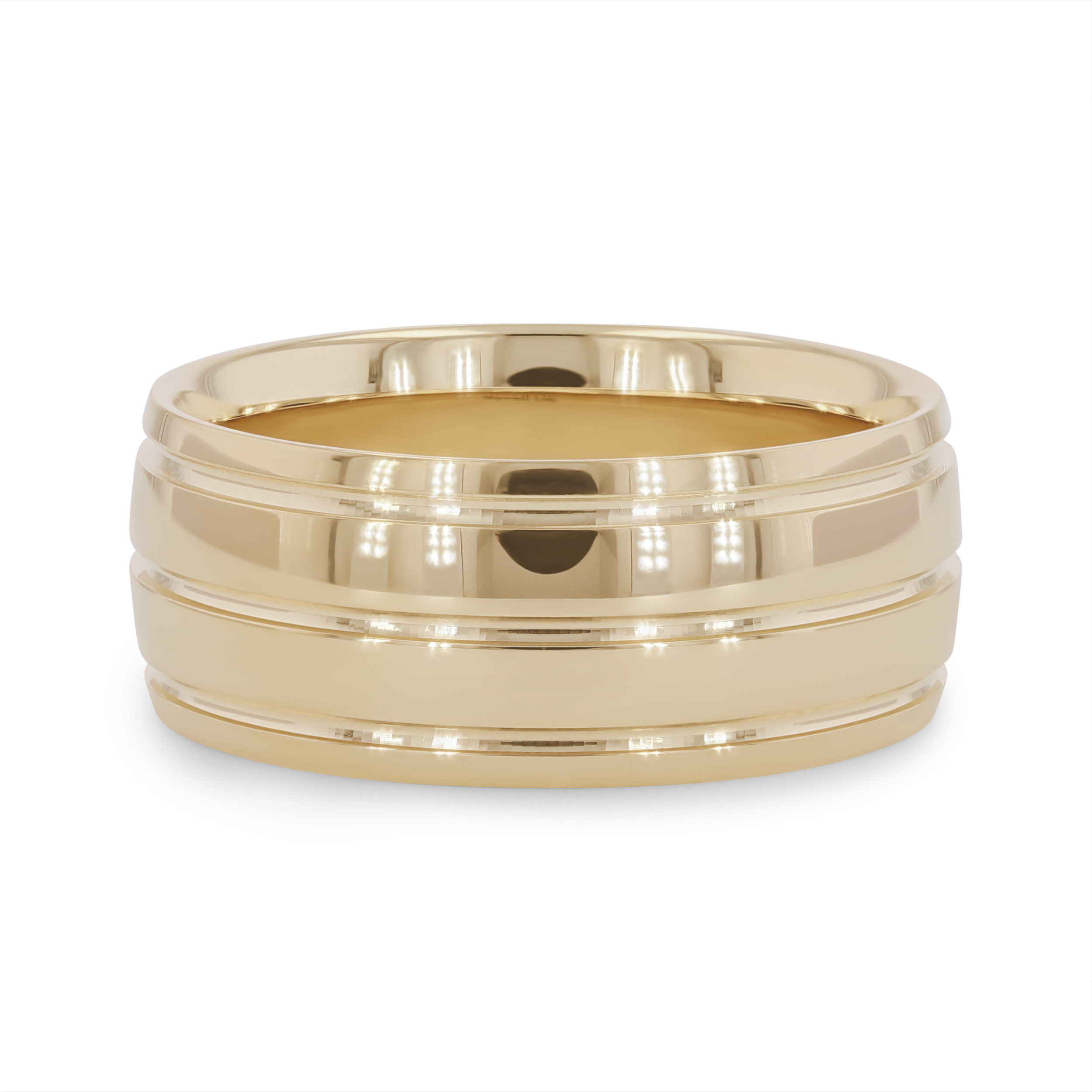 Product Description Make a statement with this nine millimeter wide wedding band featuring multiple rows of high-polished grooves. Other Details Metal Color: White Gold Men Wedding Band Type: Men's Plain Bands GENTS WED BD TYPE: Plain Metal Color: Platinum Disable Reason: None Gents Wedding Band Style: Contemporary Metal Color: Yellow Gold GENTS WED BD TYPE 2: Carved Type: Gents Wedding Band Metal Color: Rose Gold