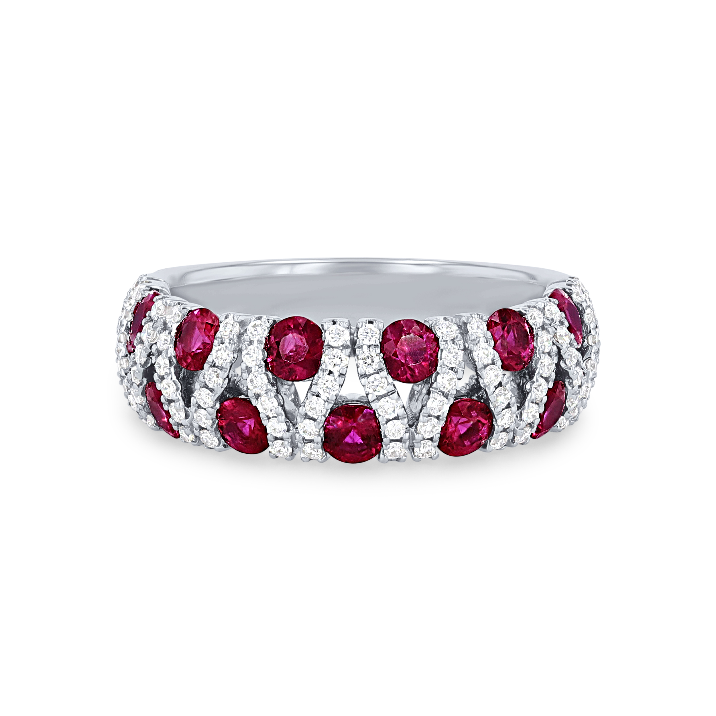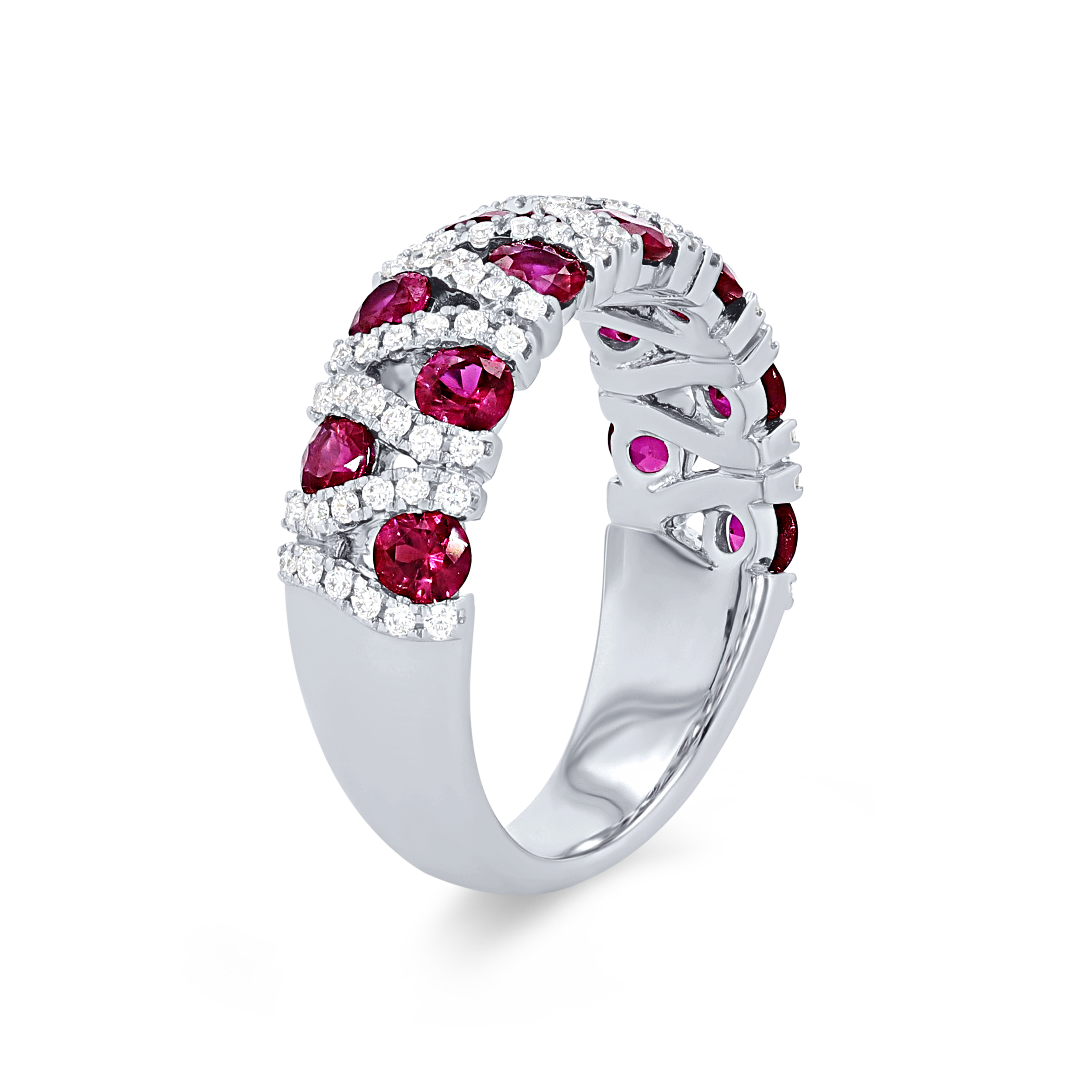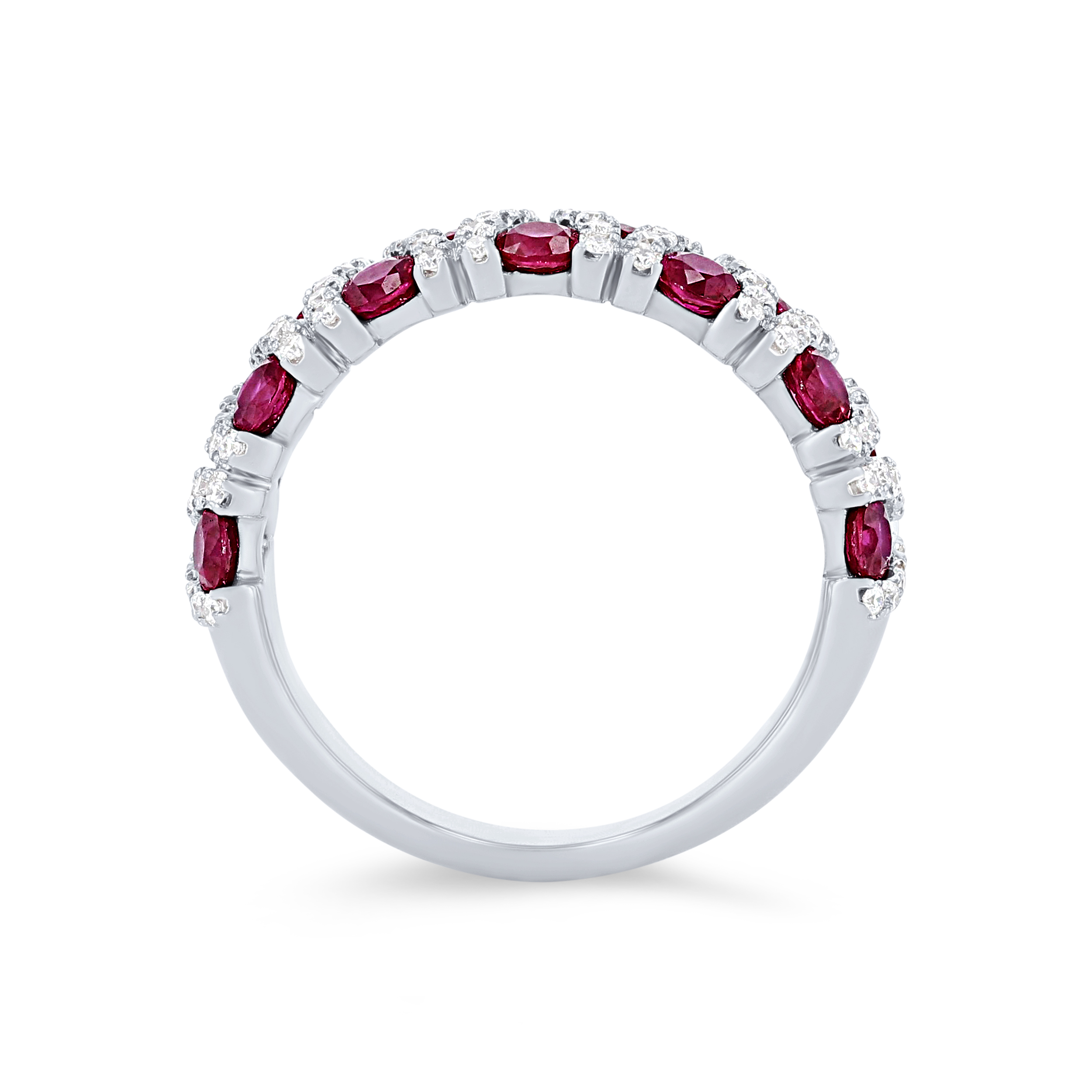 Product Description Offset rubies totaling 1.43 carats are separated by rows of diamond that total 0.42 carats to create a sparkling statement ring. Other Details Metal Color: White Gold Disable Reason: None Style: Contemporary Total Setting Diamond Carat Weight: 0.42TW Women Wedding Band Type: Gemstone Gemstone Type: Ruby Type: Ring Total Gemstone Carat Weight: 1.43TW