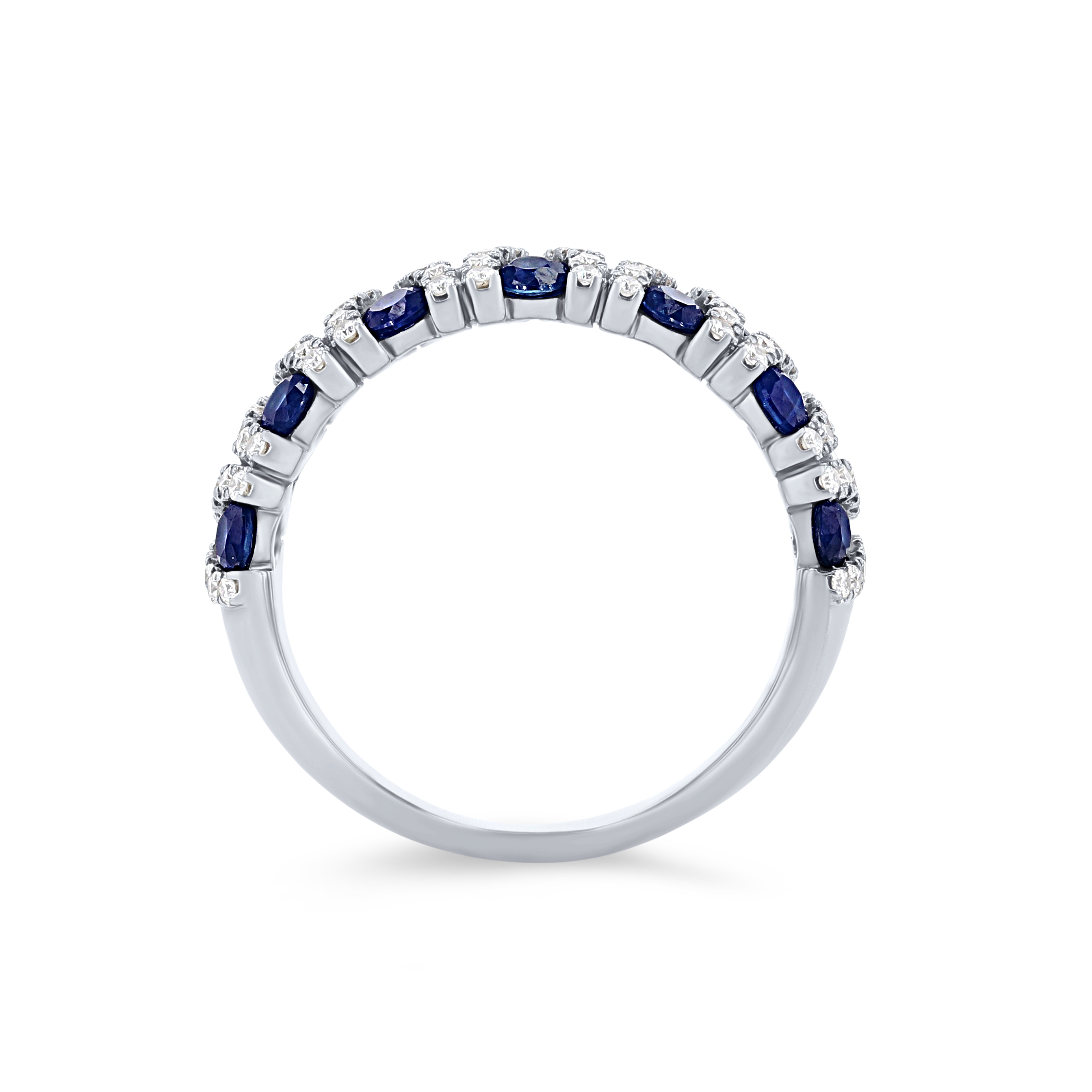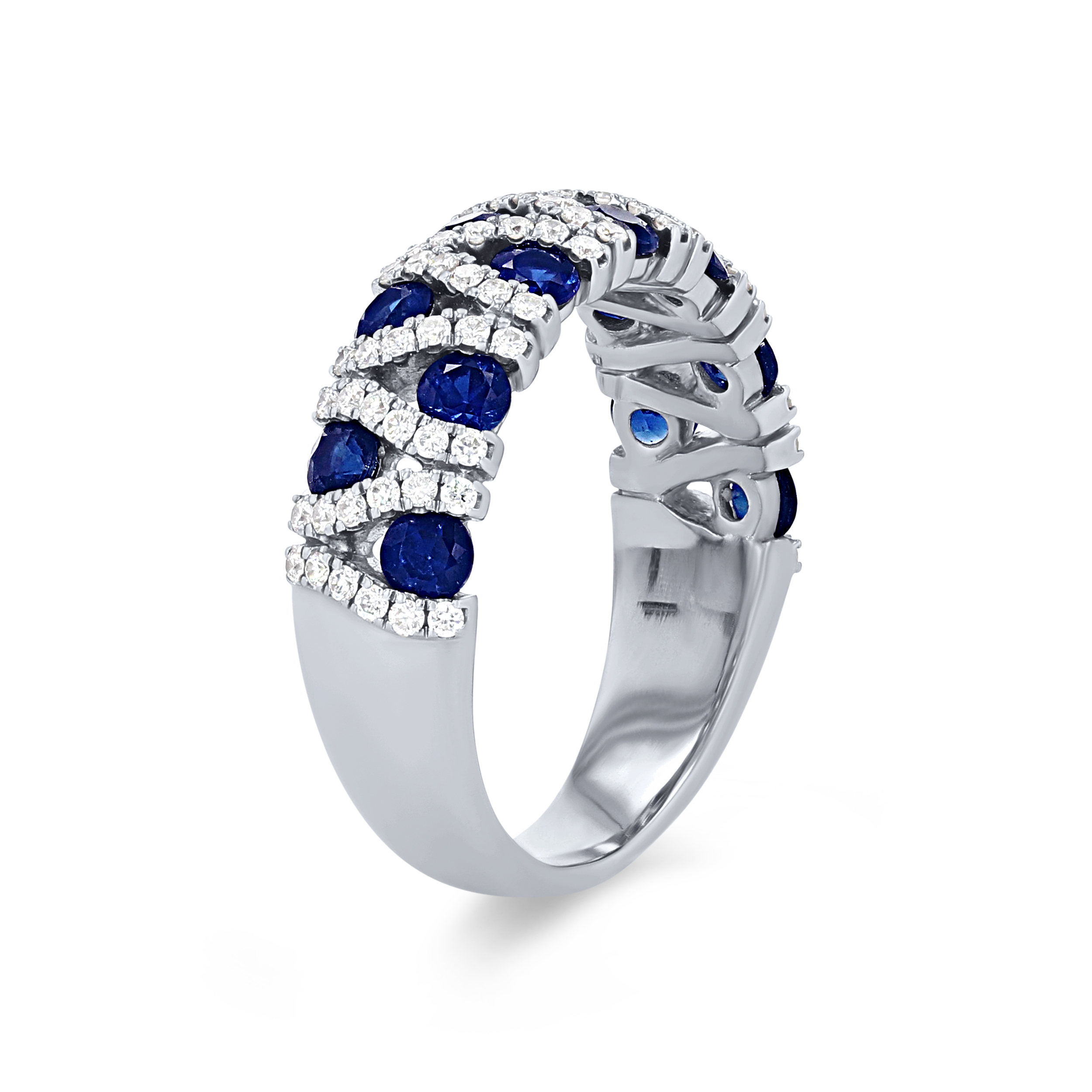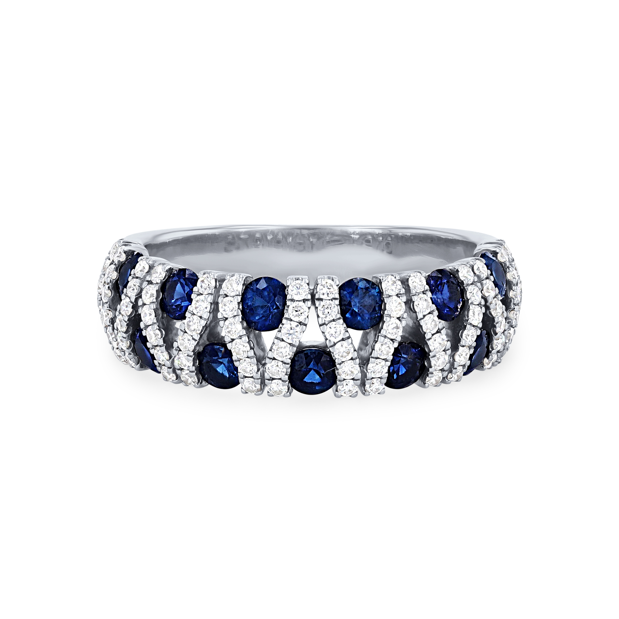 Product Description Offset blue sapphires totaling 1.43 carats are separated by rows of round brilliant cut diamonds that total 0.42 carats to create a sparkling statement ring. Other Details Gemstone Type: Sapphire Type: Ring Total Setting Diamond Carat Weight: 0.42TW Disable Reason: None Women Wedding Band Type: Gemstone Total Gemstone Carat Weight: 1.43TW Style: Contemporary Metal Color: White Gold