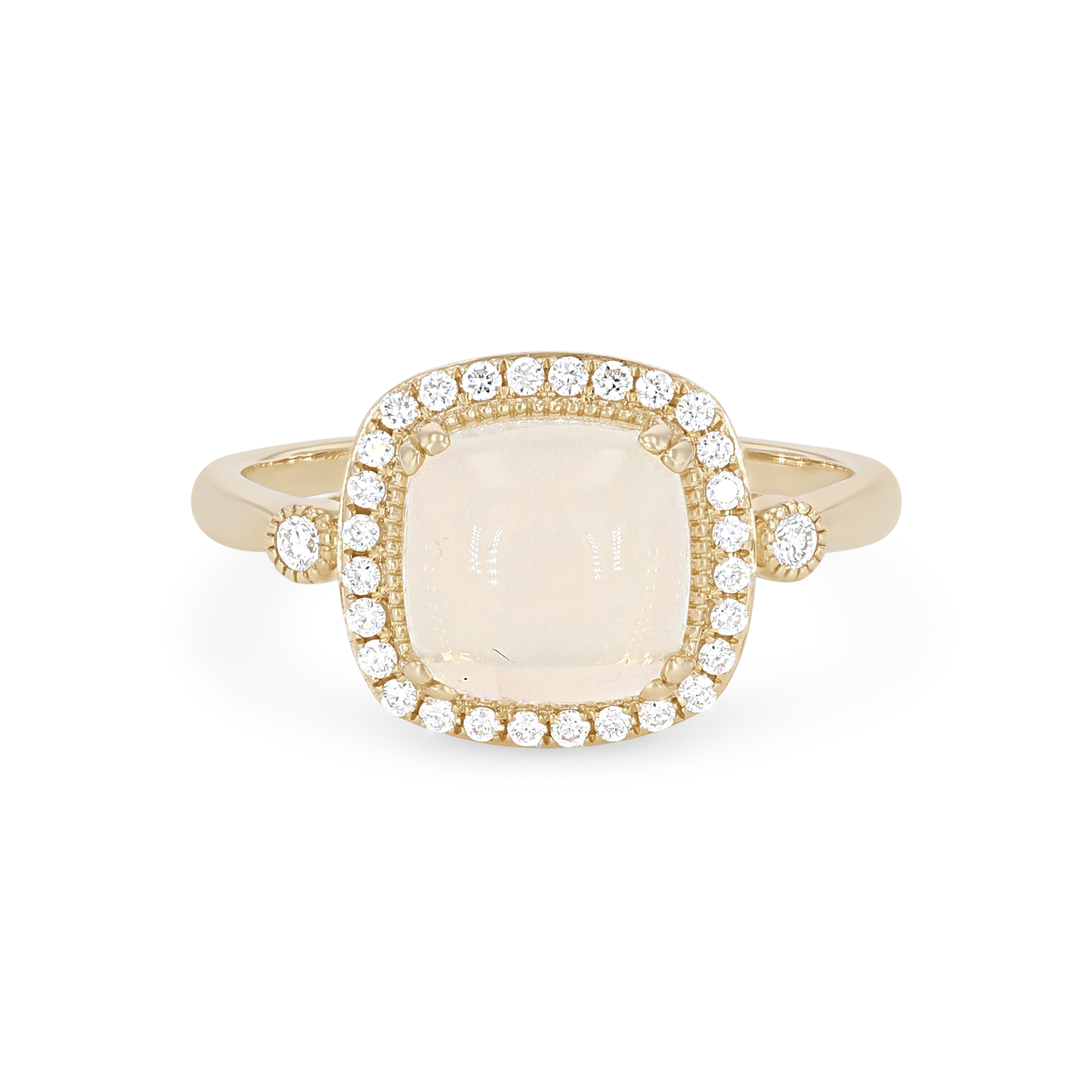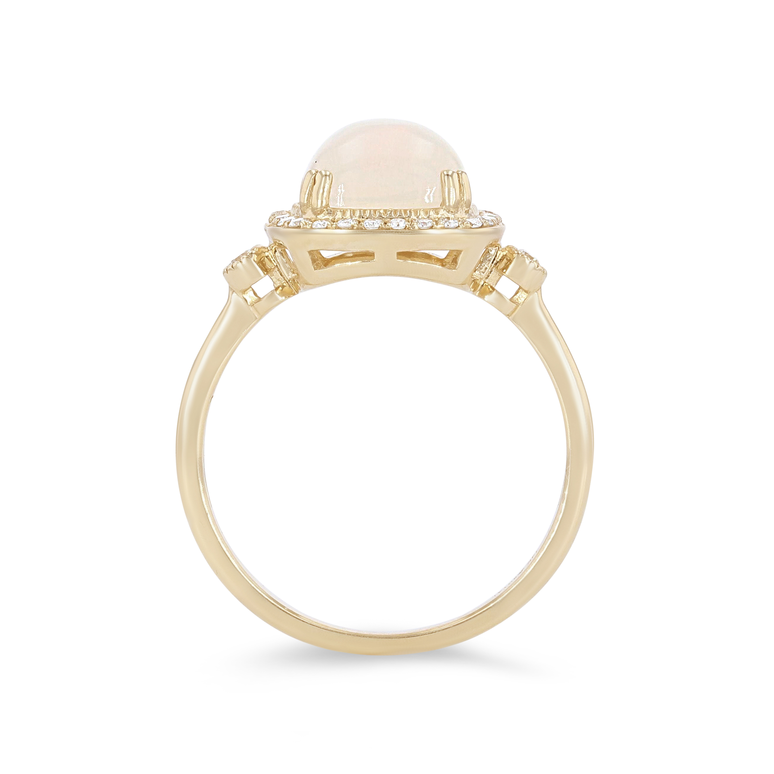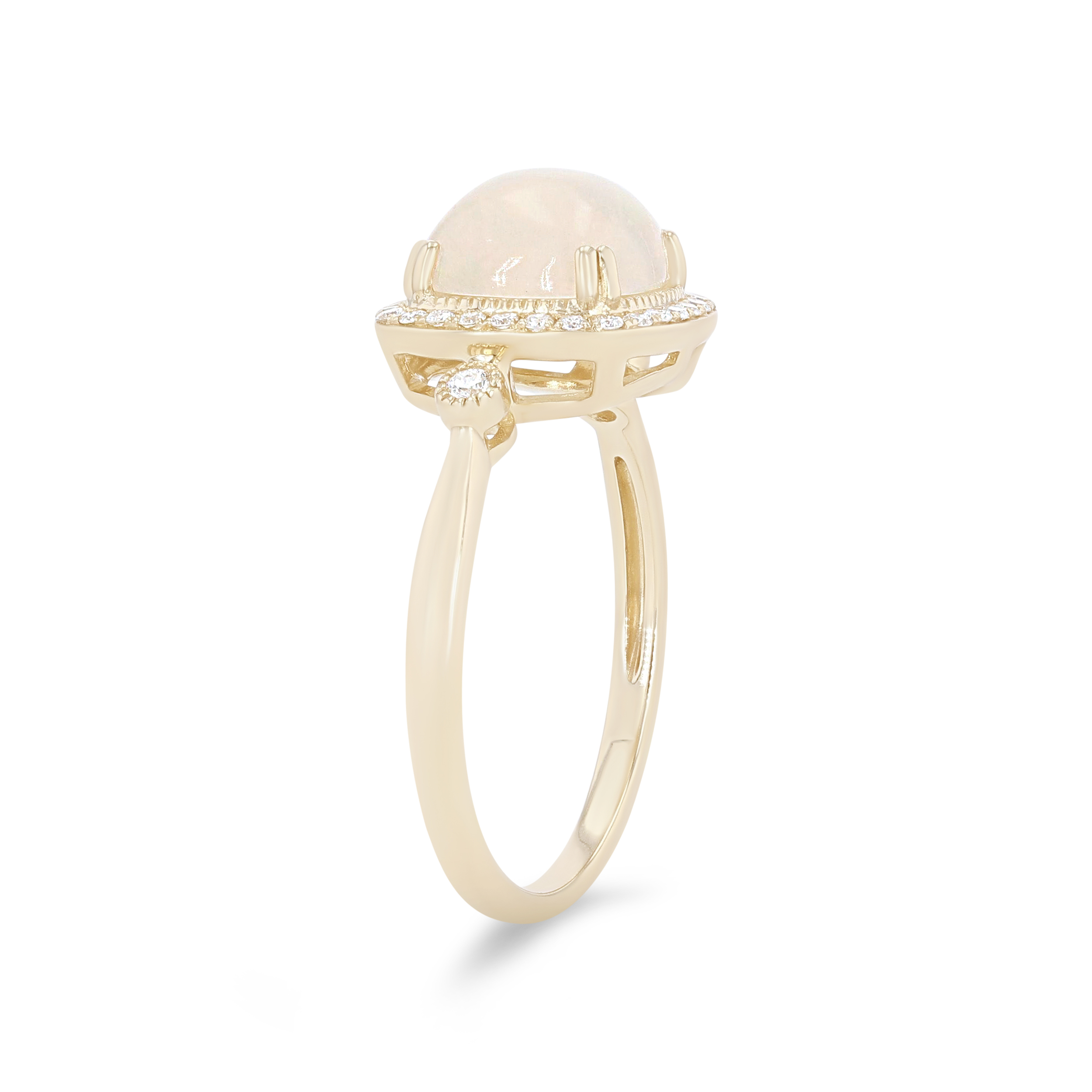 An enchanting opal weighing 1.40 carats is surrounded by a cushion halo of round brilliant cut diamonds totaling 0.18 carats.