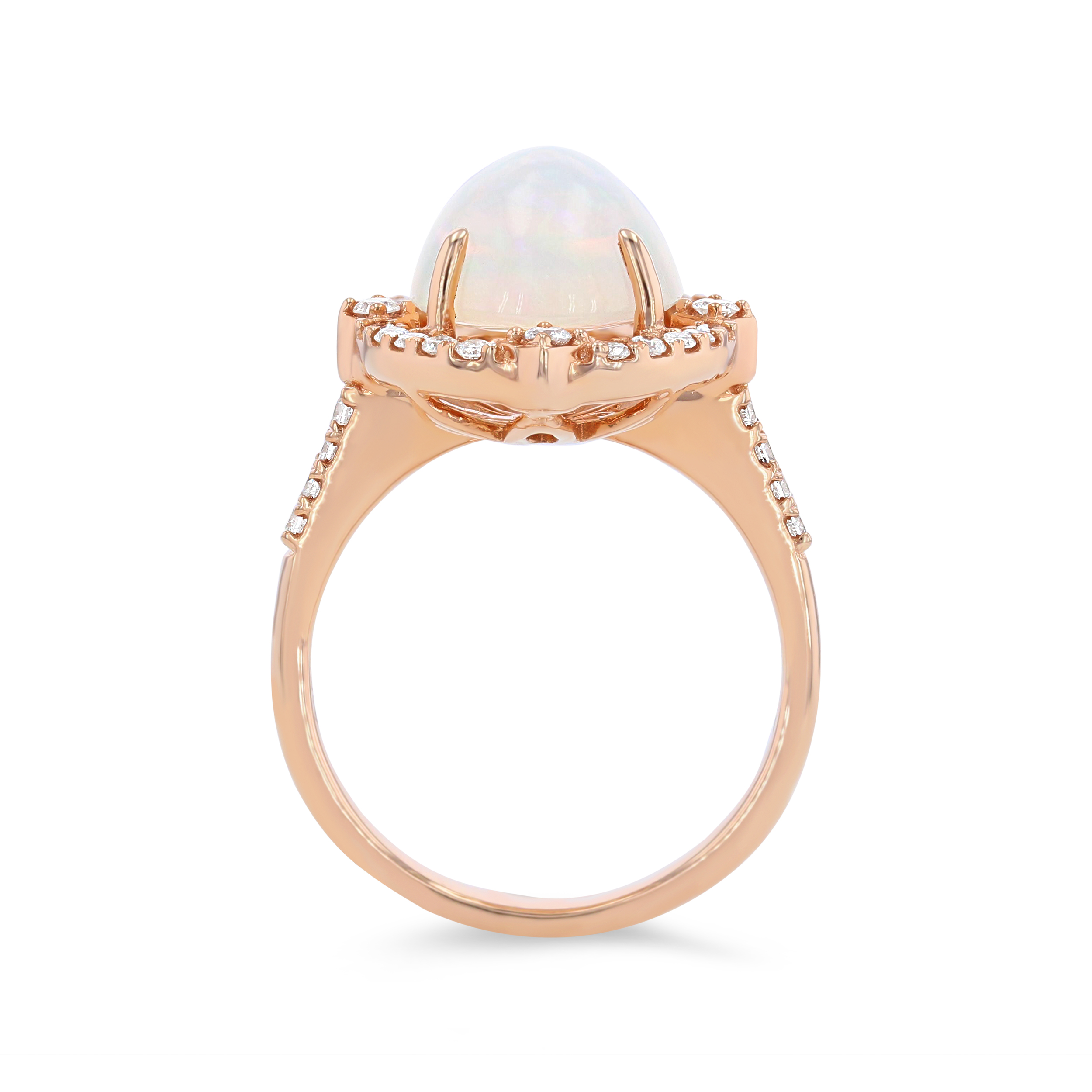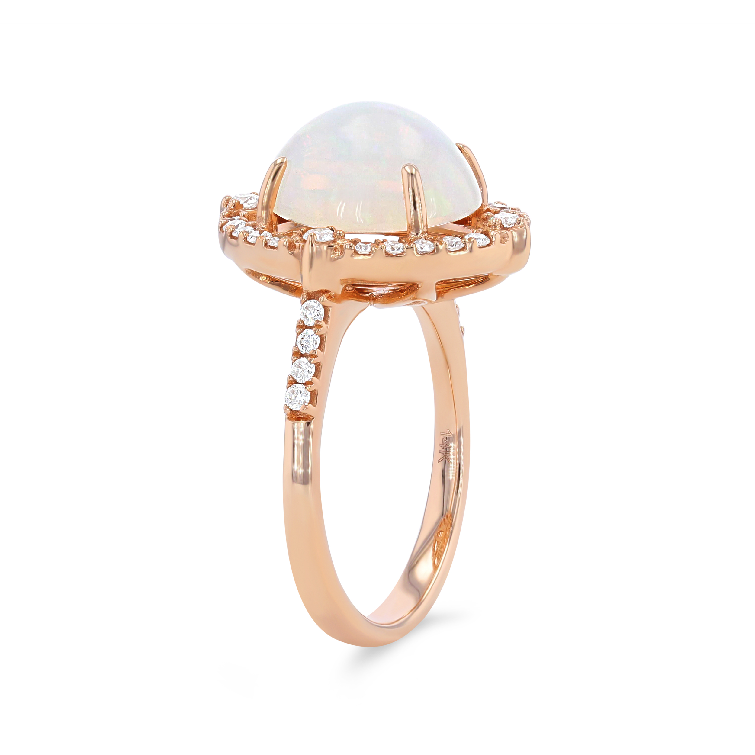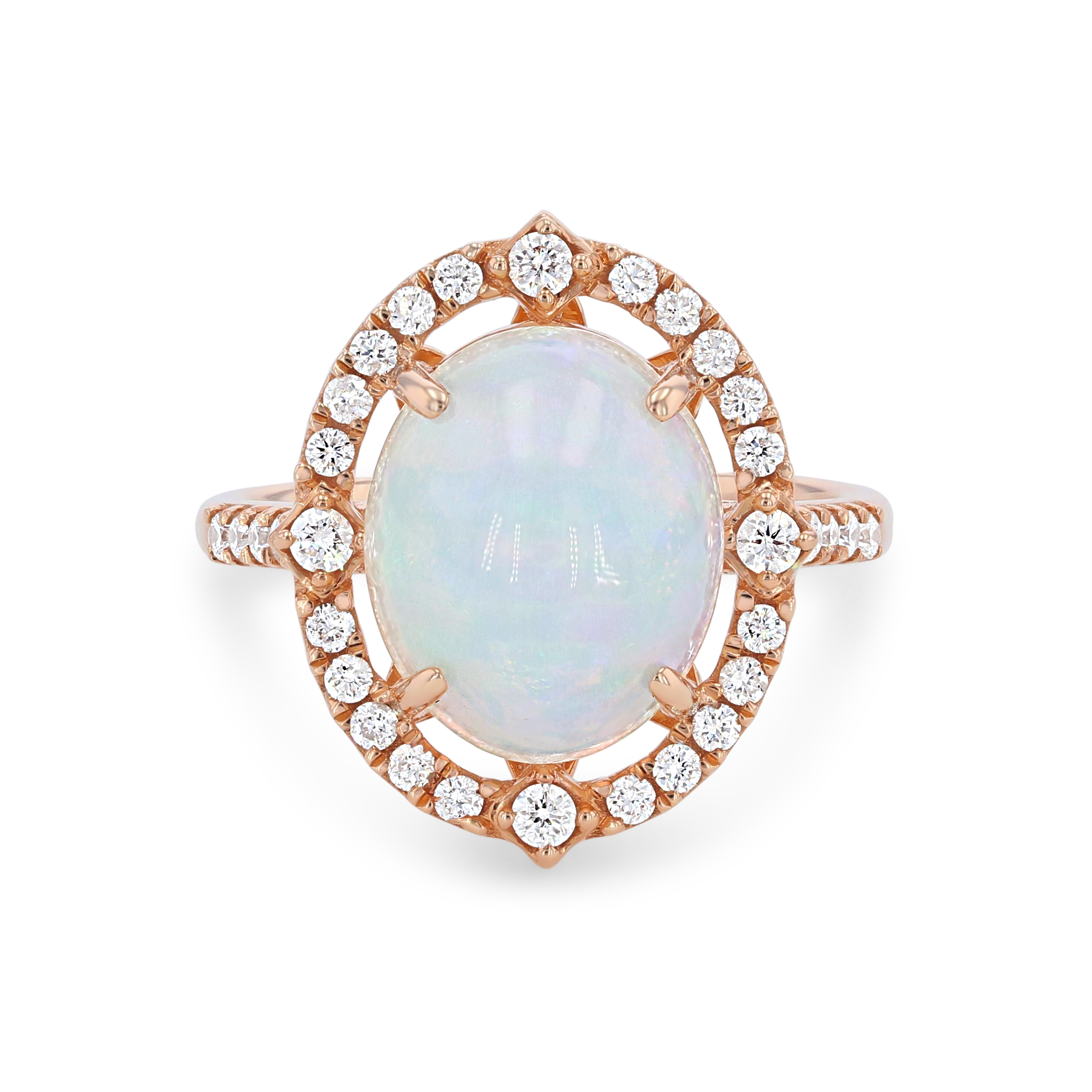 Product Description The perfect way to dress up any occasion, this ring features a 3.00 carat opal surrounded by a vintage-inspired halo of round brilliant cut diamonds totaling 0.33 carats. Other Details Disable Reason: None Style: Vintage Type: Ring Gemstone Type: Opal Metal Color: Rose Gold Total Gemstone Carat Weight: 3TW Women Wedding Band Type: Gemstone Total Setting Diamond Carat Weight: 0.33TW