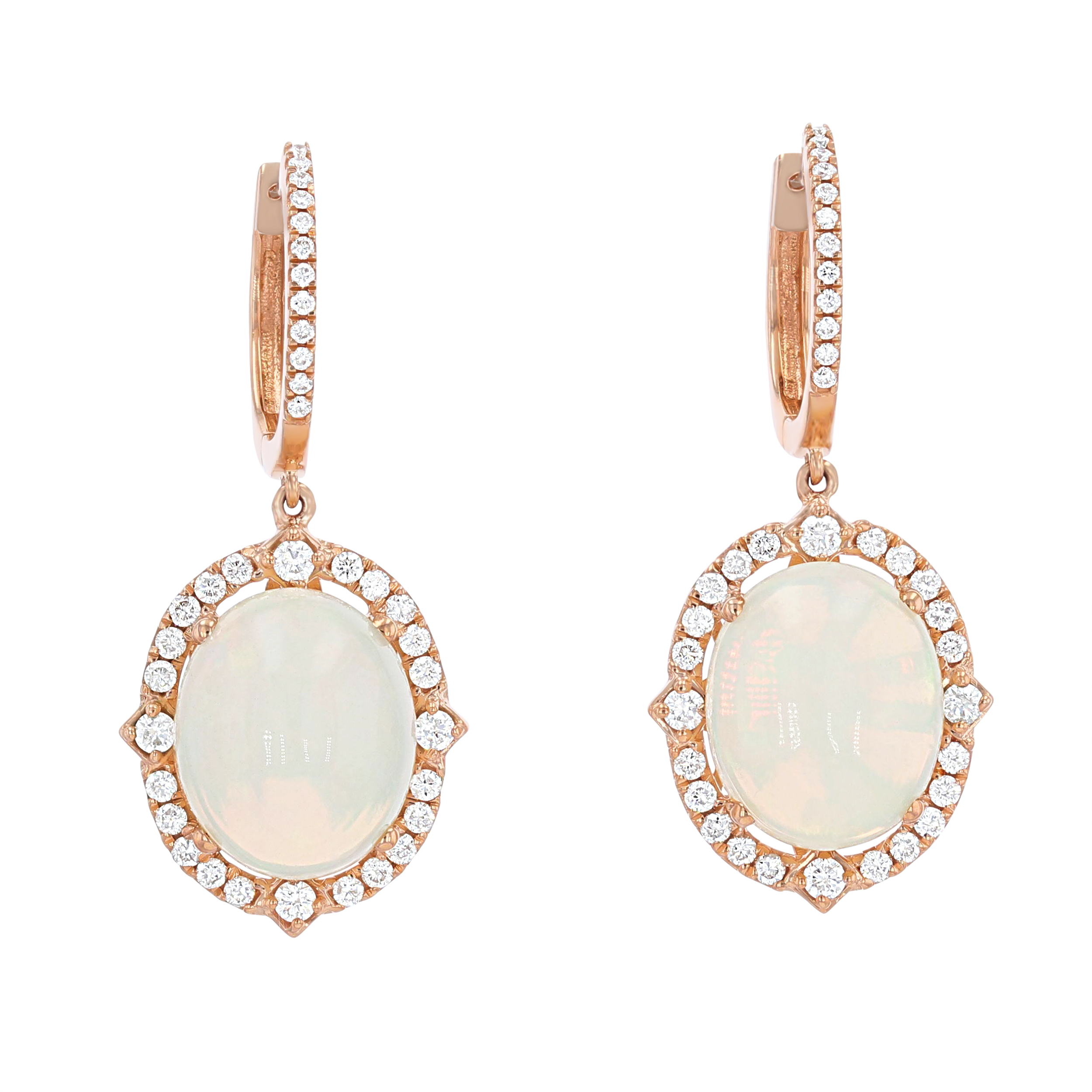 Product Description Make a statement with these gorgeous dangle earrings, featuring two opals totaling 6.00 carats surrounded by halos of round brilliant cut diamonds totaling 0.70 carats. Other Details Women Wedding Band Type: Gemstone Total Gemstone Carat Weight: 6TW Style: Vintage Earring Type: Gemstones Metal Color: Rose Gold Disable Reason: None Total Setting Diamond Carat Weight: 0.7TW Gemstone Type: Opal Type: Earrings