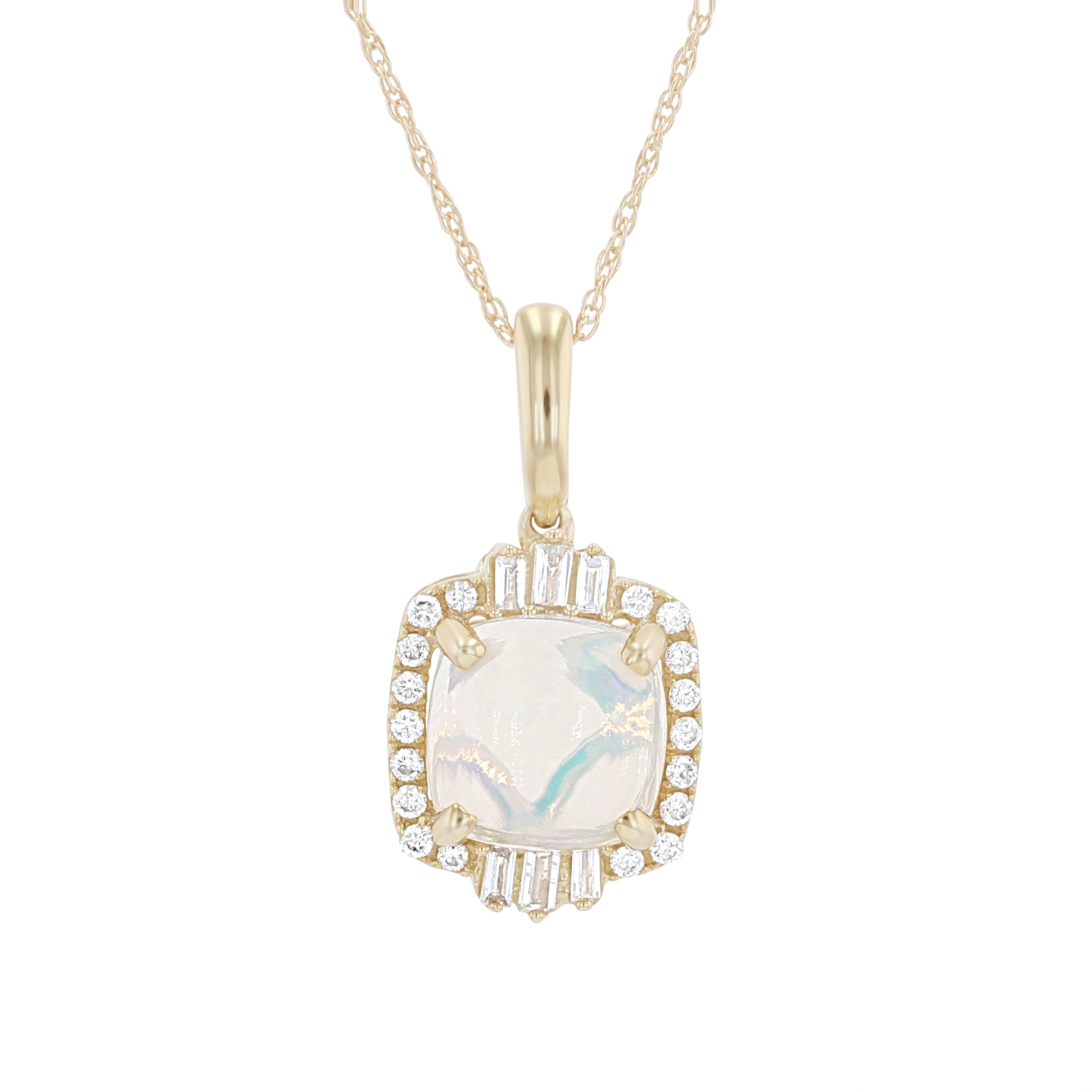 Accents of baguette cut diamonds among round brilliant cut diamonds totaling 0.18 carats in the halo create a beautiful vintage design, emphasizing the 1.40 carat opal.